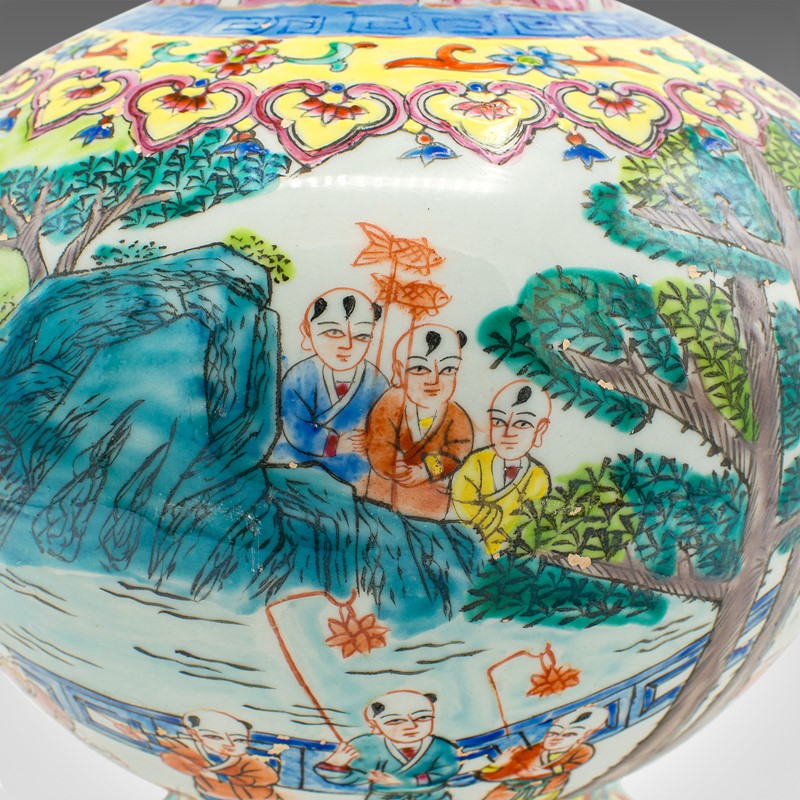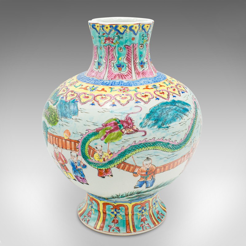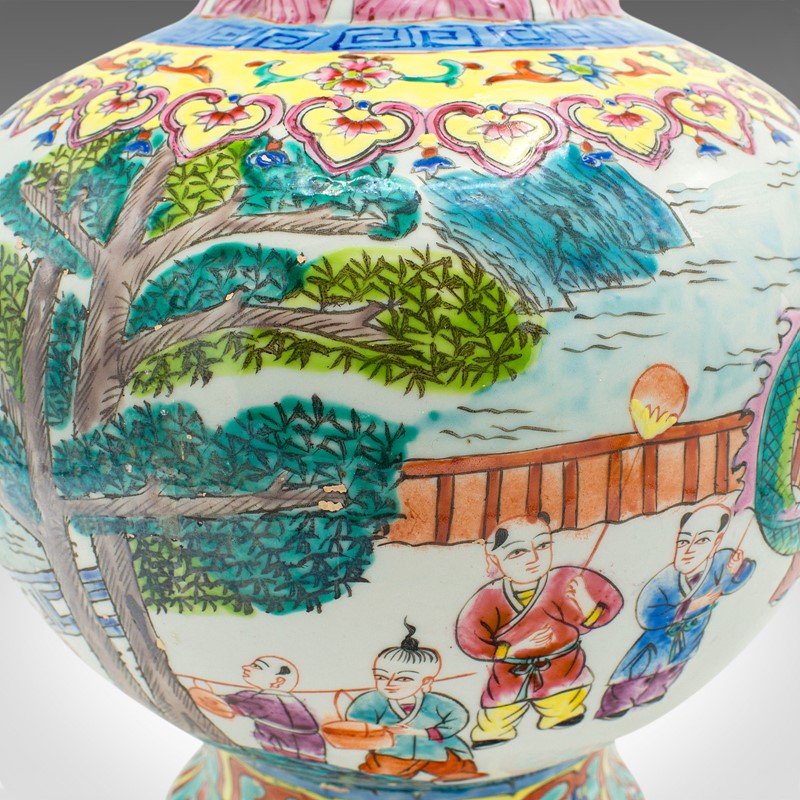 Vintage Oriental Baluster Vase, Chinese Ceramic Flower Urn, Polychrome, Art Deco