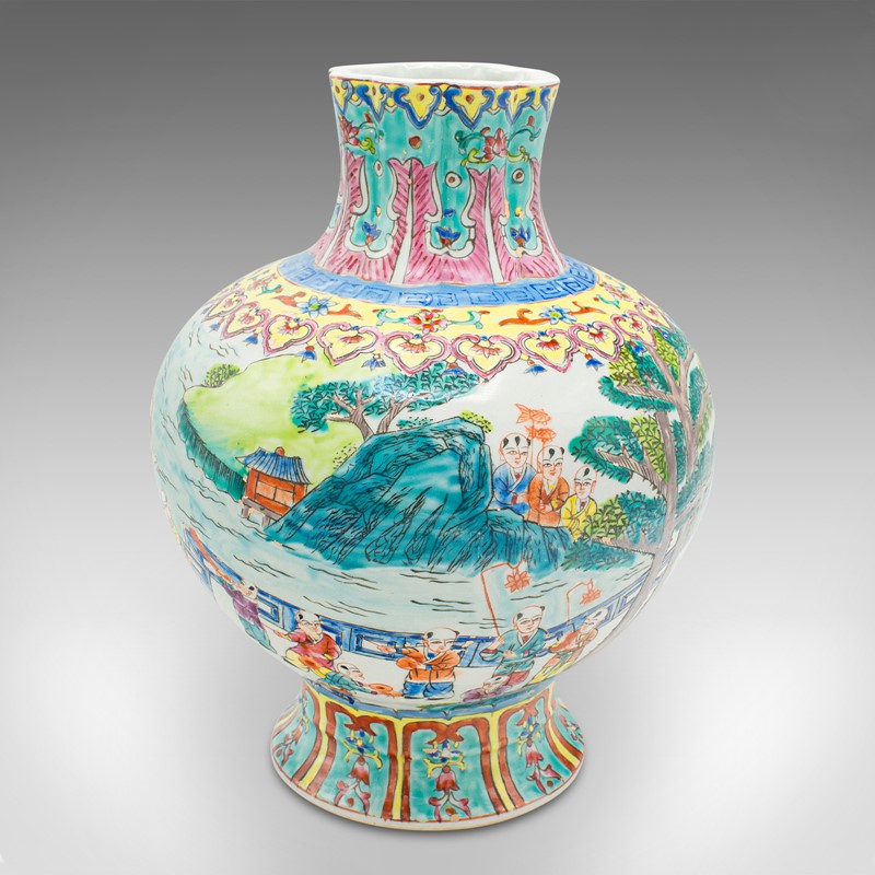 This is a vintage Oriental baluster vase. A Chinese, ceramic flower urn with polychrome enamel finish, dating to the late Art Deco period, circa 1940.