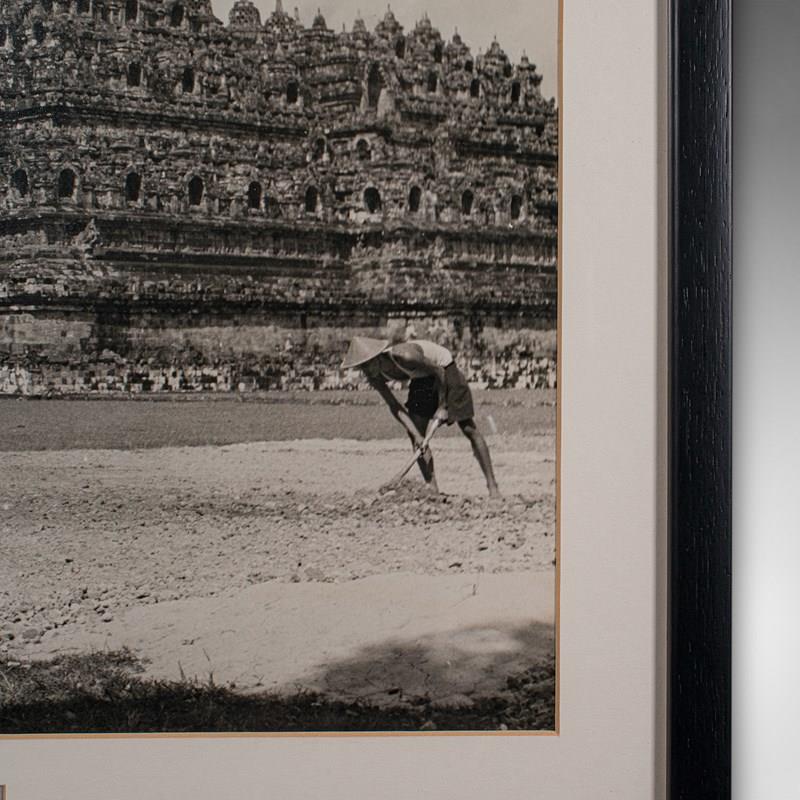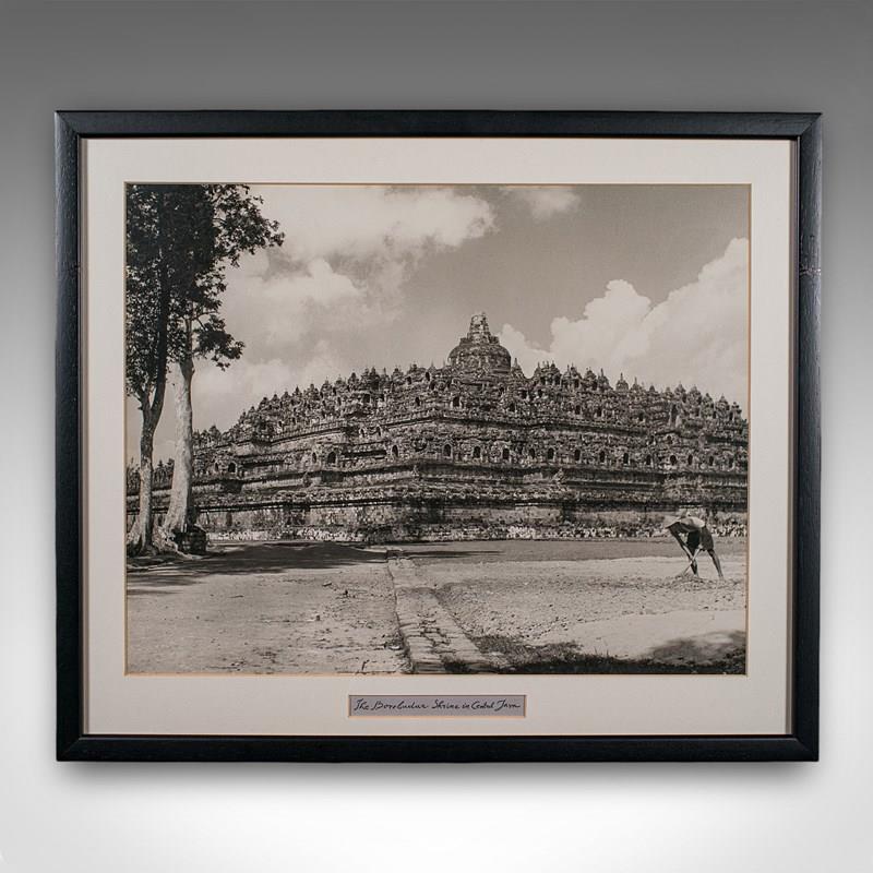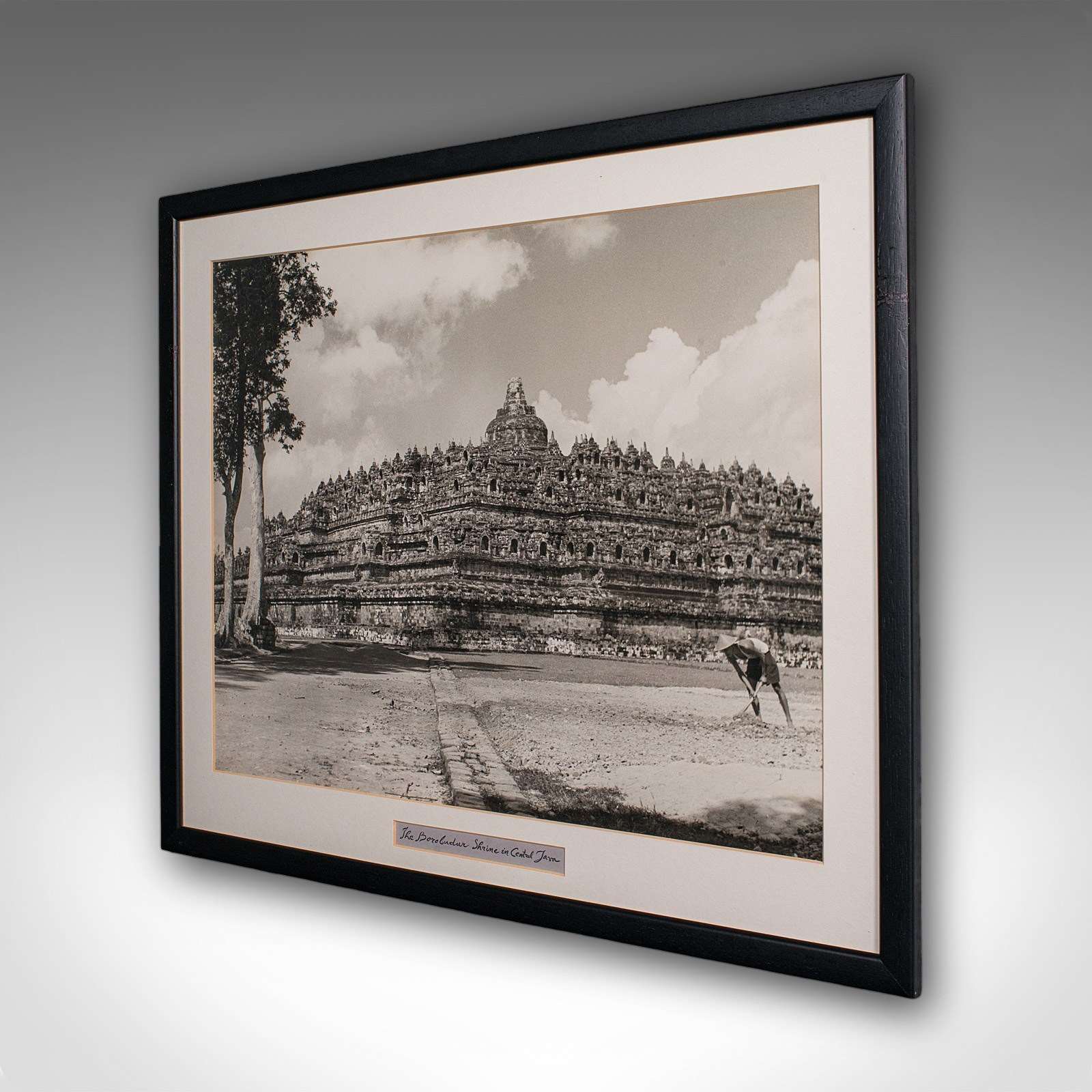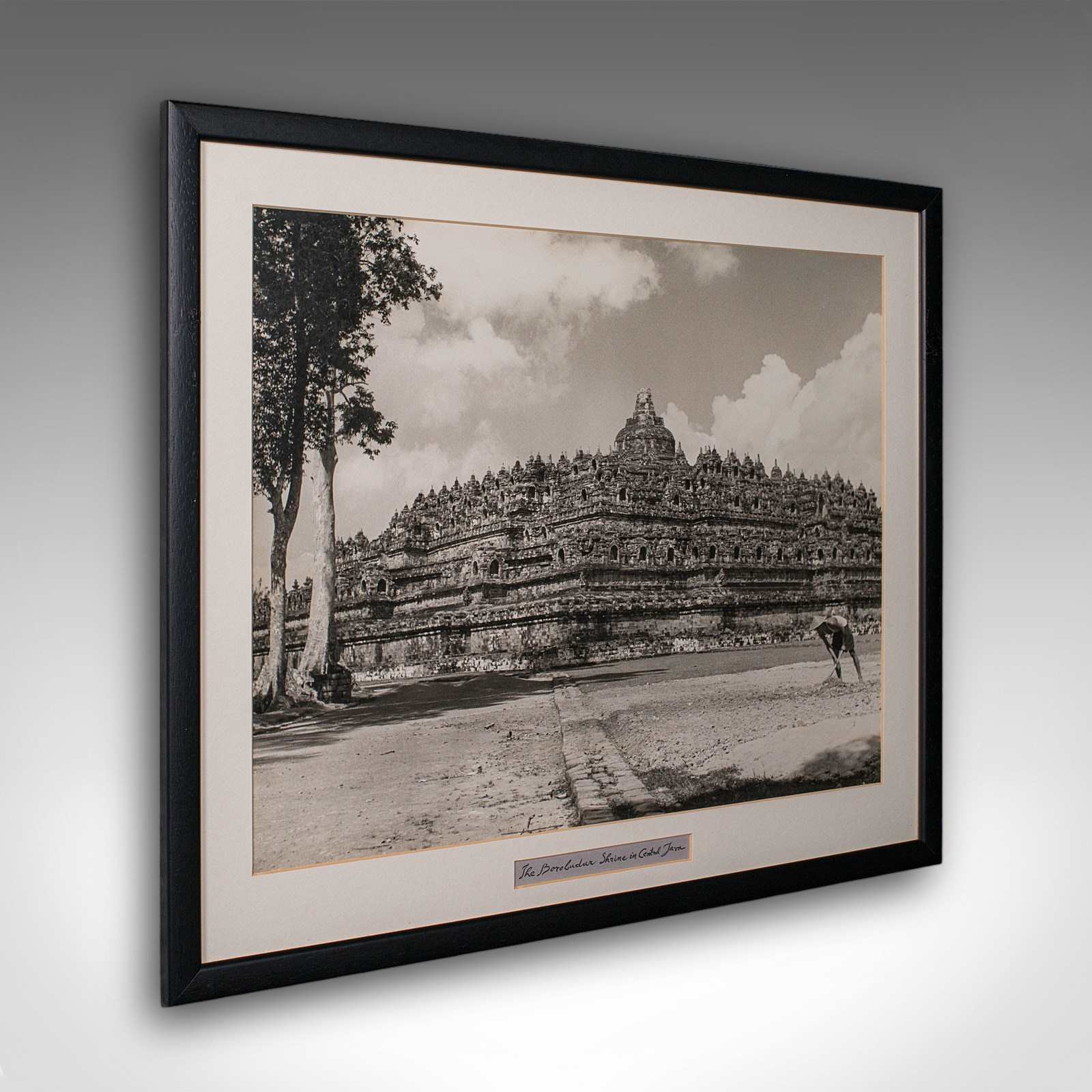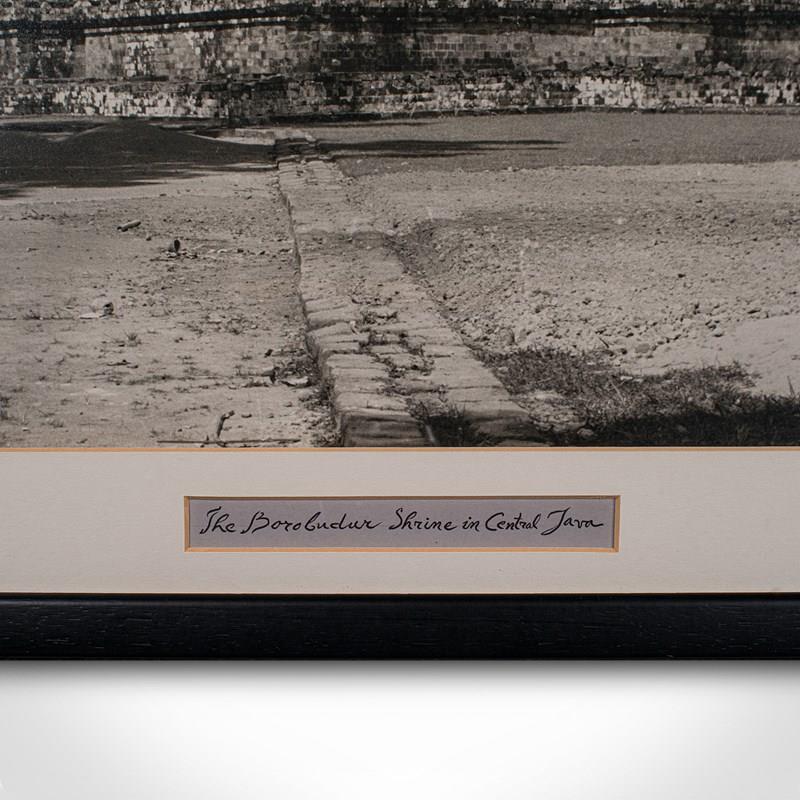 This is a vintage monochrome photograph of Borobudur Shrine. An Oriental, framed large format black & white print, dating to the mid 20th century, circa 1950.