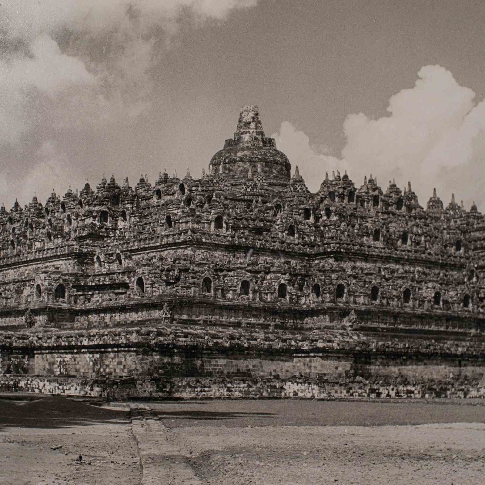 Captures the Indonesian Borobudur Shrine in beautiful monochrome