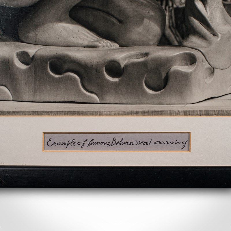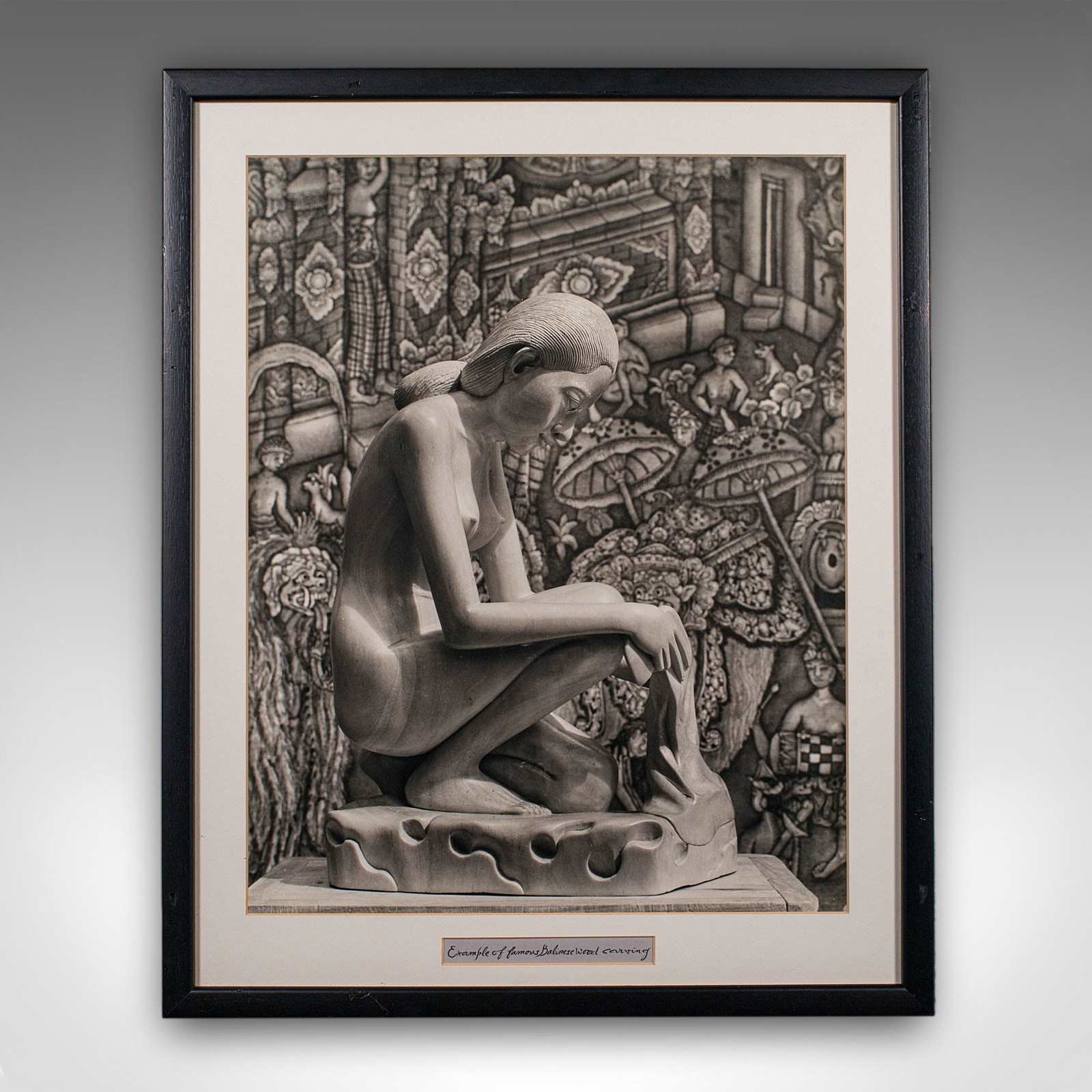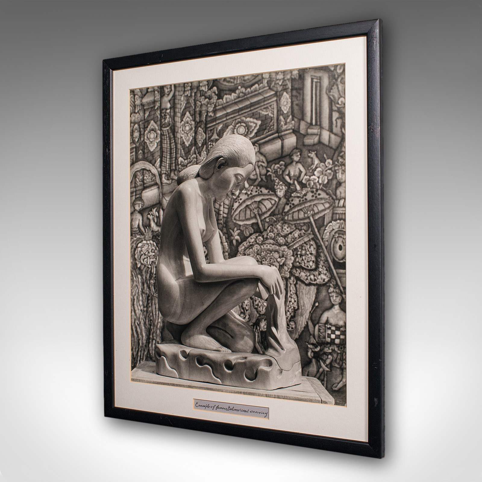 This is a vintage monochrome photograph of Balinese wood carving. An Oriental, framed large format black & white still life print, dating to the mid 20th century, circa 1950.