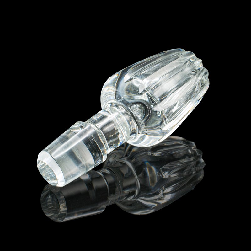 Ridged glass stopper sits neatly within the flared rim, offering a precise fit