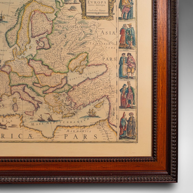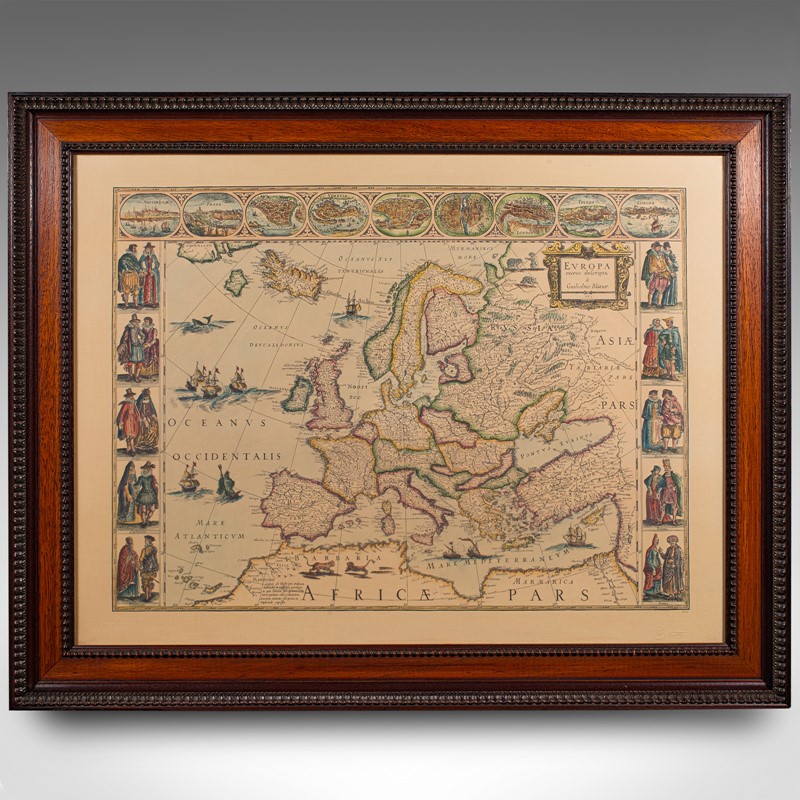 This is a vintage reproduction map of Europe. An American, paper stock cartography print in frame after the work by Blaeuw, dating to the late 20th century, circa 1970.
