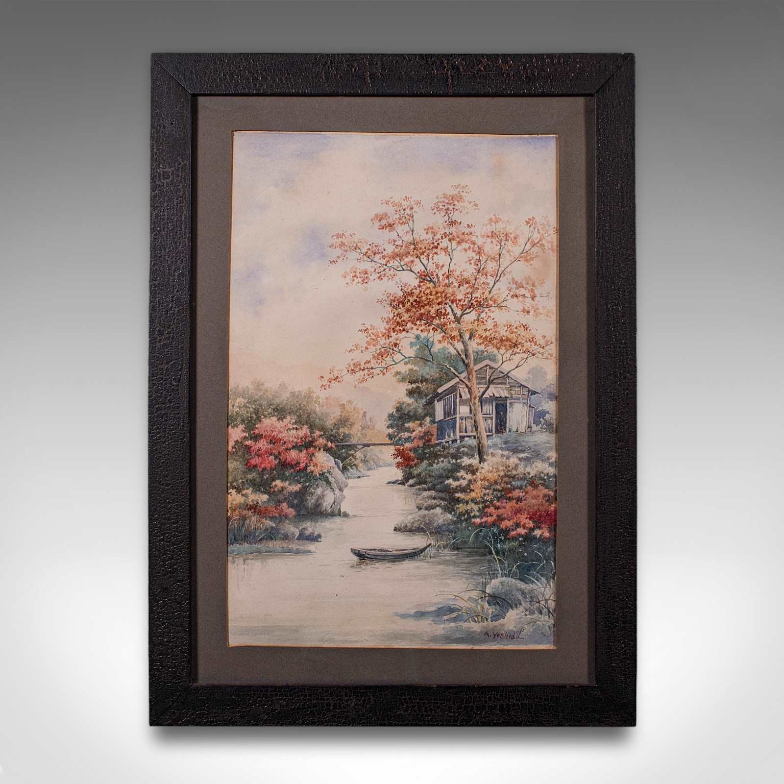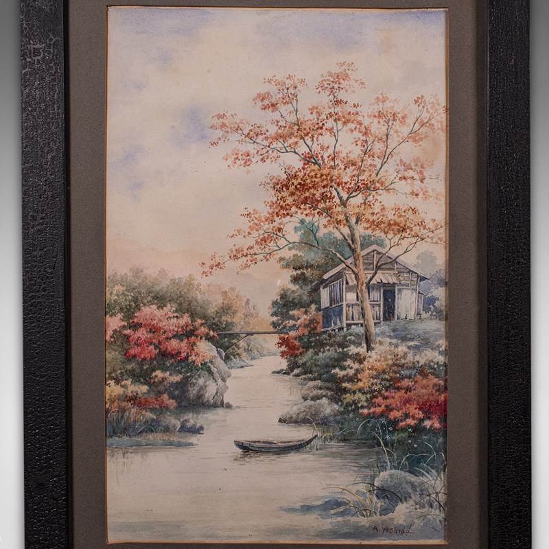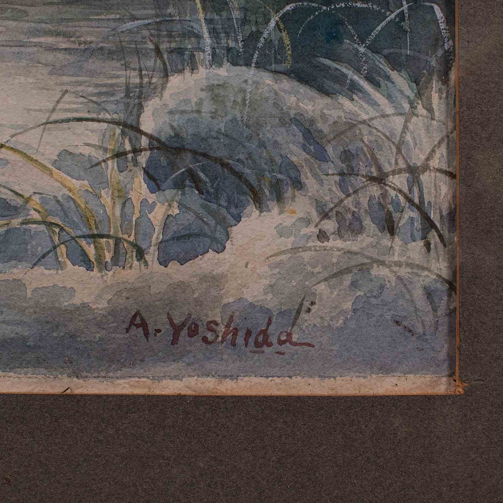 This is a vintage river landscape painting. A Japanese School watercolour, signed by the artist A. Yoshida, dating to the mid 20th century, circa 1950.