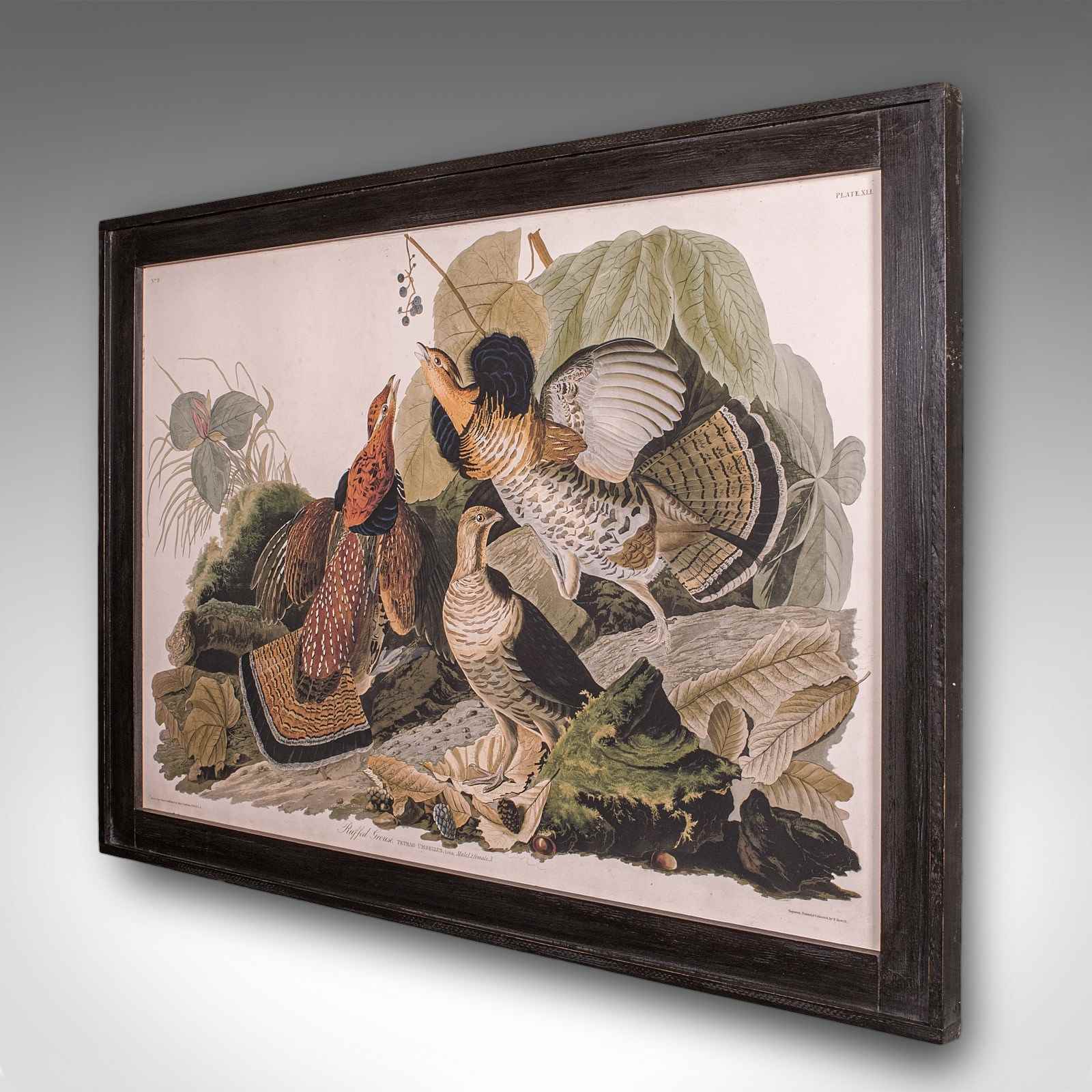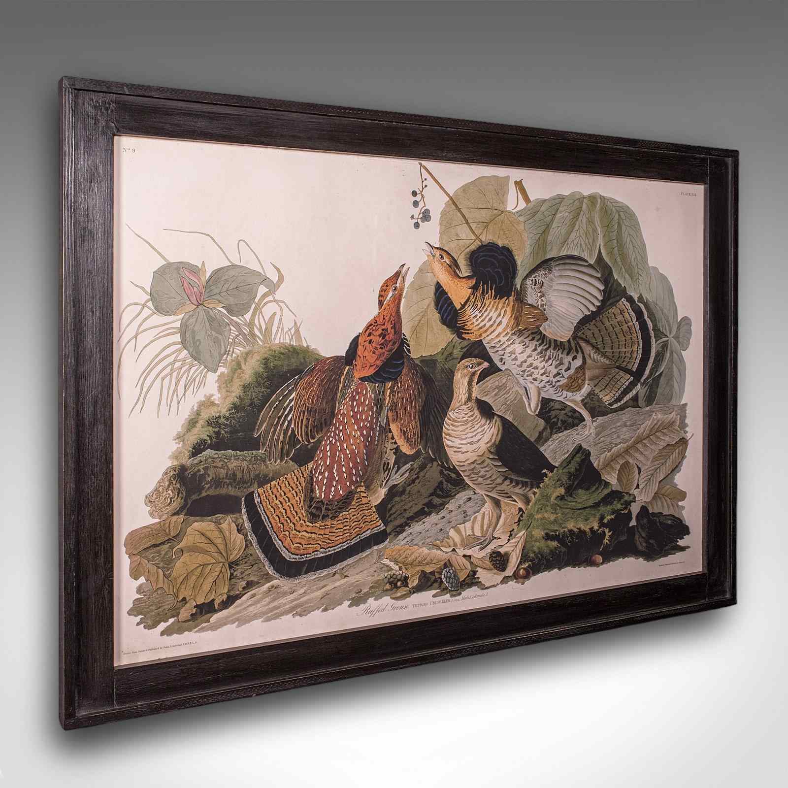 This is a large vintage Ruffed Grouse picture. An English, framed print engraving of wildlife interest originally by J.J. Audubon (1785 - 1851), dating to the mid 20th century, circa 1960.