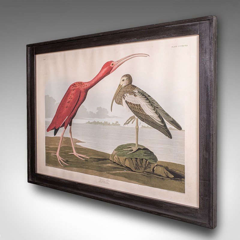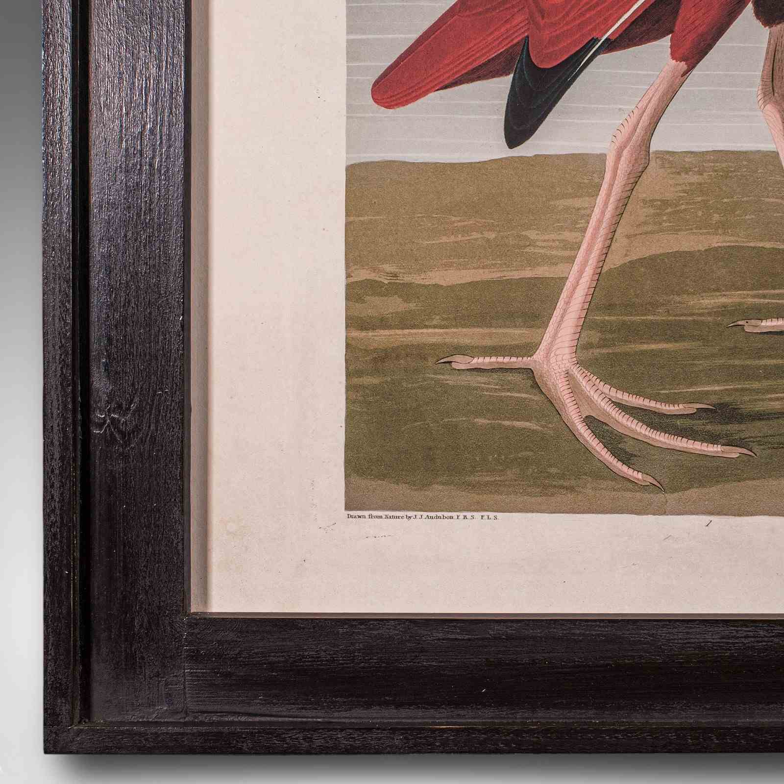 This is a large vintage Scarlet Ibis picture. An English, framed print engraving of wildlife interest originally by J.J. Audubon (1785 - 1851), dating to the mid 20th century, circa 1960.
