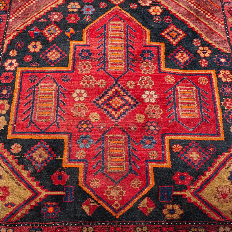 This is a vintage Shiraz decorative rug. A Persian, woven hall or lounge carpet, dating to the mid 20th century, circa 1940.