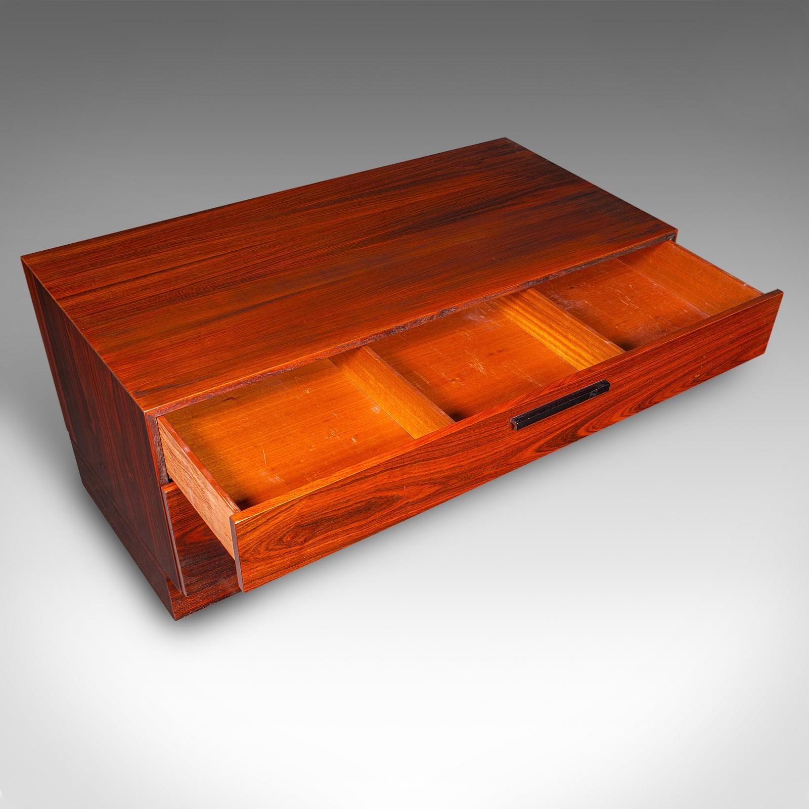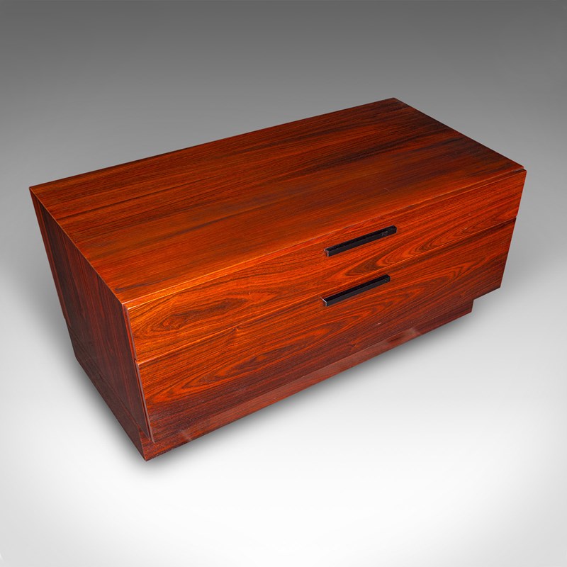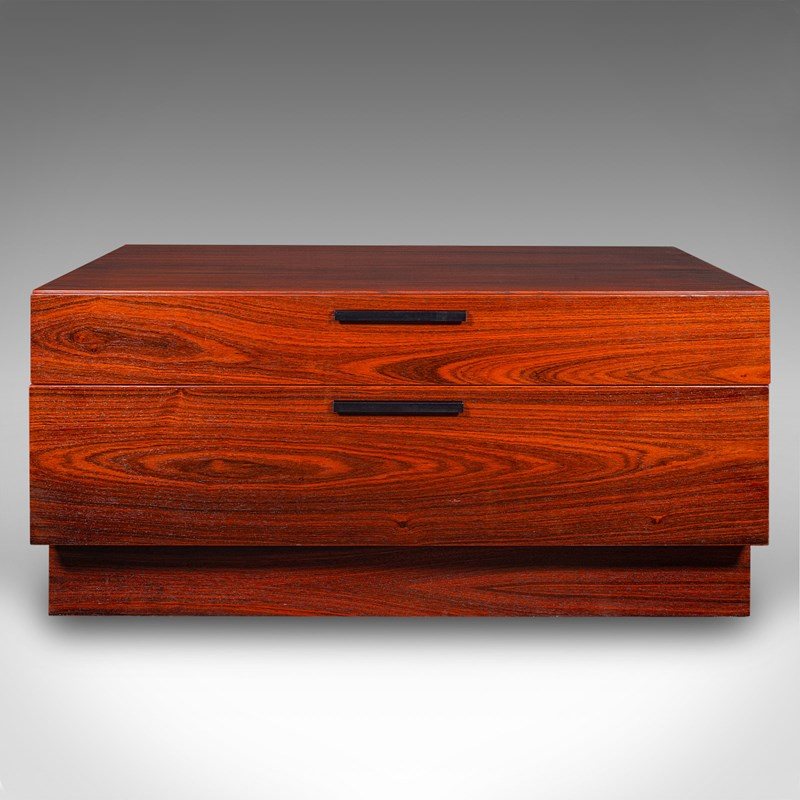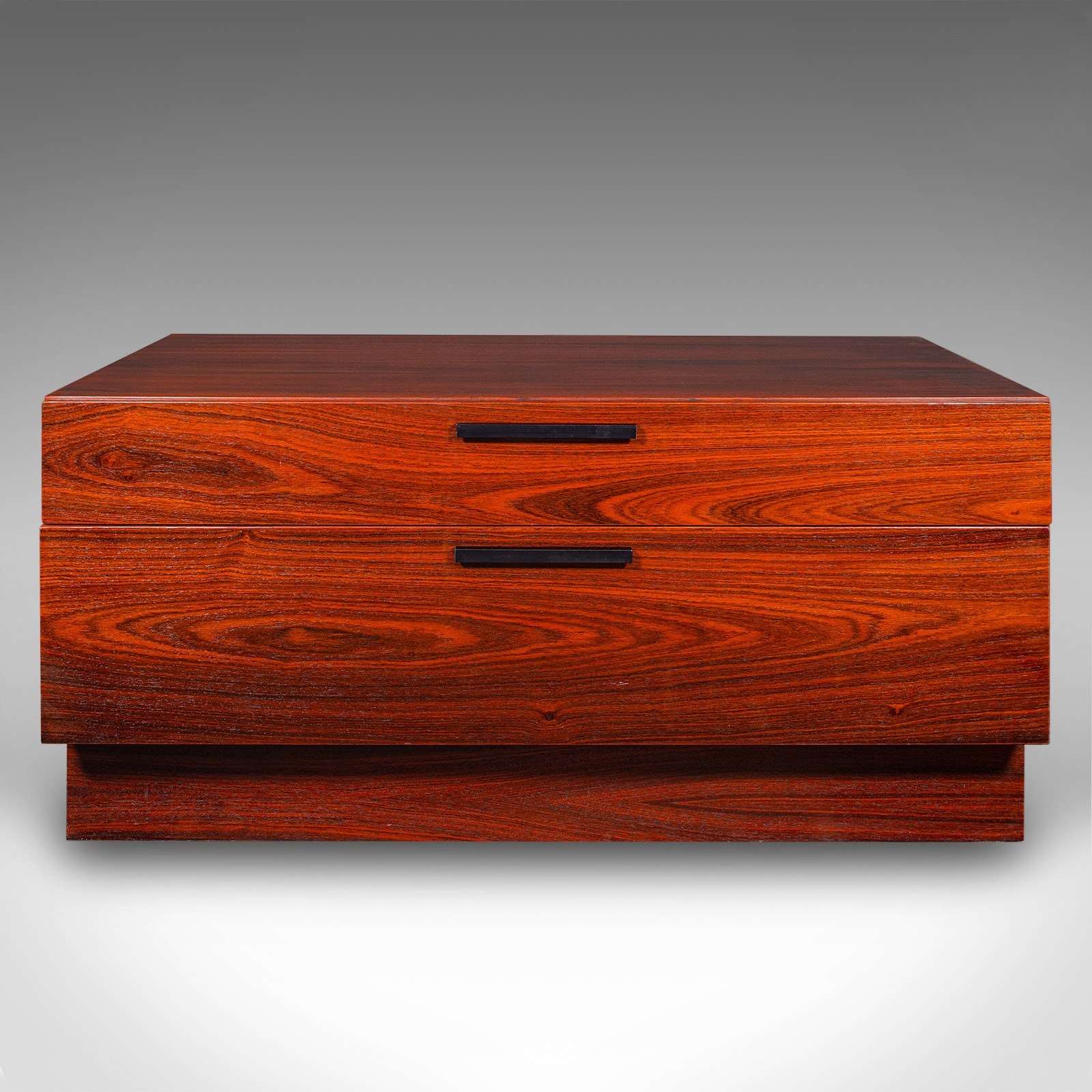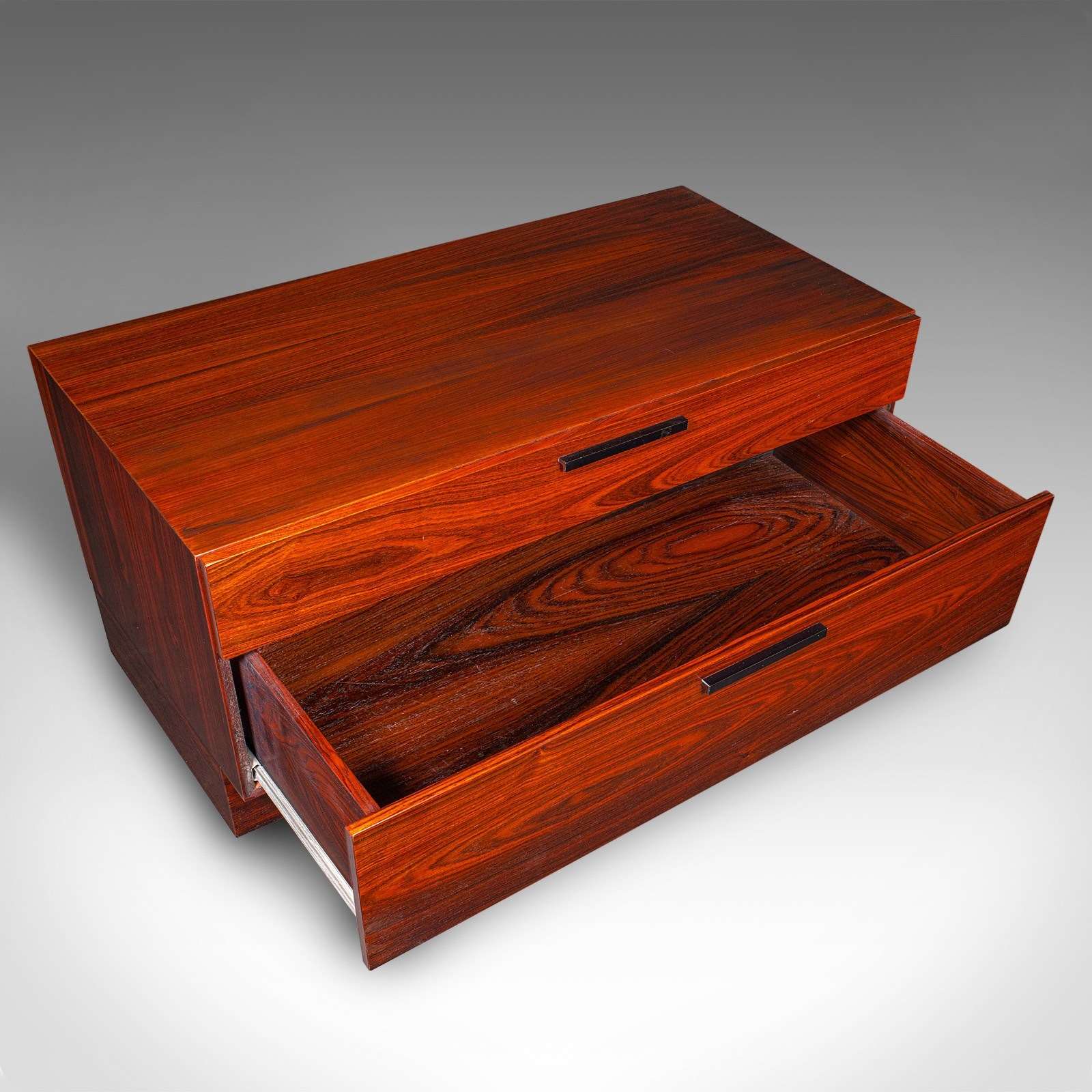 This is a large vintage turntable display stand. A Danish, rosewood media or hifi cabinet with storage drawers by Ib Kofod Larsen for Faarup Møbelfabrik, dating to the mid 20th century, circa 1960