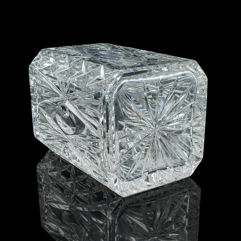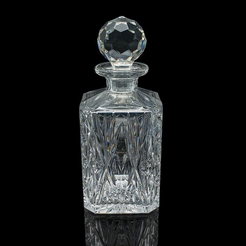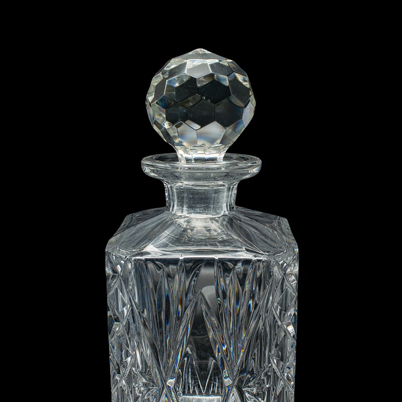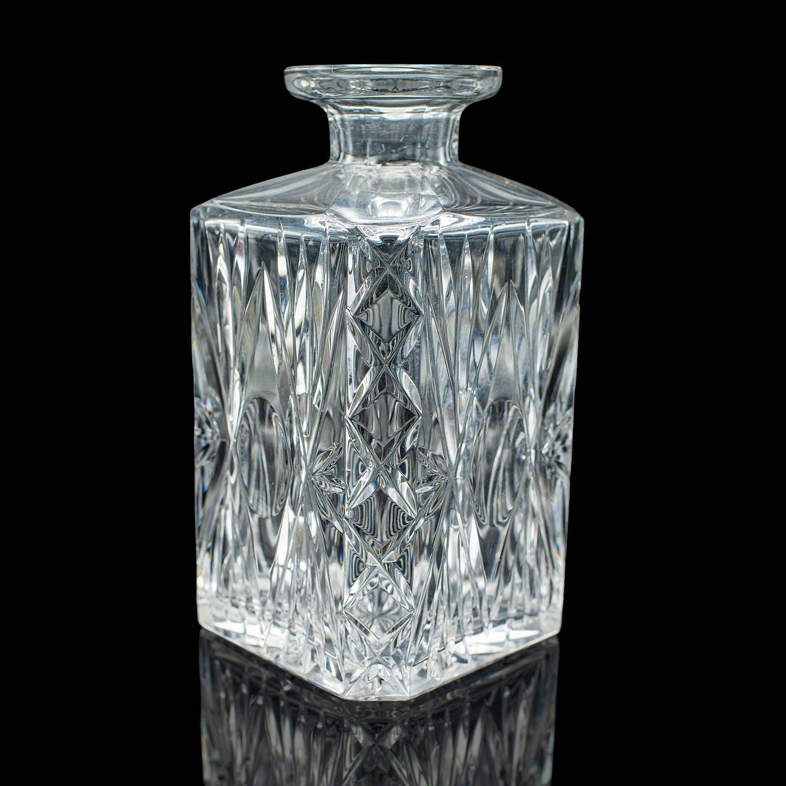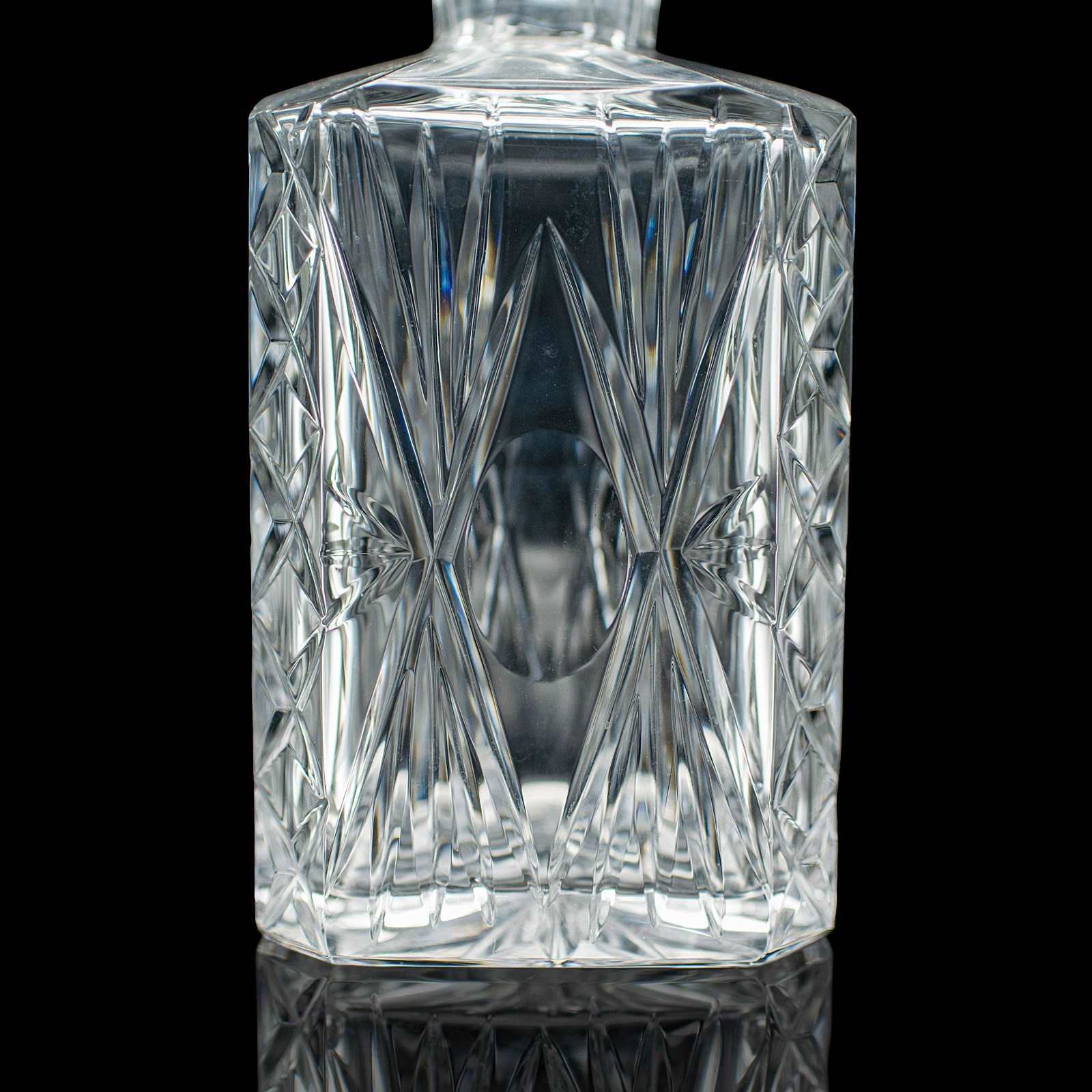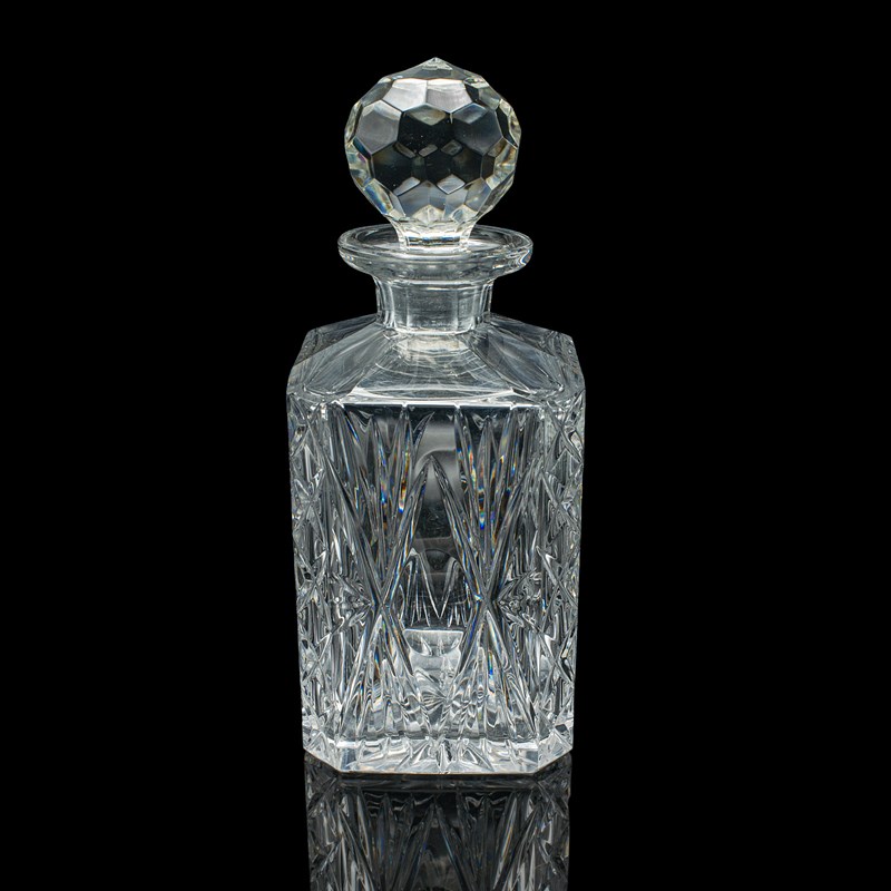 This is a vintage whiskey decanter. An English, cut crystal glass Scotch bottle, dating to the early 20th century, circa 1930. A handsome and tactile example, with bright finish and classic cut detail, ideal for the presentation of fine spirits.