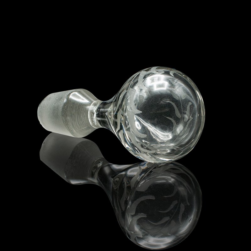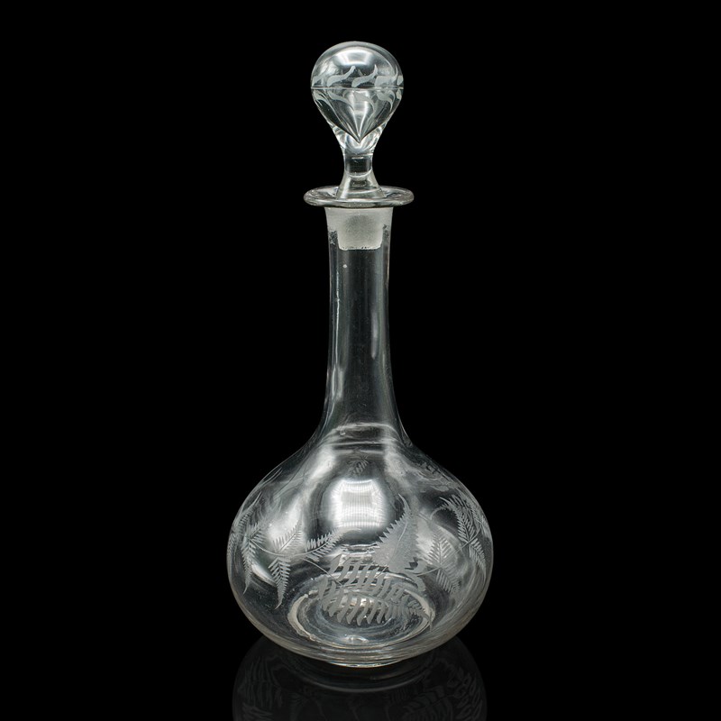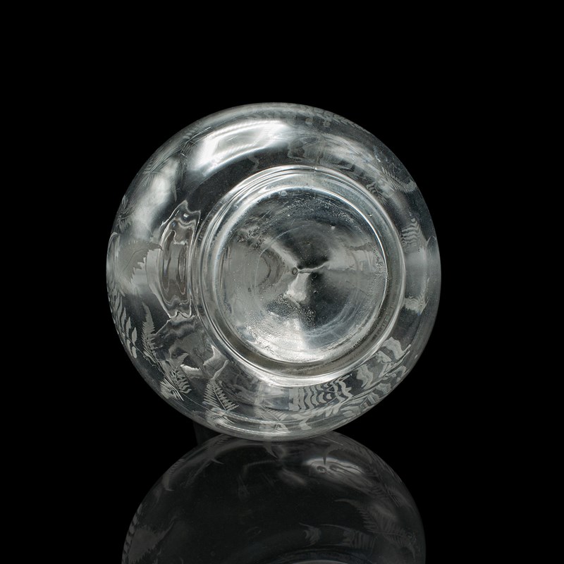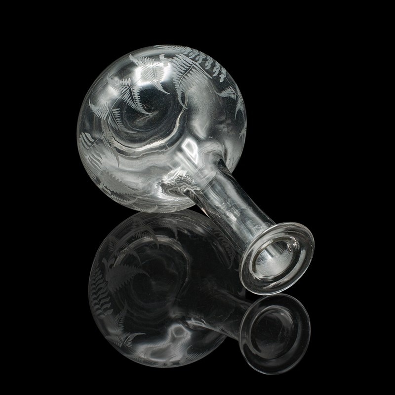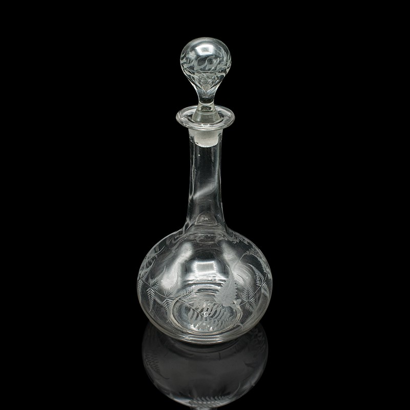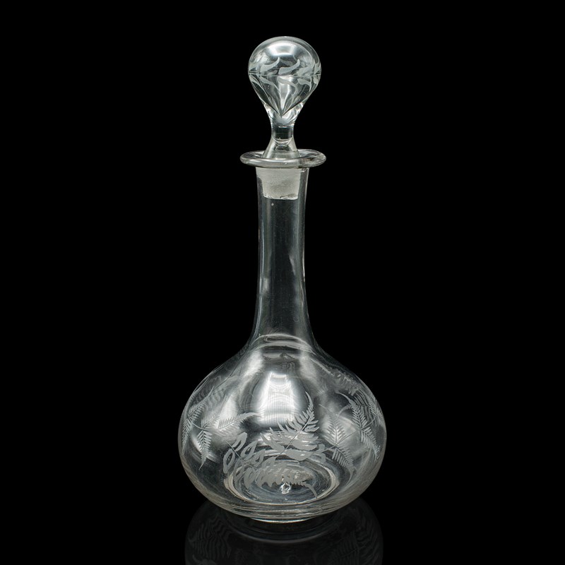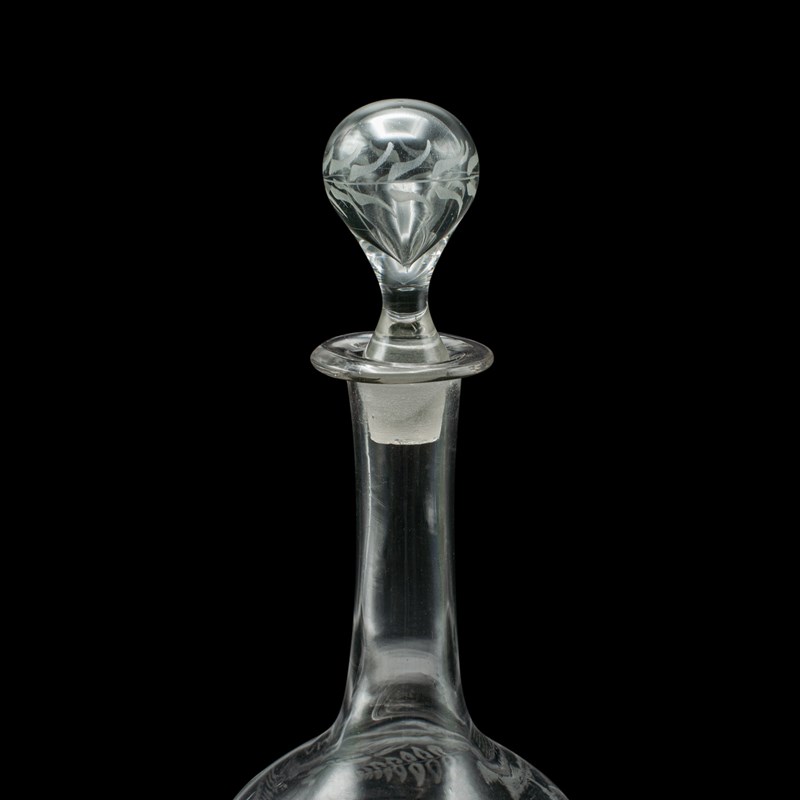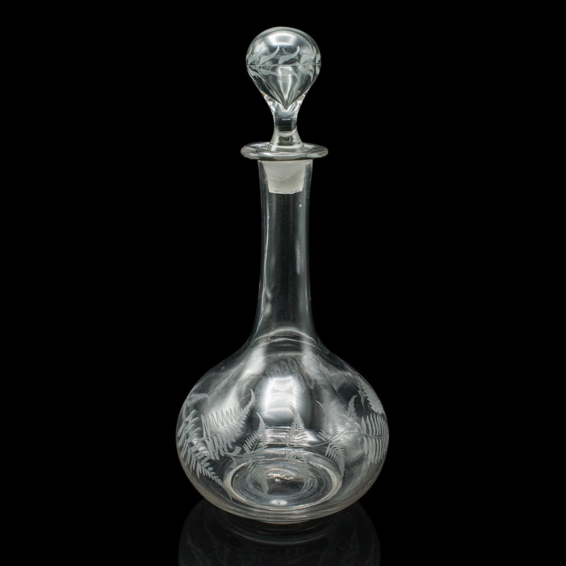 Finely etched decoration adorns the bulbed body and stopper, featuring a fern leaf pattern of delicate artistry