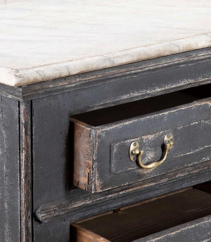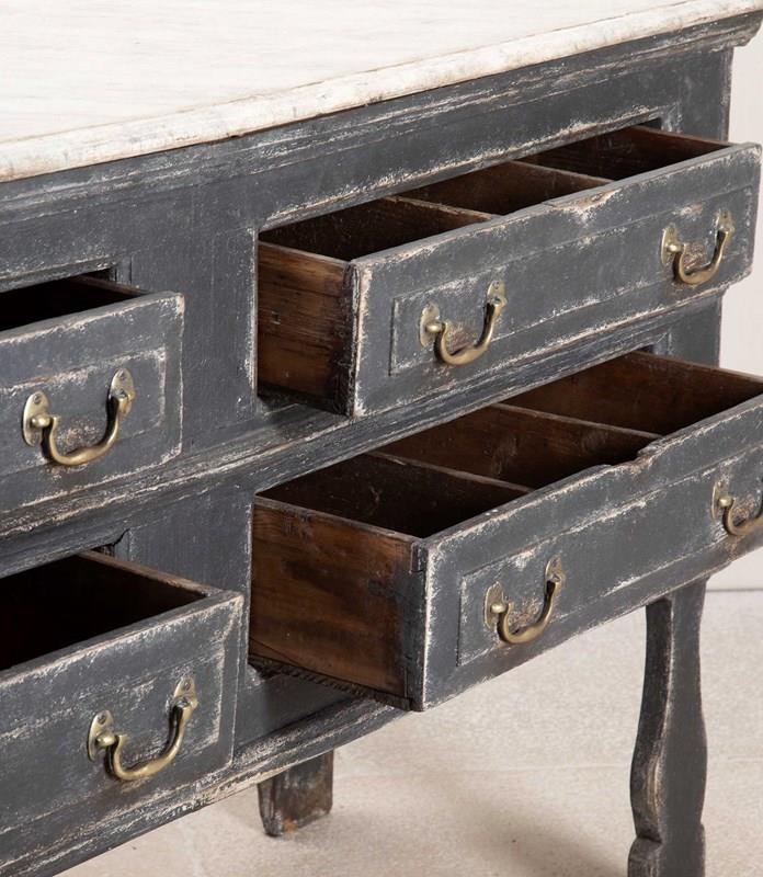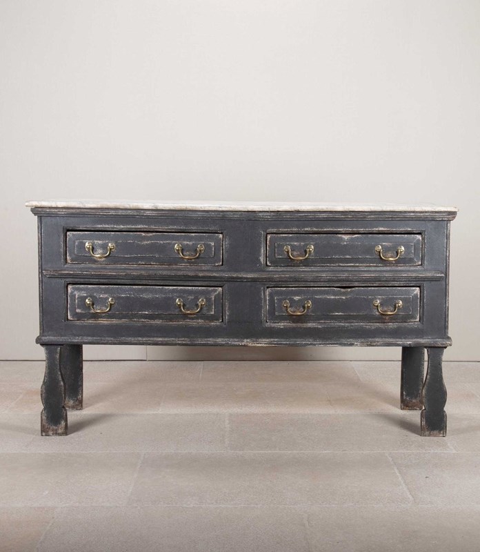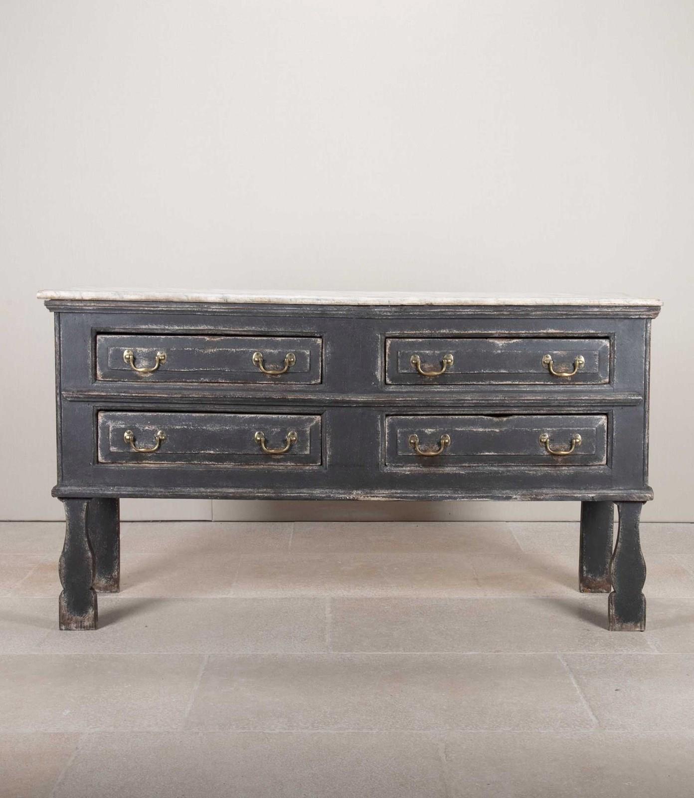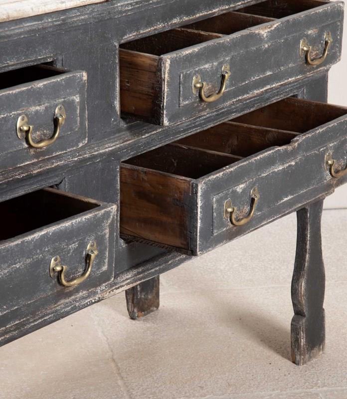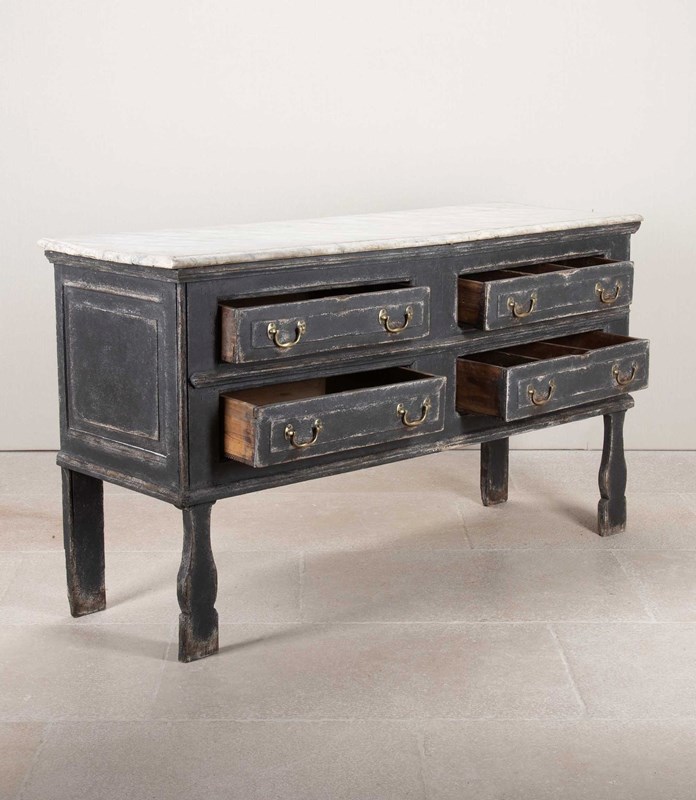 Early 18th Century English silhouette leg pine dresser base. With four drawers and a painted faux marble top. Circa 1730.