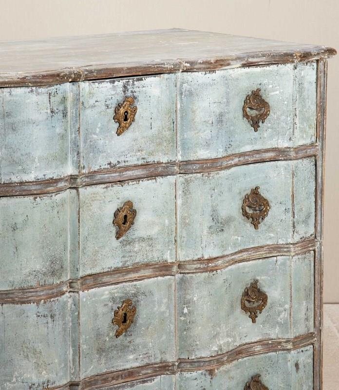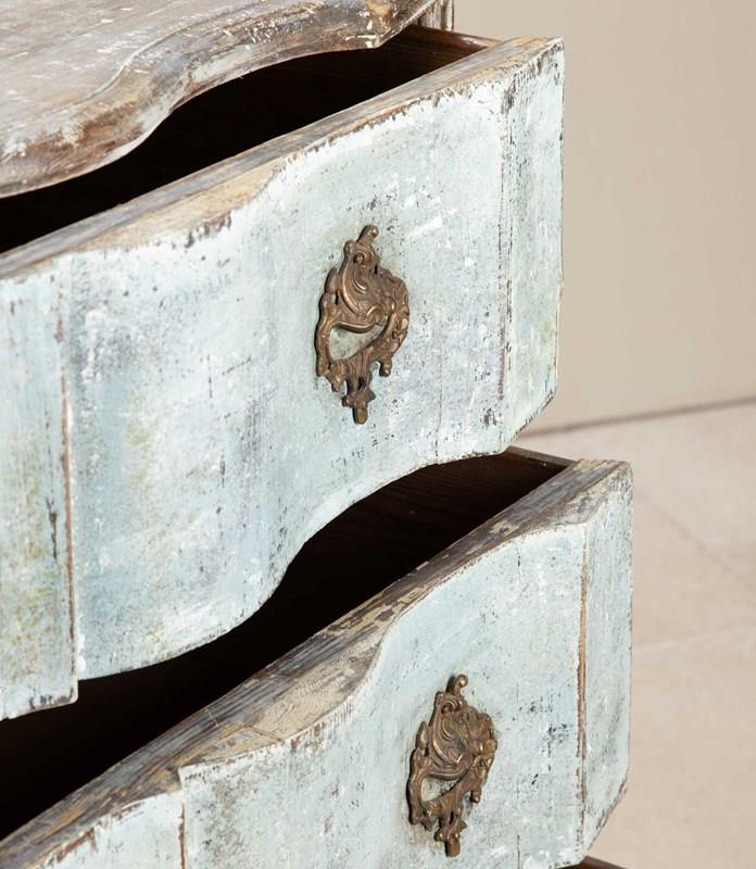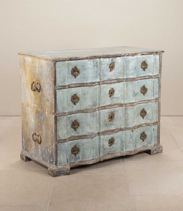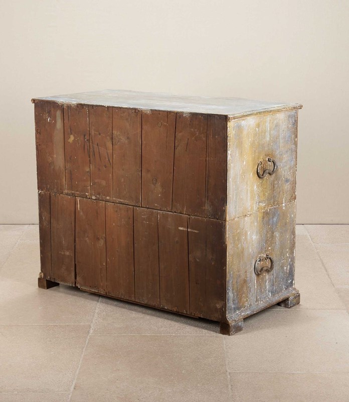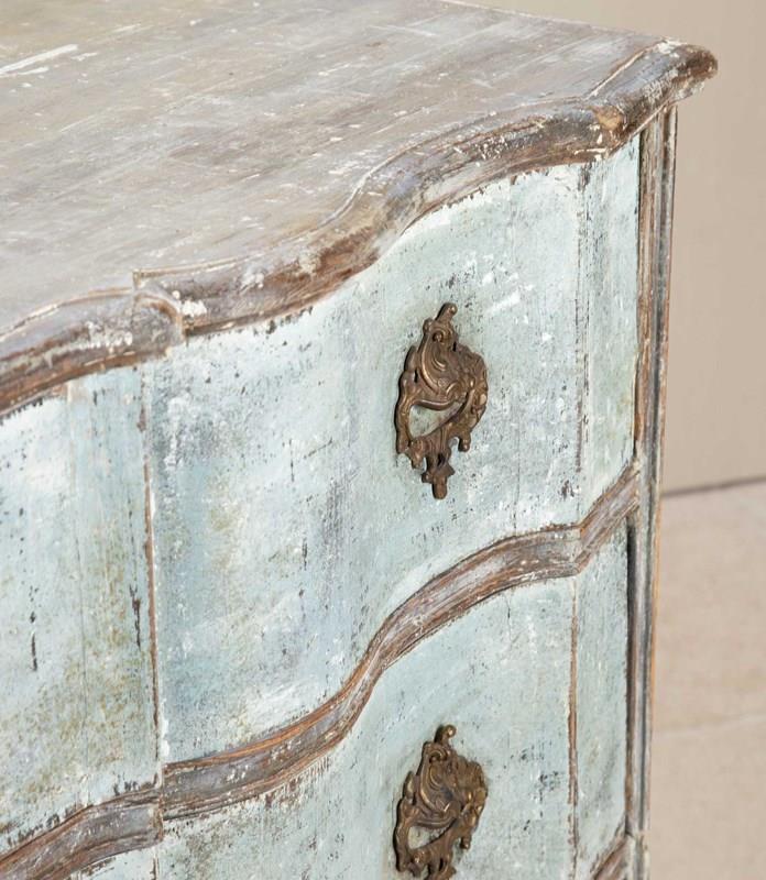 Late 18th Century French commode in old, touched up blue paint. Grand scale in two parts with with serpentine front.