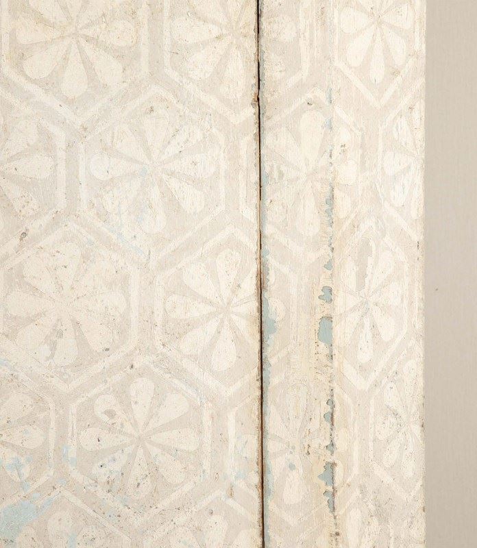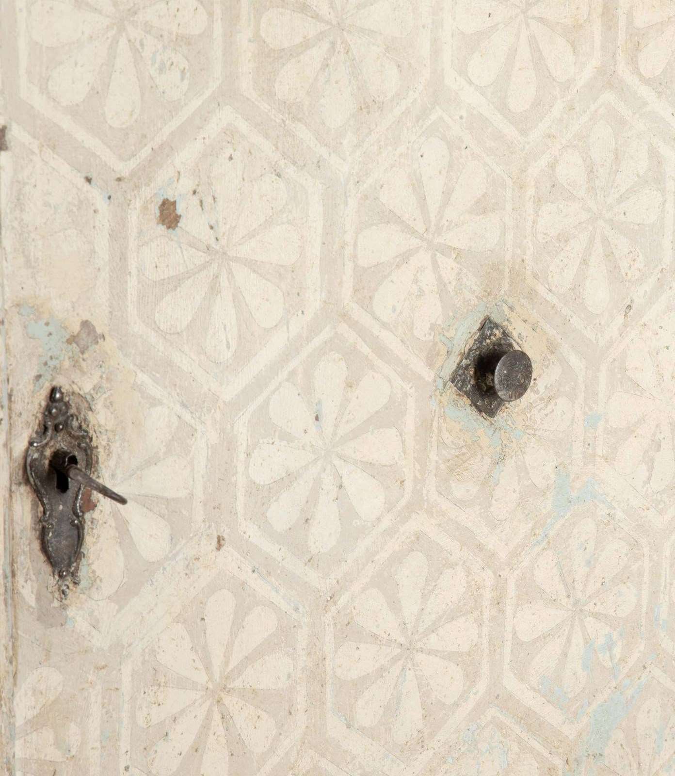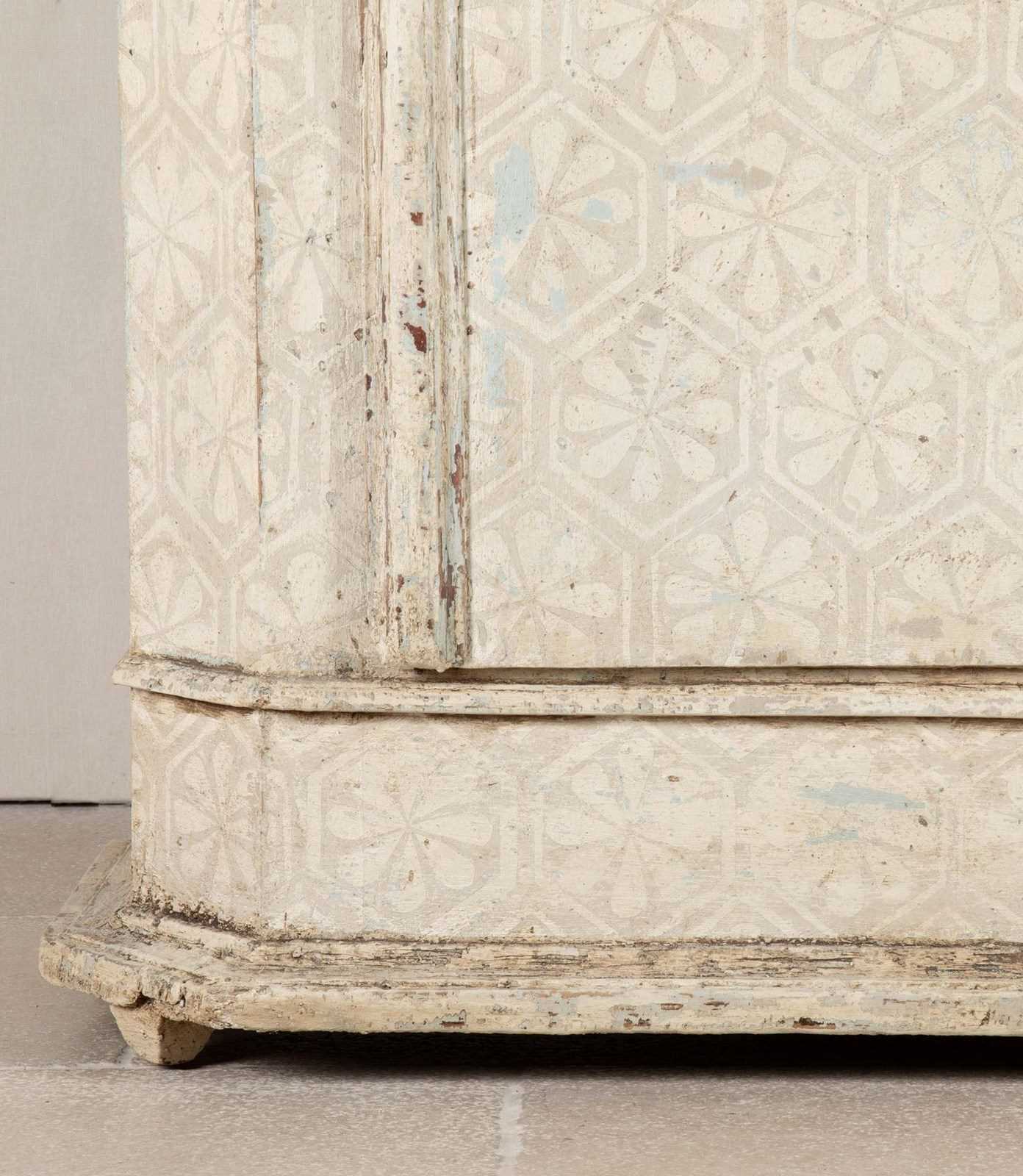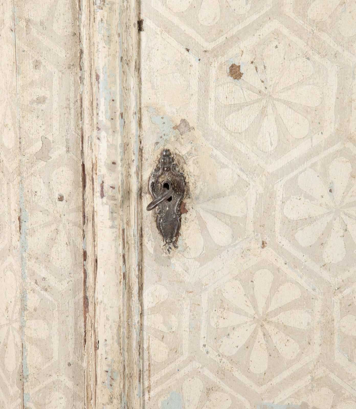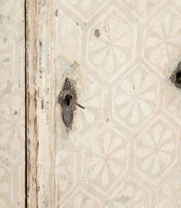 The armoire is constructed in pine and has a fitted interior of shelves and hanging rail, original iron fittings. With a more contemporary hand painted geometric finish.