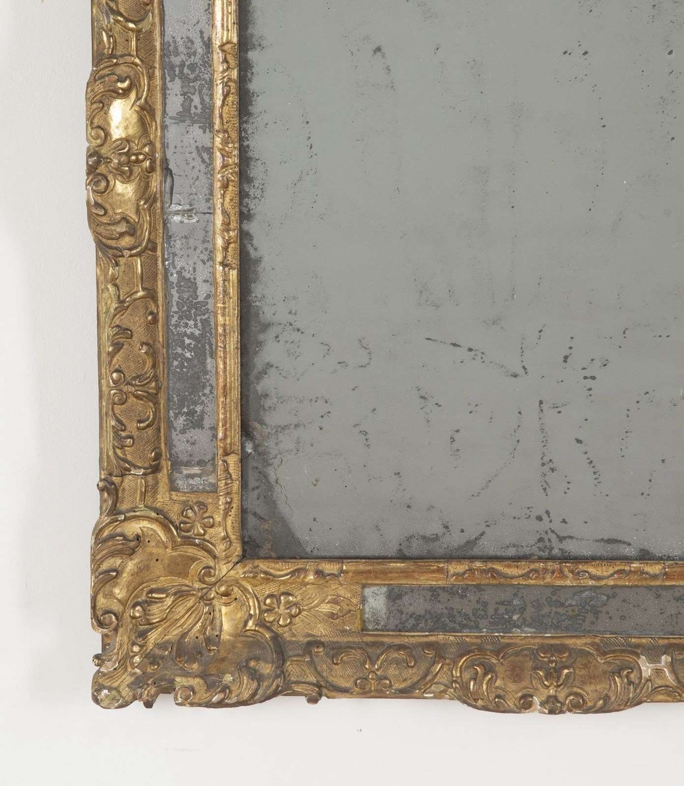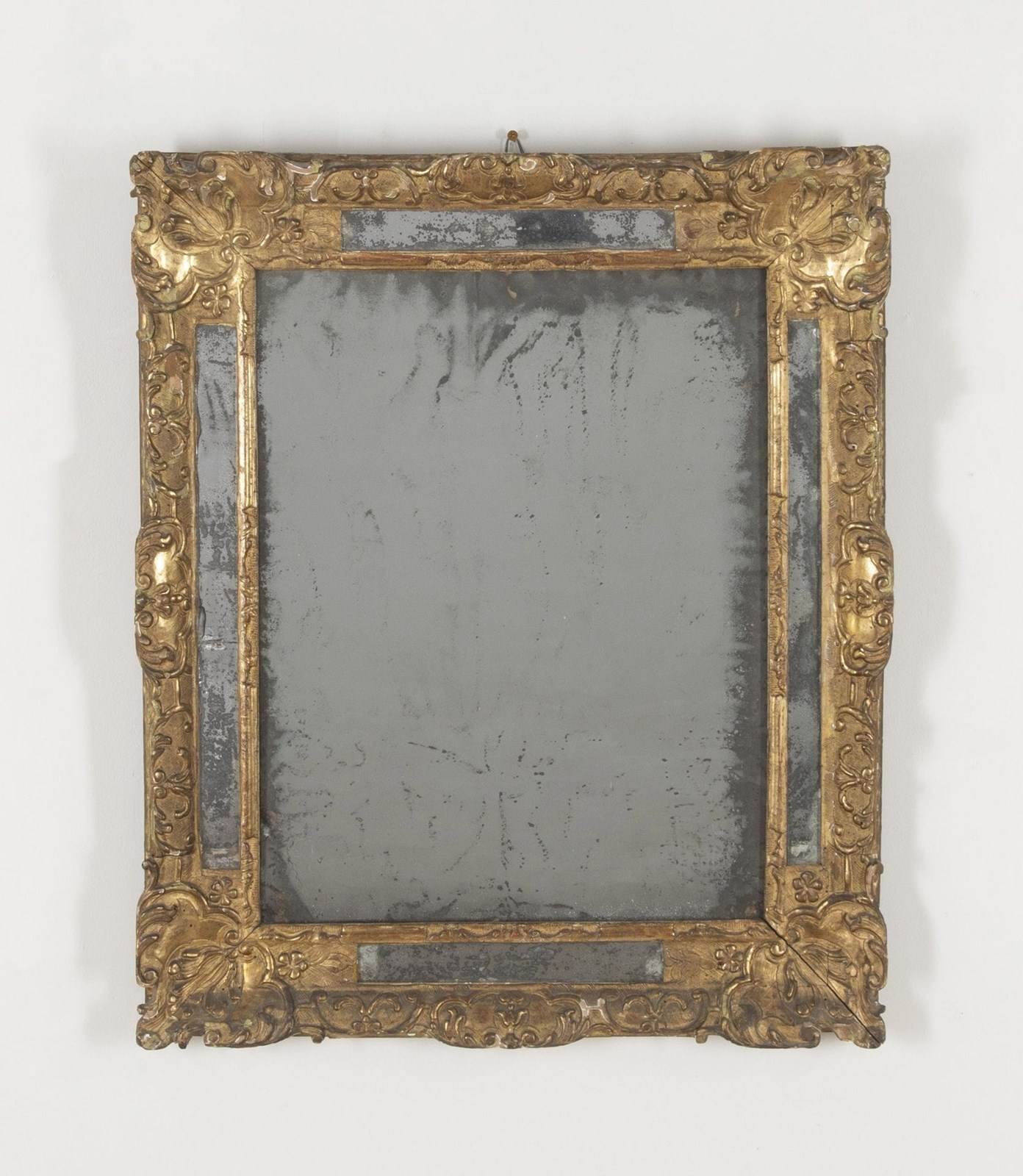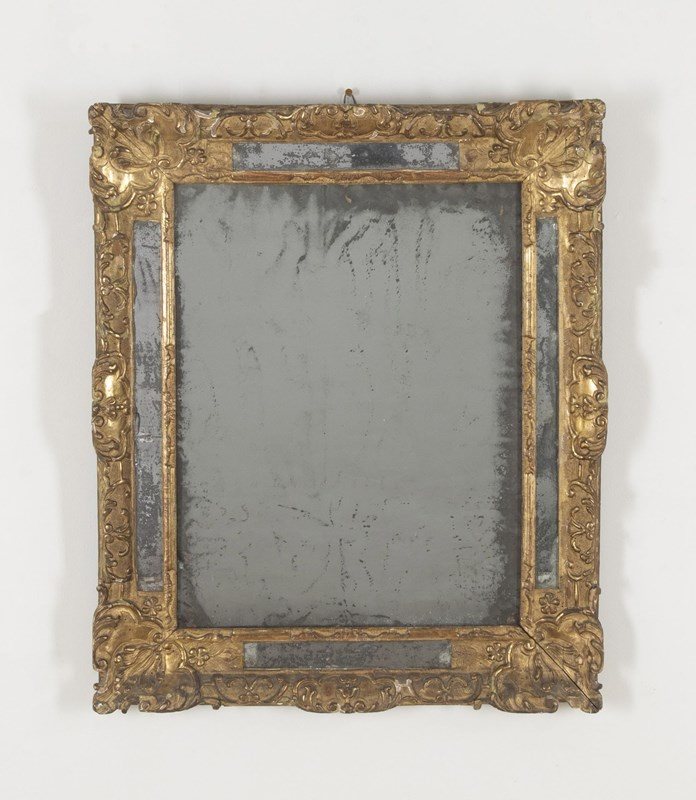The mirror has margin glass panels to all four sides with foliate spandrels to each corner. These glasss panels in particular show much foxing.