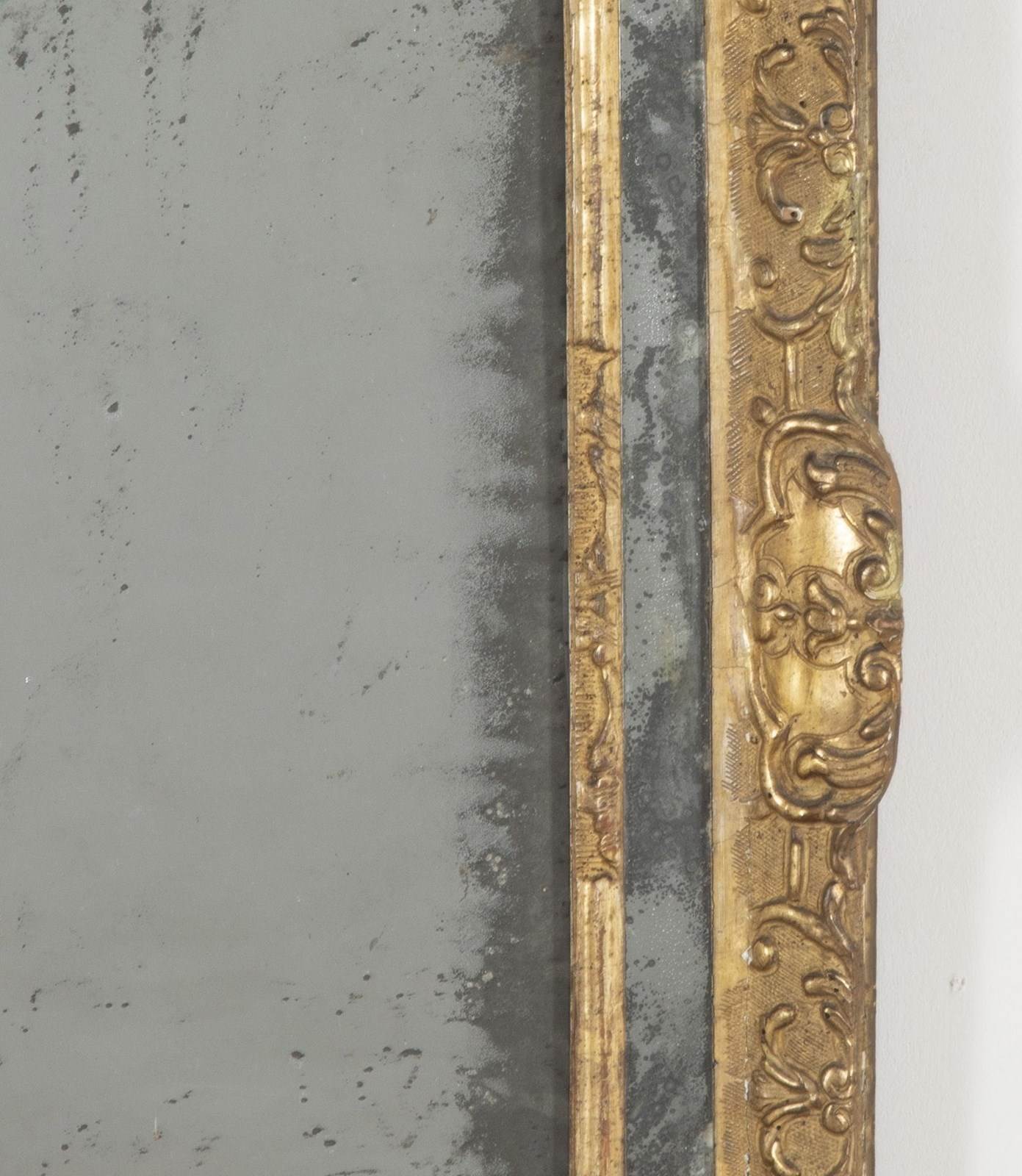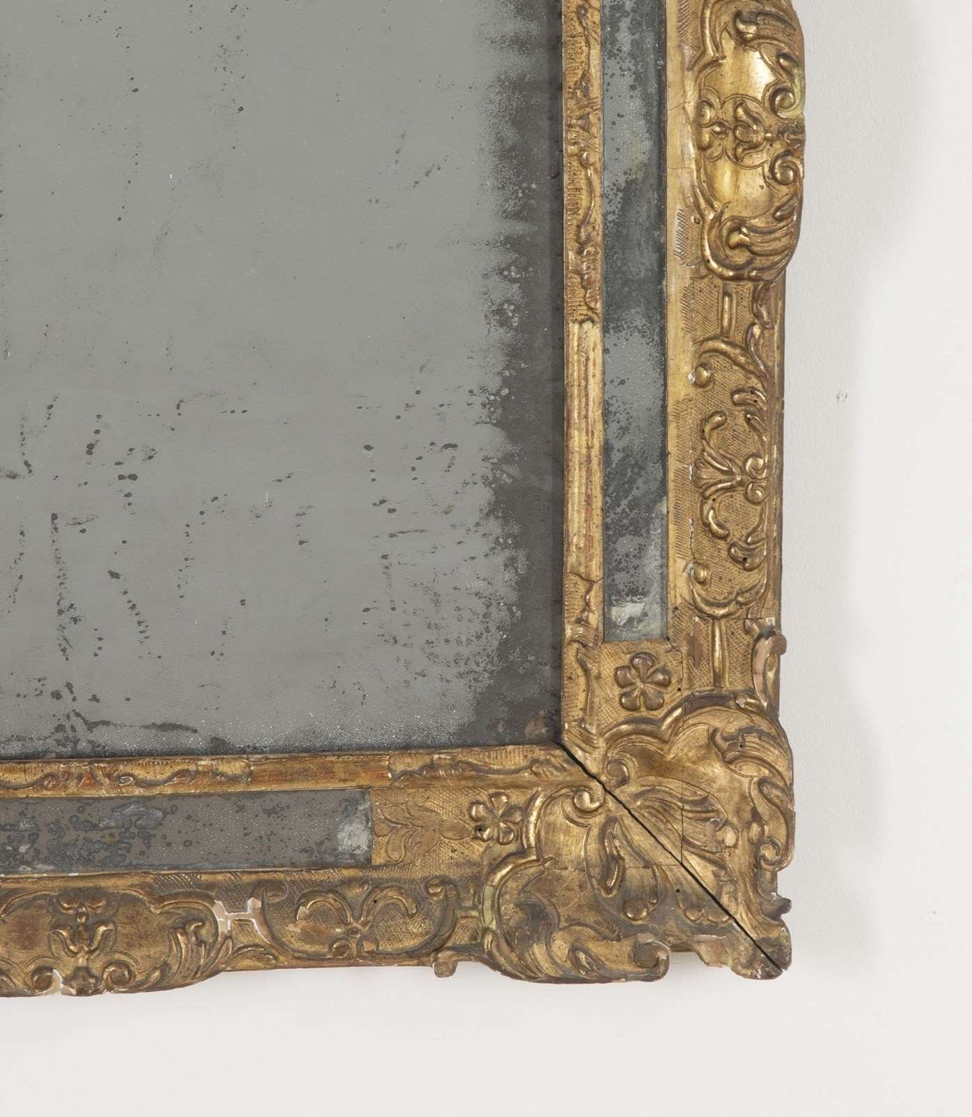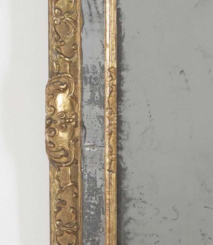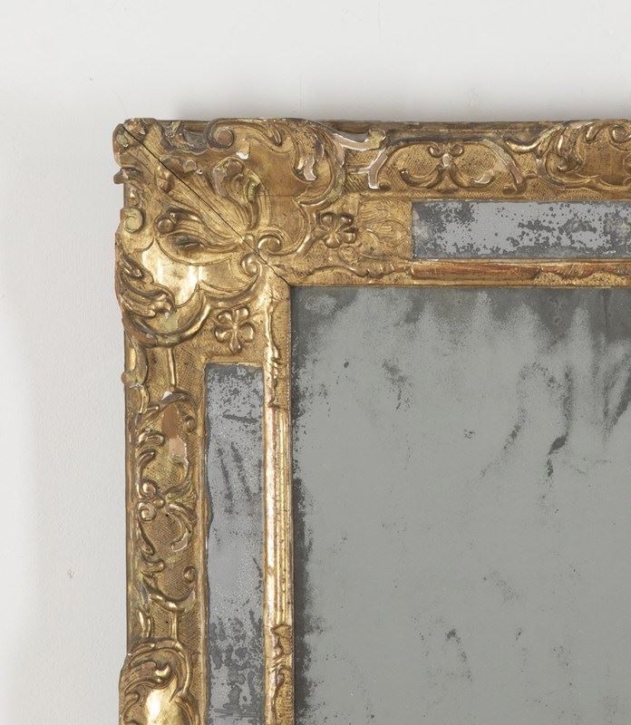 The mirror has margin glass panels to all four sides with foliate spandrels to each corner. These glasss panels in particular show much foxing.