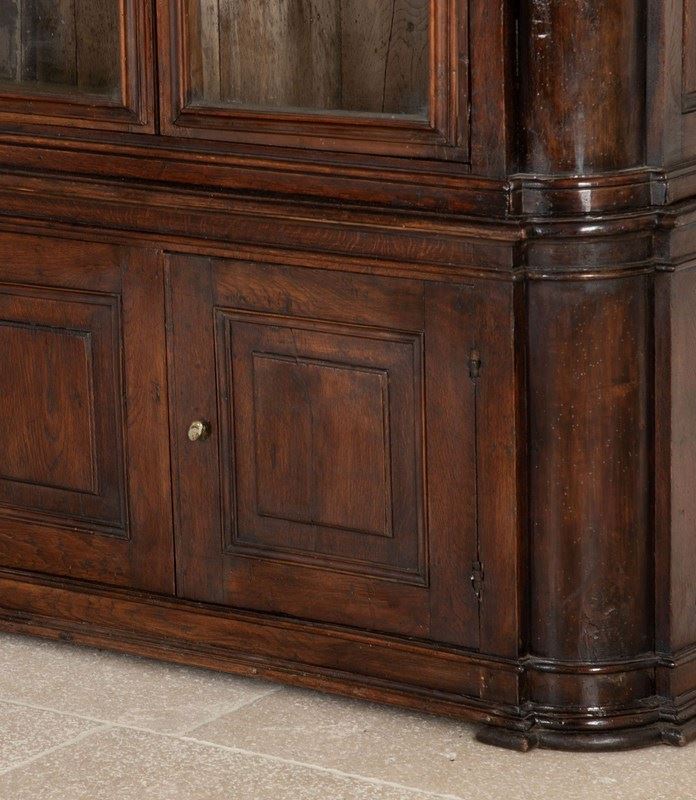 A large 18th Century four bay Italian display cabinet with rounded corners, the base with dwarf cupboards. The projecting cornice over four glazed doors containing the original glazing & having elaborately moulded frames enclosing an internal arrangement of shelves, the base with fielded panel doors enclosing cupboards with a central shelf to each, supported on a moulded plInth base.