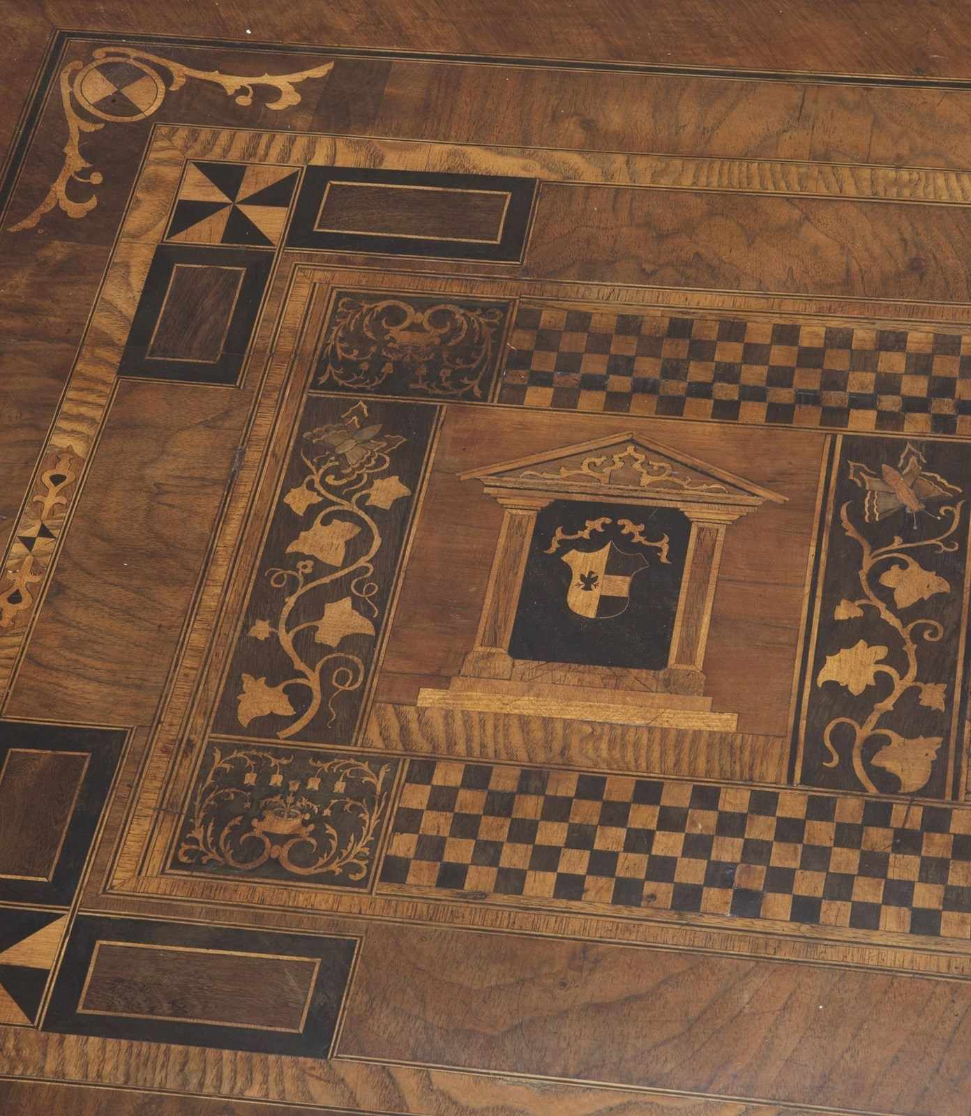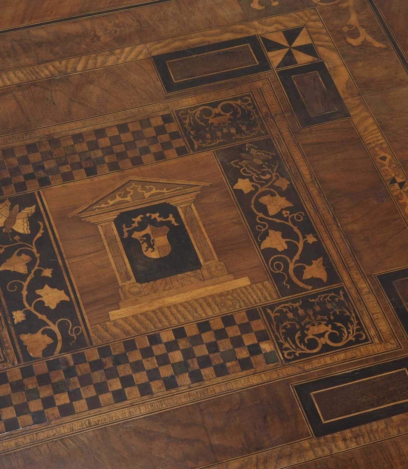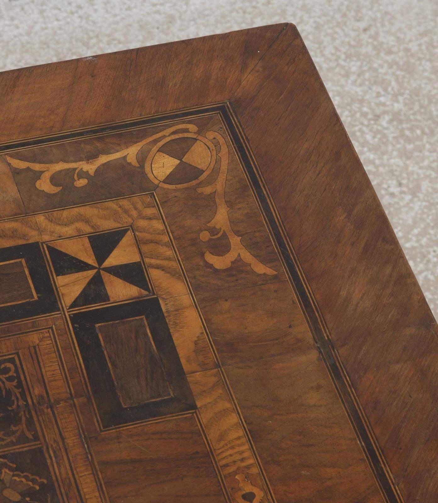 With a marquetry table top and frieze drawer along the whole length. Resting on a later 19th Century walnut base.