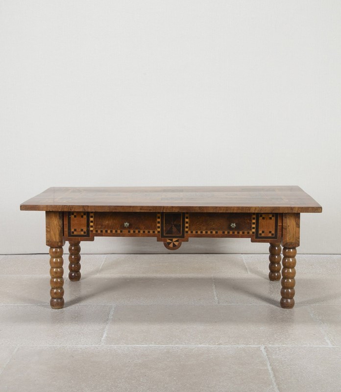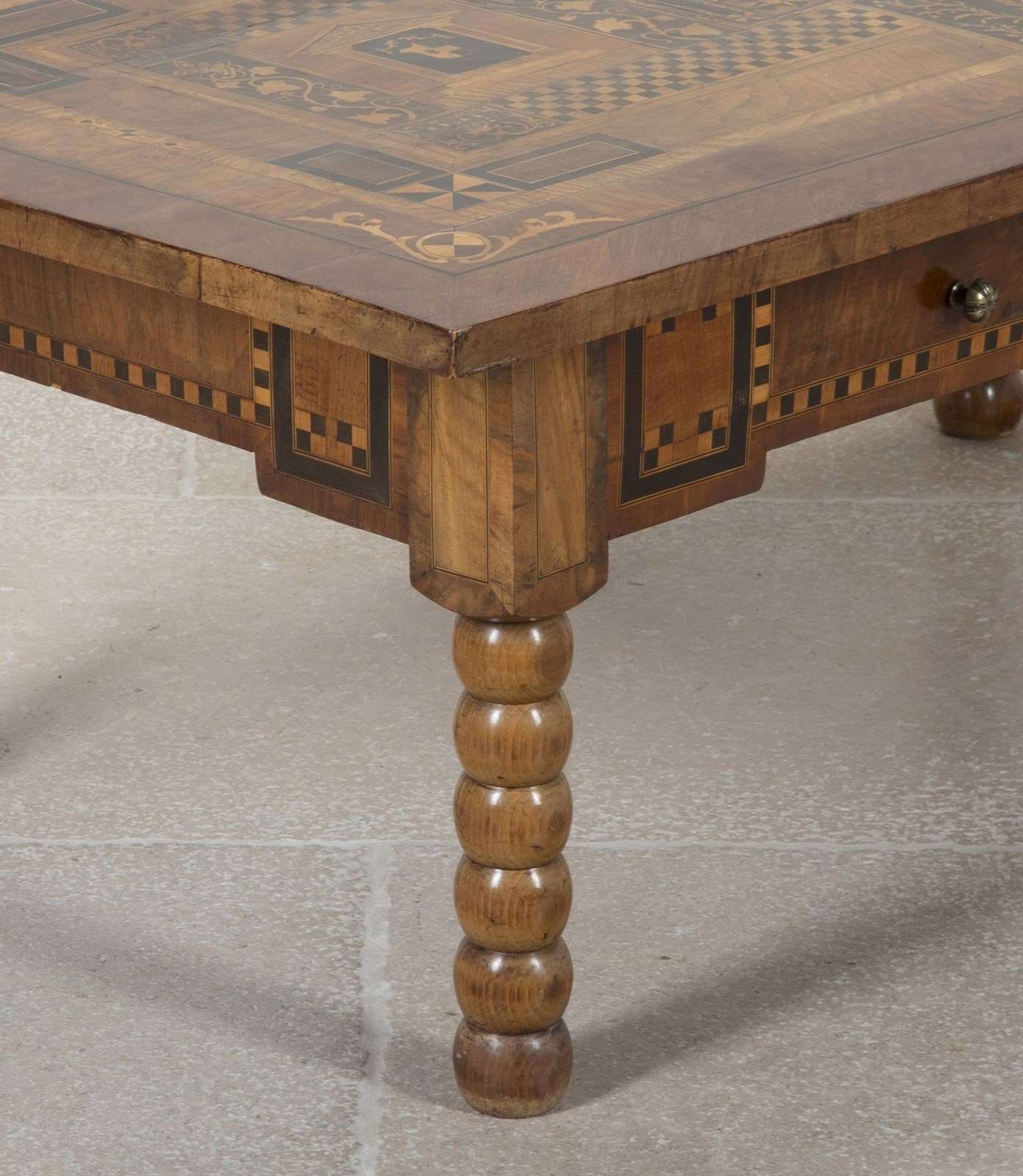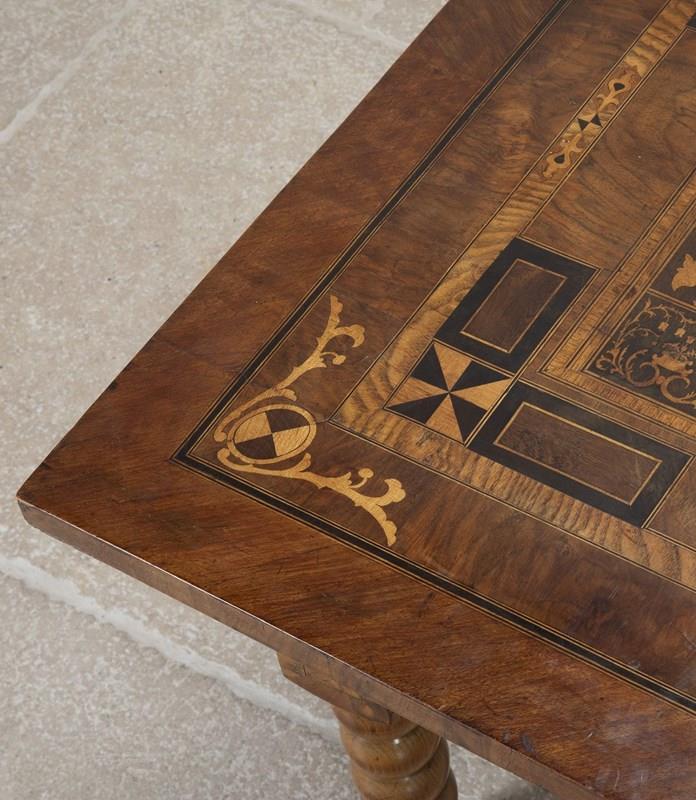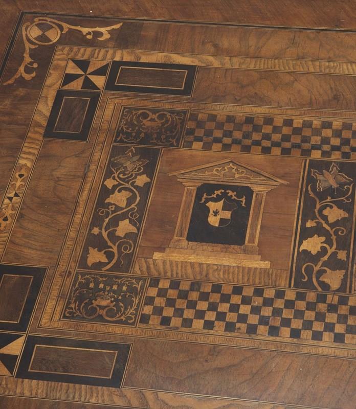 With a marquetry table top and frieze drawer along the whole length. Resting on a later 19th Century walnut base.