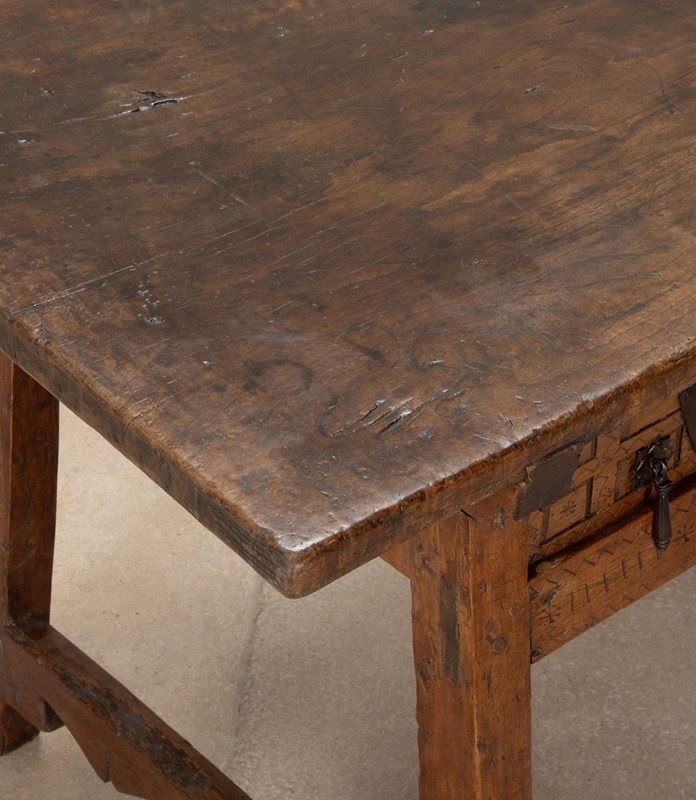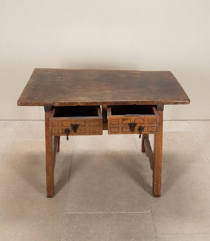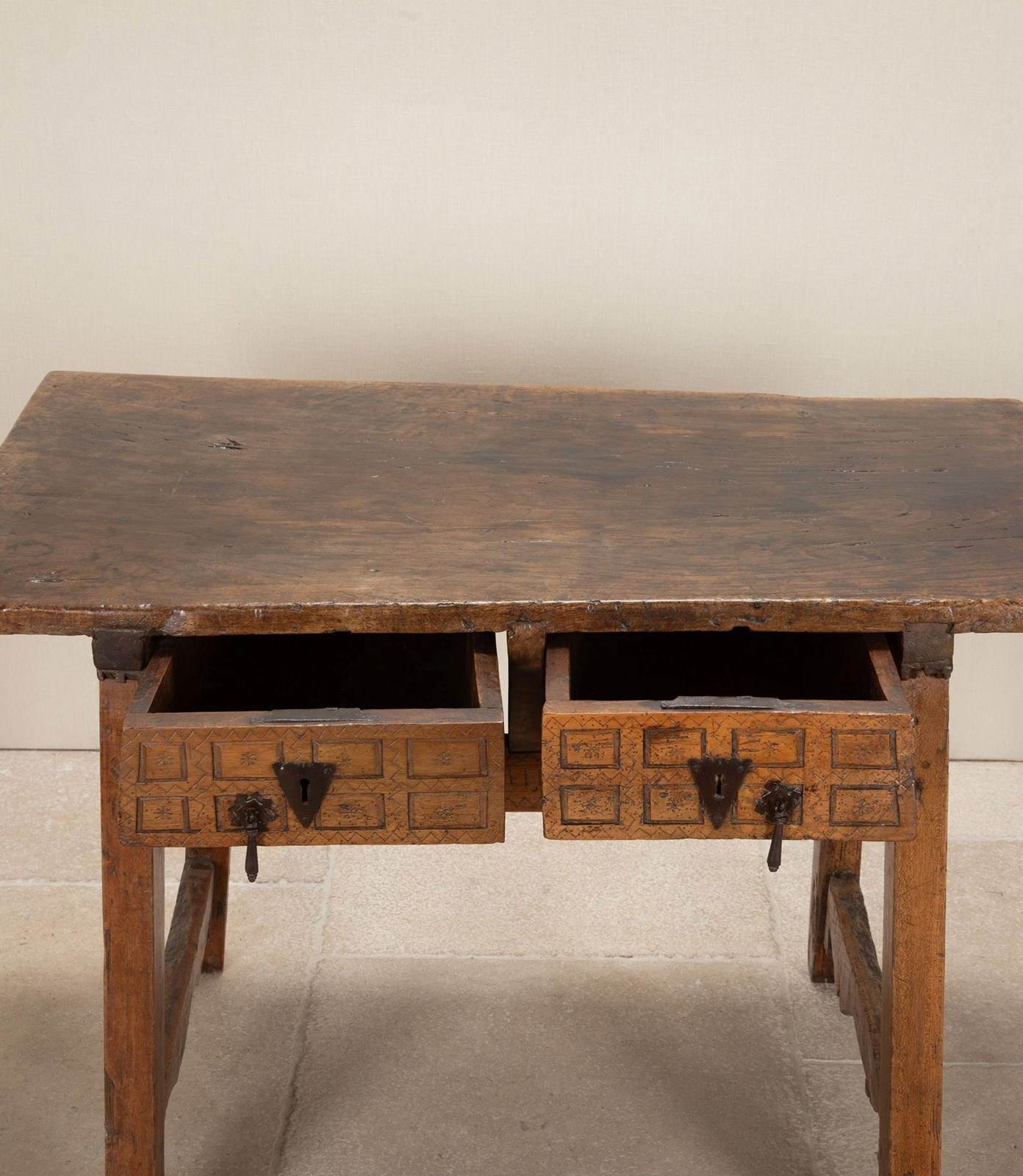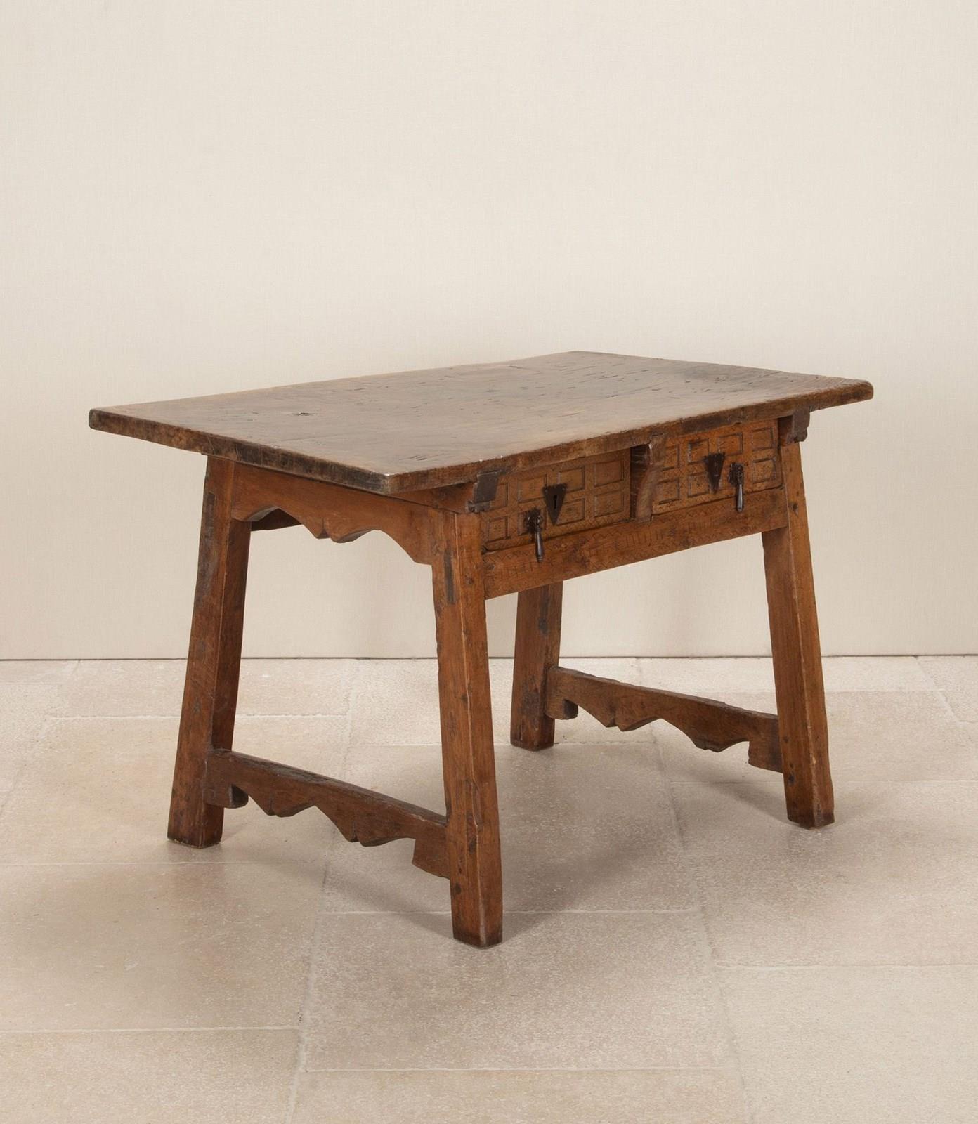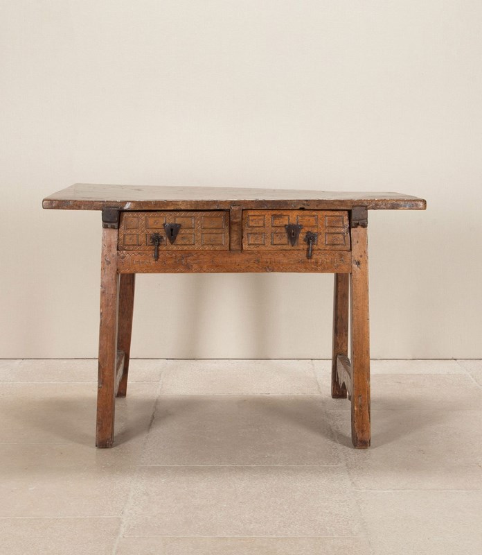 Striking 18th Century Spanish side table from the Valencia region of Spain. Of walnut construction with a single plank top and two drawers. With beautiful carved details retaining its original ironwork.