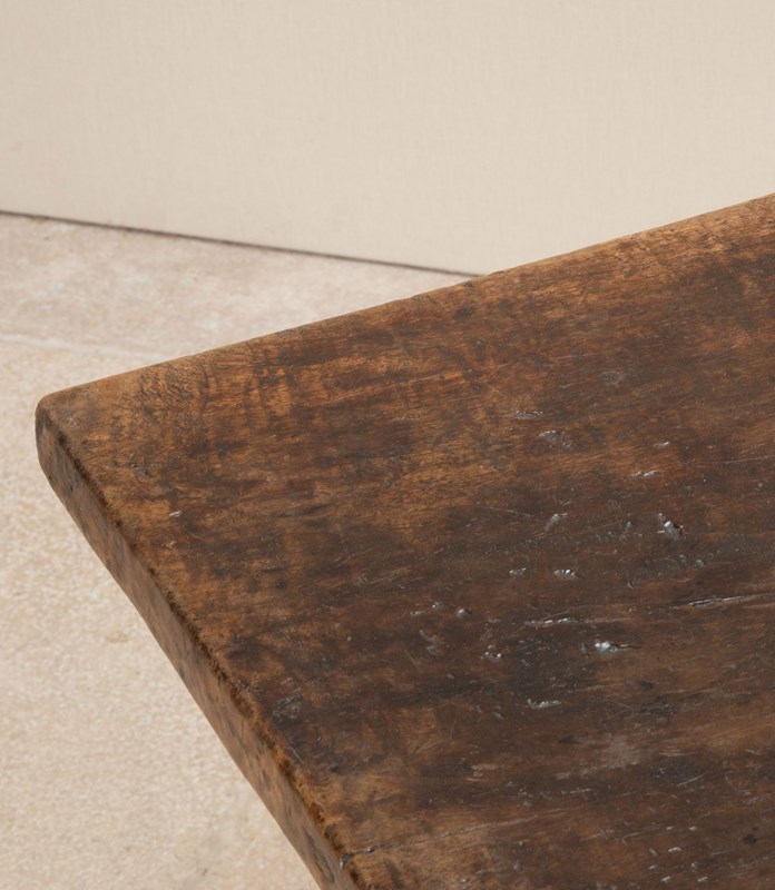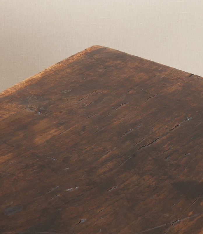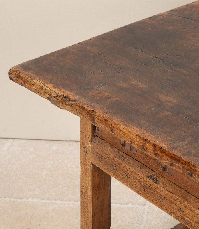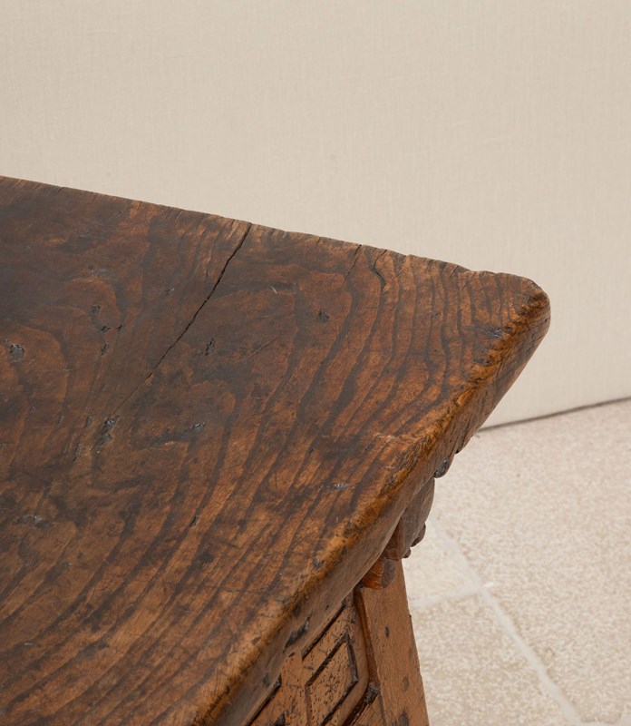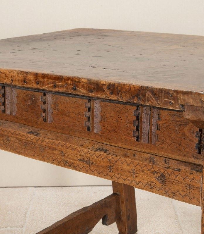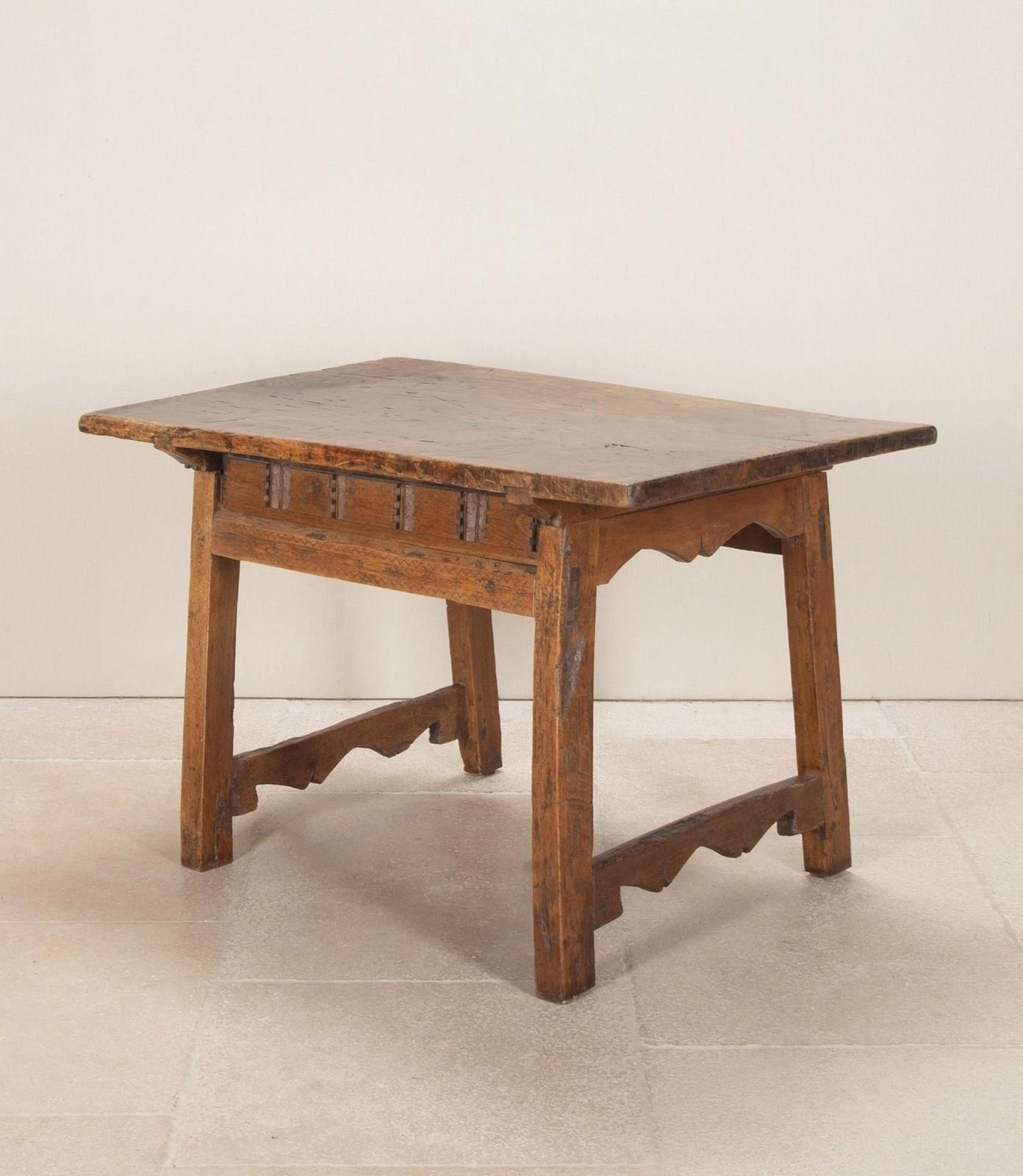 Striking 18th Century Spanish side table from the Valencia region of Spain. Of walnut construction with a single plank top and two drawers. With beautiful carved details retaining its original ironwork.
