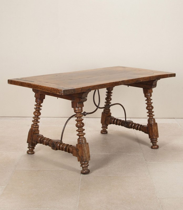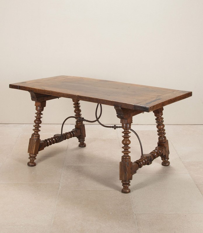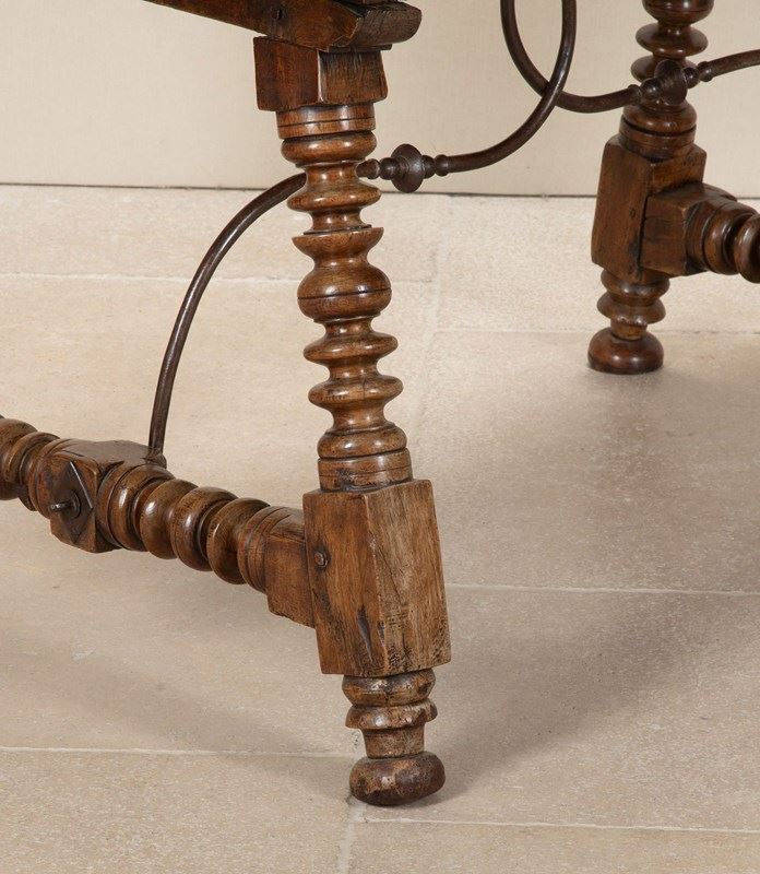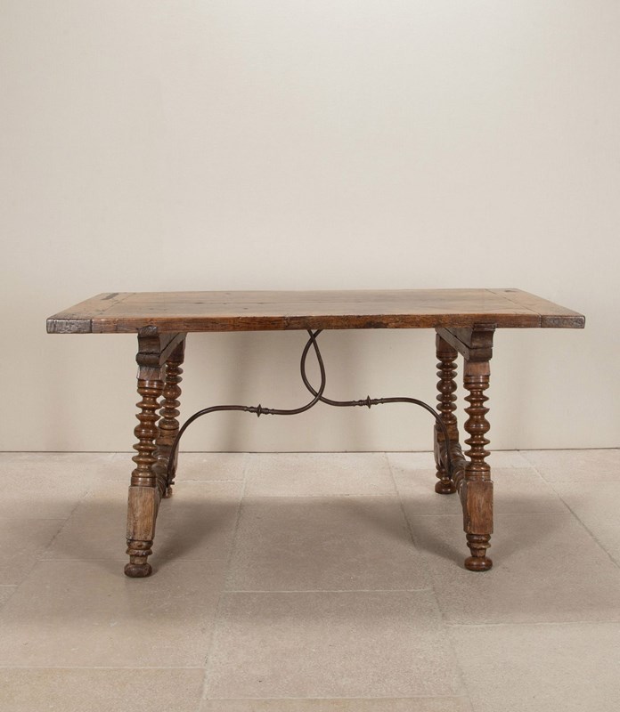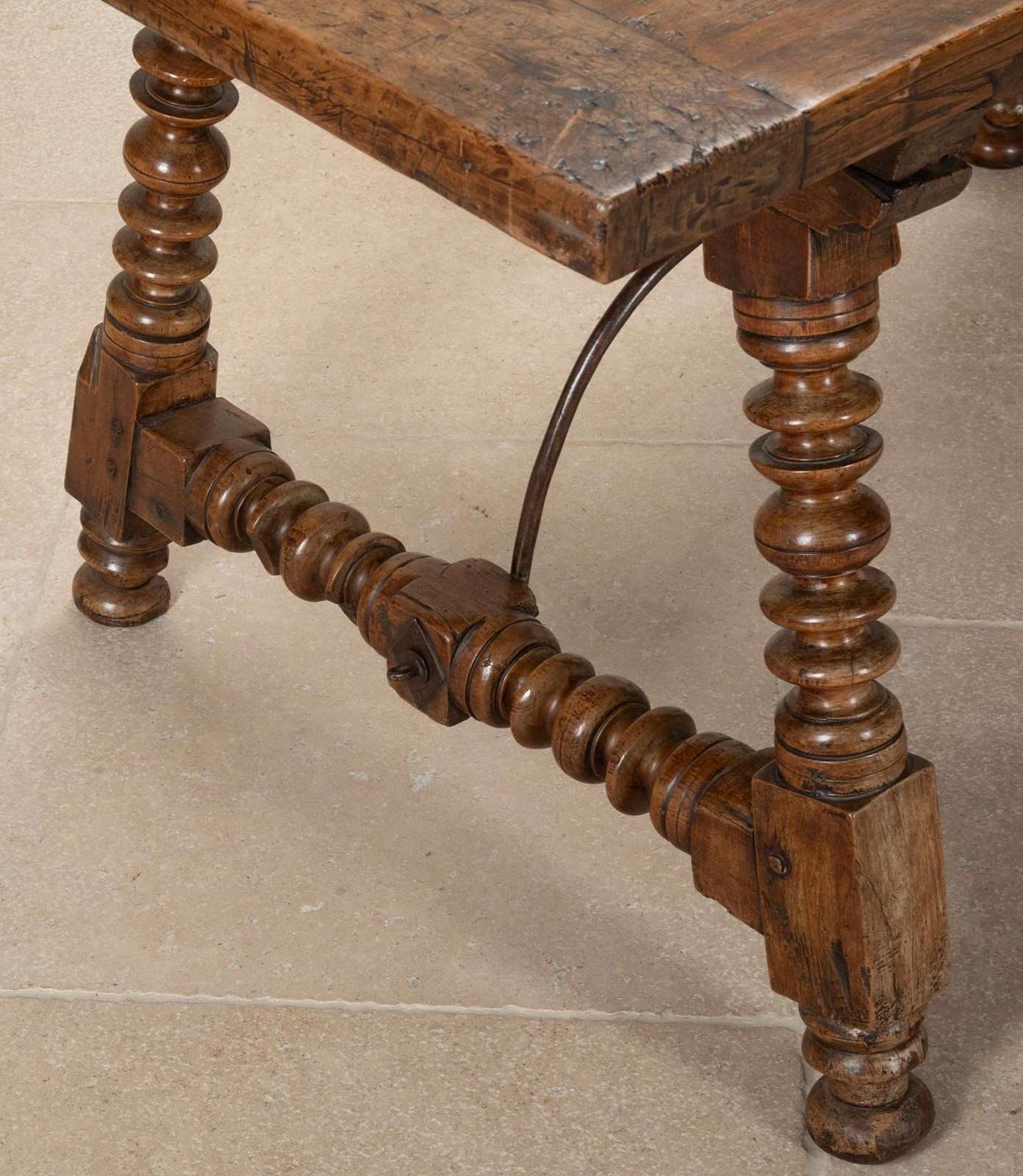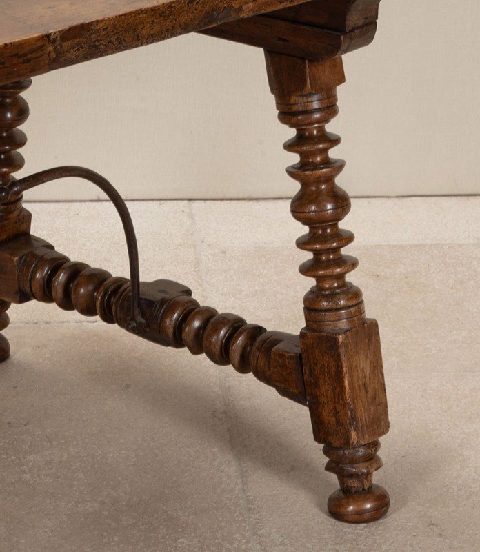 18th Century Spanish walnut centre table. With elegant bobbin or discus carved legs and hand forged metal stretcher.Beautiful aged patina and good historic repairs to the top.