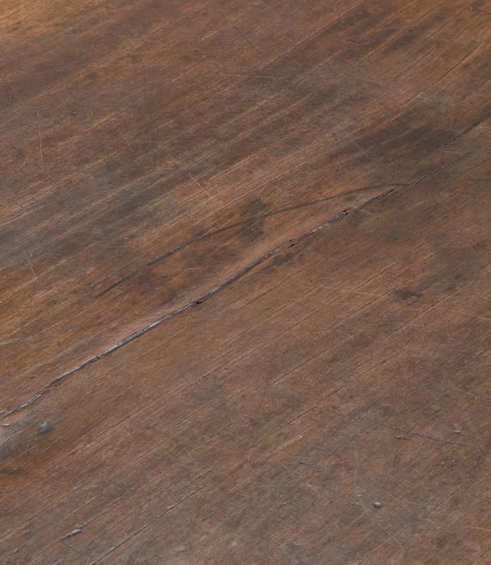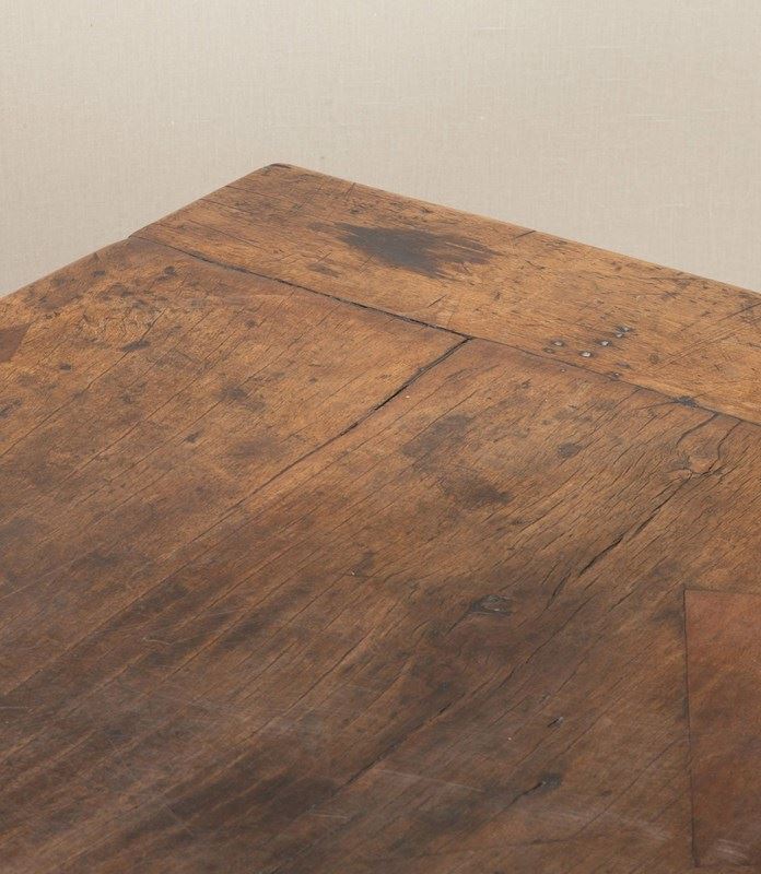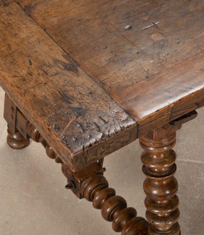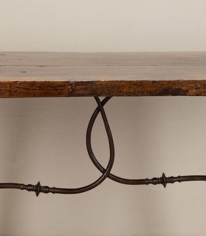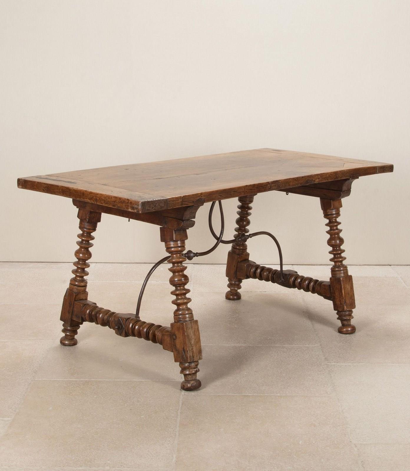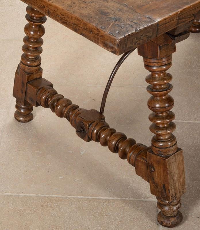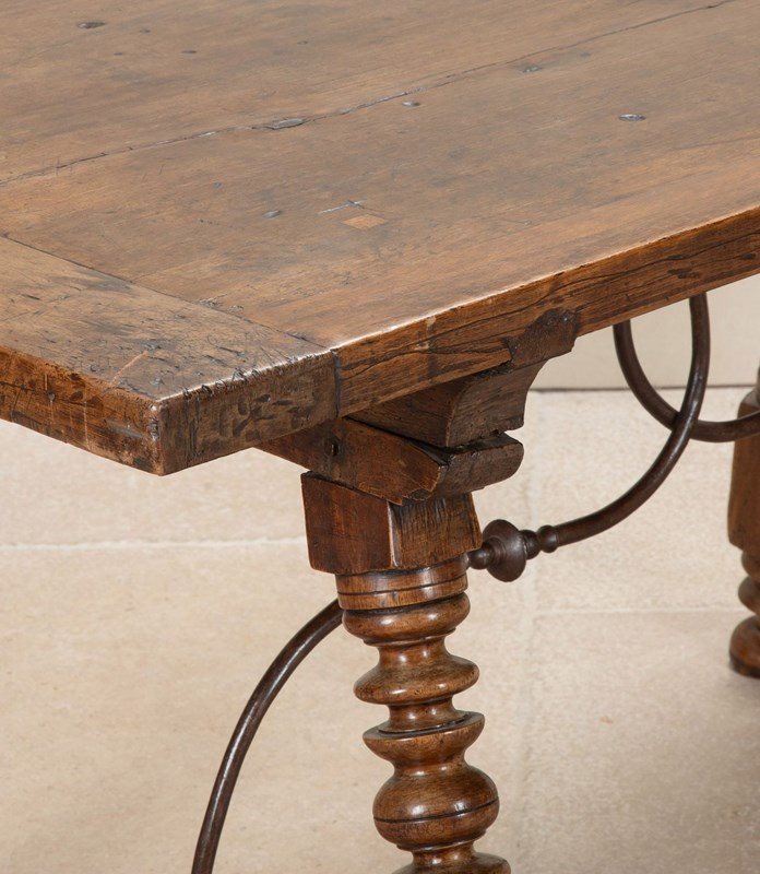 18th Century Spanish walnut centre table. With elegant bobbin or discus carved legs and hand forged metal stretcher.Beautiful aged patina and good historic repairs to the top.