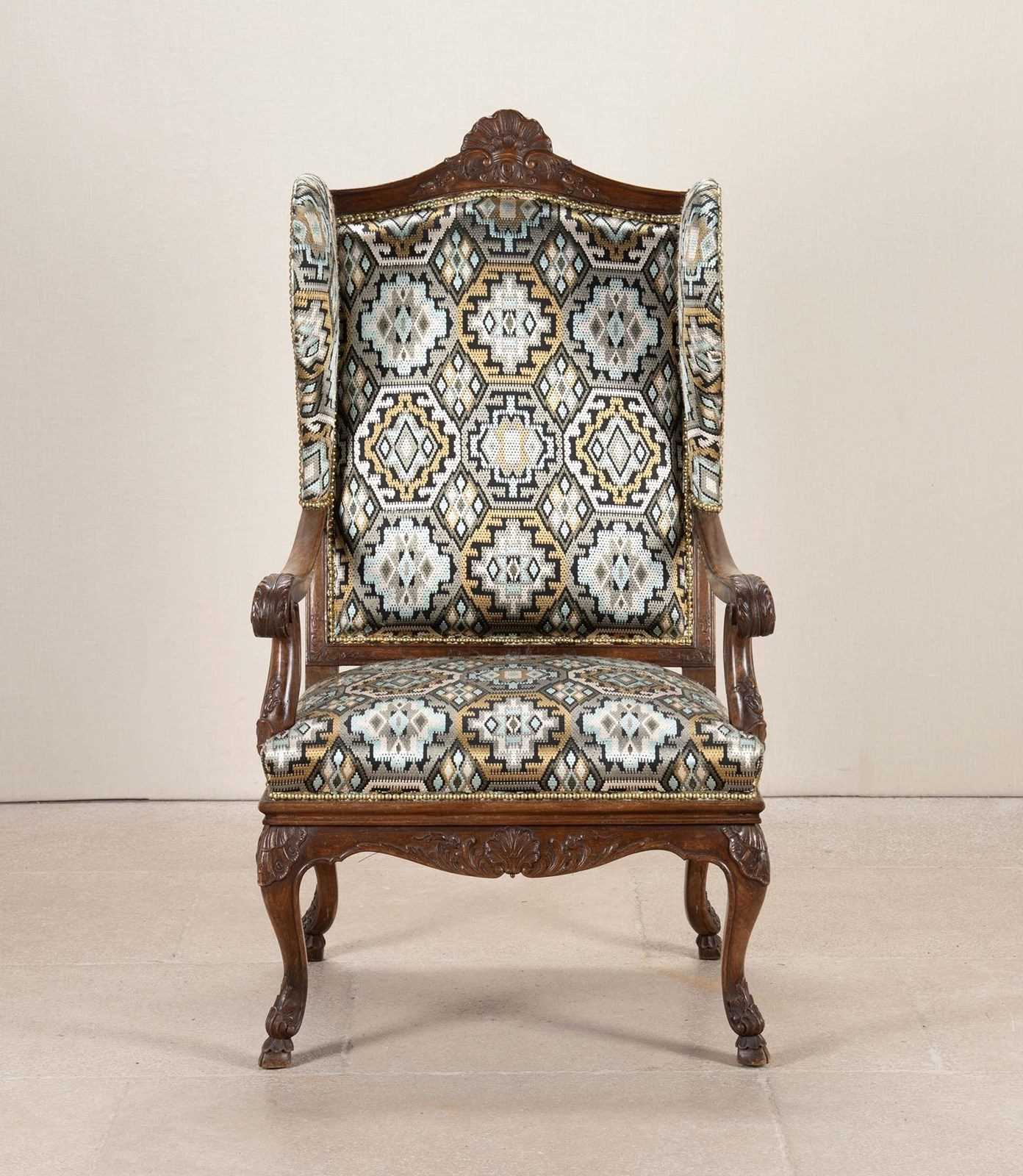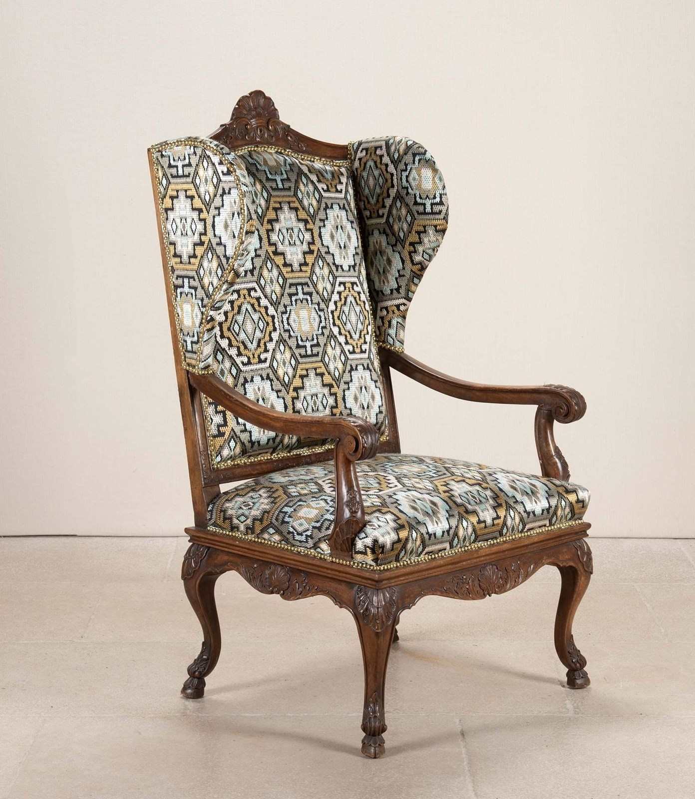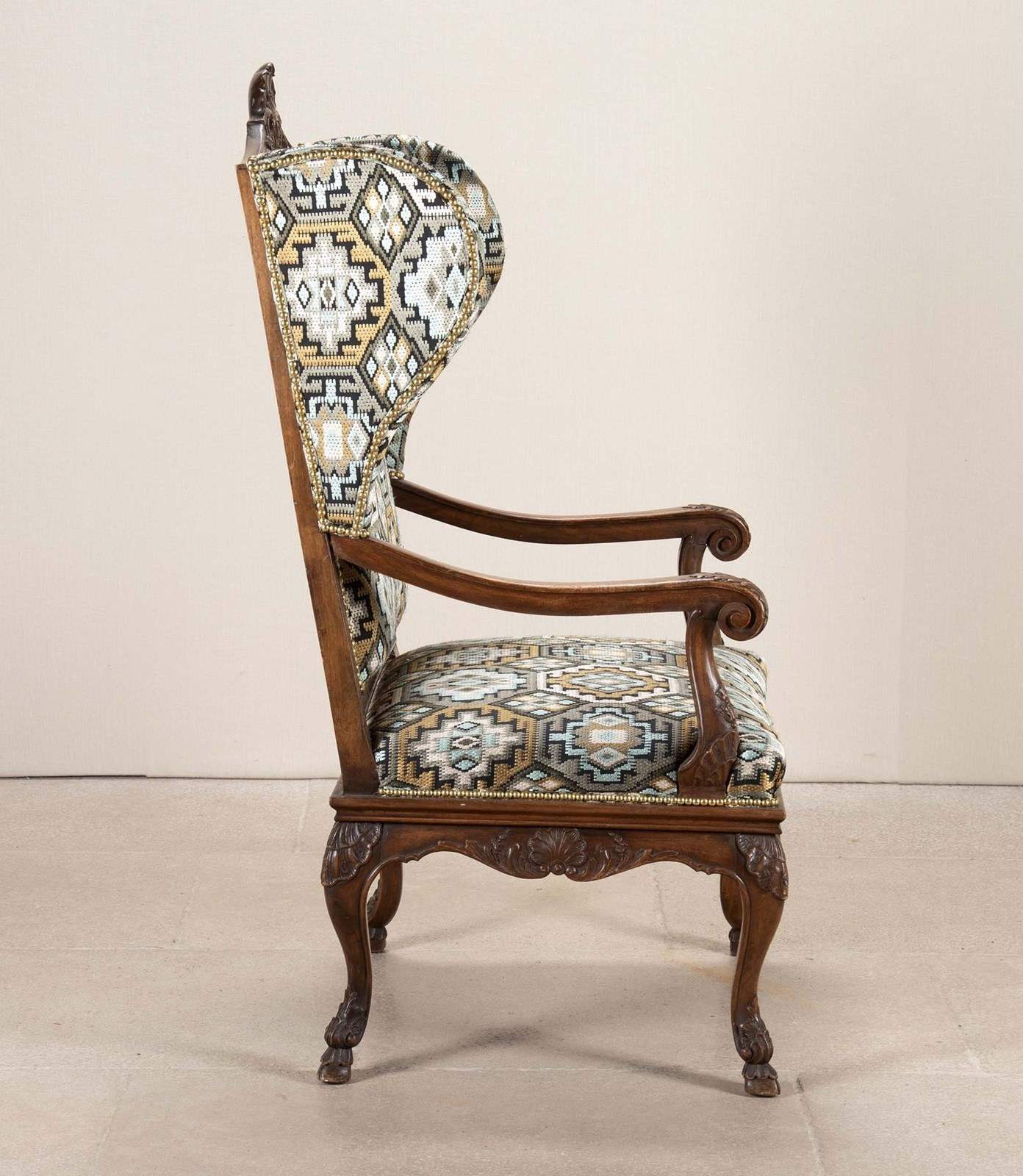 Carved crest rail, upholstered wings leading down to acanthus carved scrolled arms. With shaped aprons and central carved shells raised on shapely cabriole legs and hoofed feet.