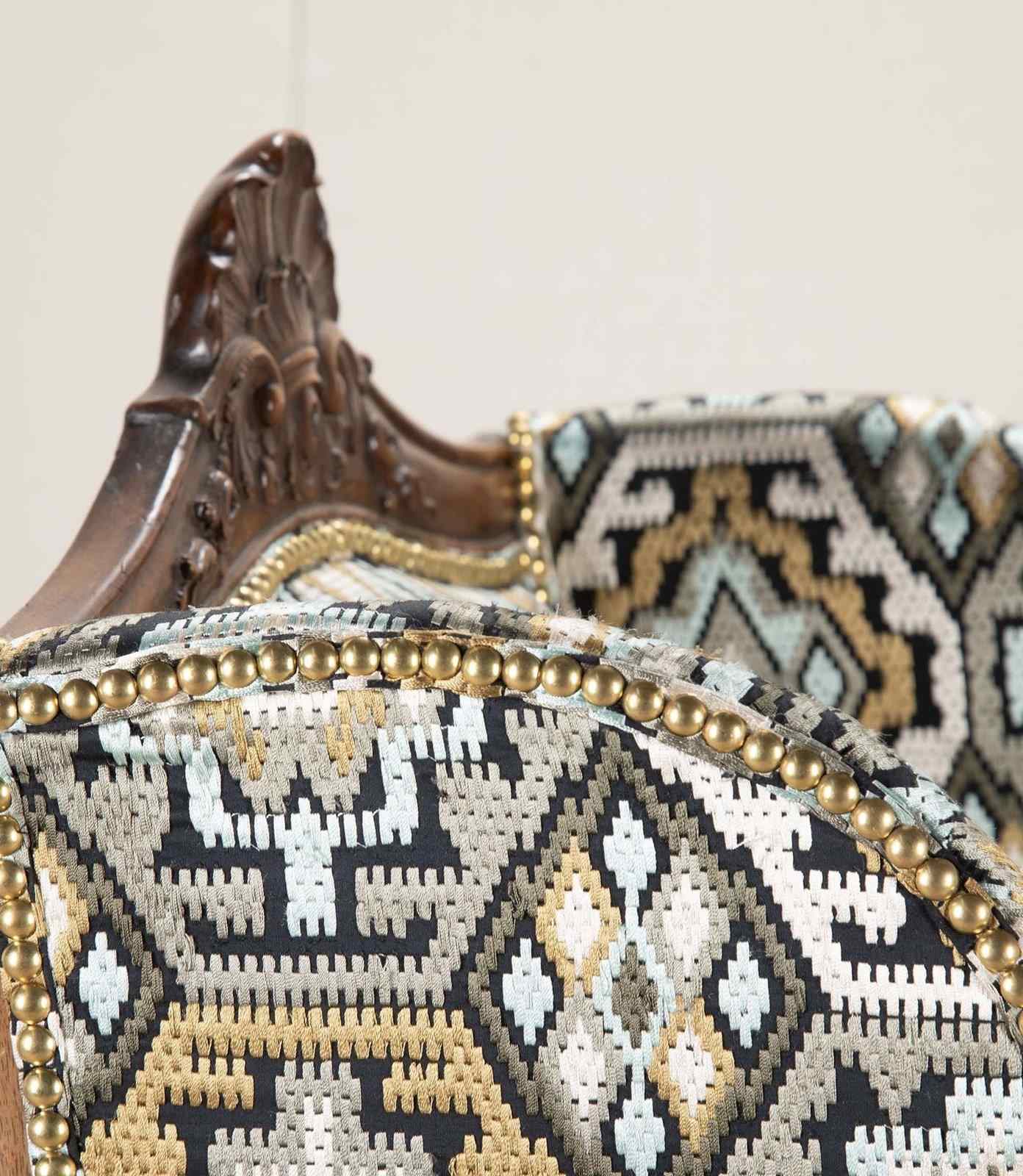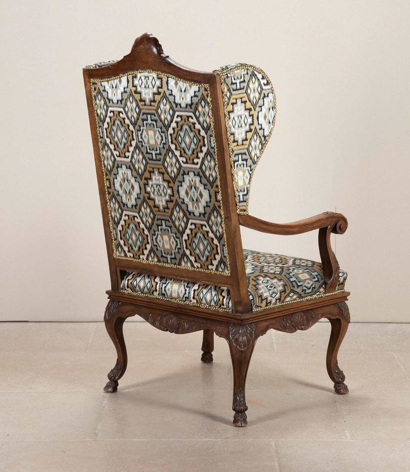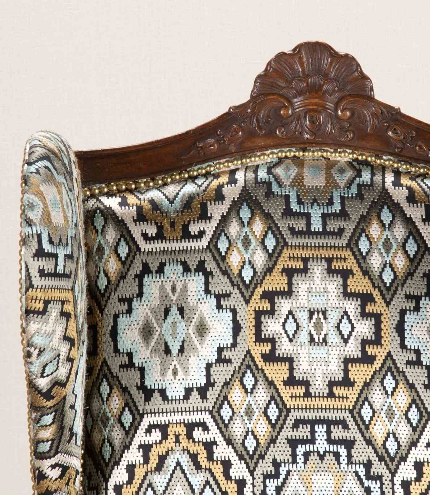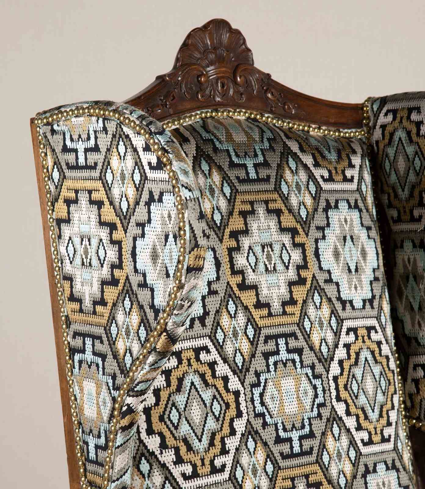 Carved crest rail, upholstered wings leading down to acanthus carved scrolled arms. With shaped aprons and central carved shells raised on shapely cabriole legs and hoofed feet.