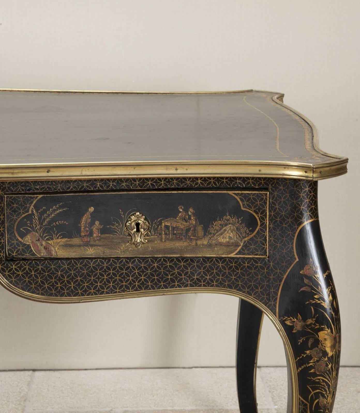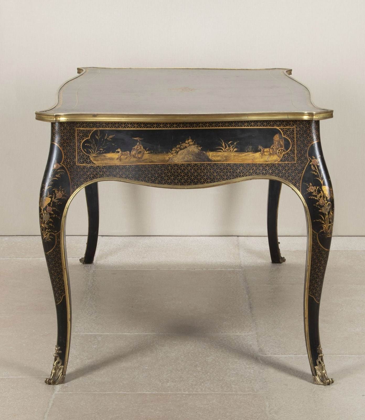 An exceptionally fine example of late 19th Century French chinoiserie on a handsome and grand scale bureau plat in Louis XV style. The desk of the finest quality with a beautifully tooled skiver, framed by a shaped and decorated brass mount. The frieze and legs decorated with an interlocking pattern of gilt circles and scenes of typical classical Chinoiserie decoration, on deep green ground, from the 18th Century. The bottom of the frieze and inside of the legs highlighted by a finely reeded brass mount that has the lightest of touches. The decoration is notably finer in application than became fashionable in the early 20th Century and is work of the highest quality from the period. A very special piece of furniture that can hold its own in any interior.