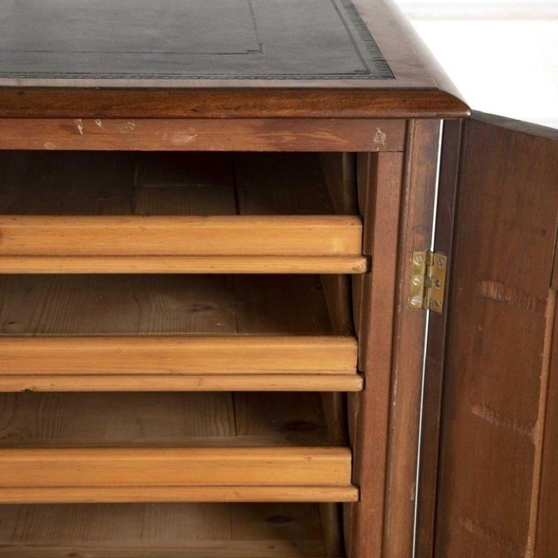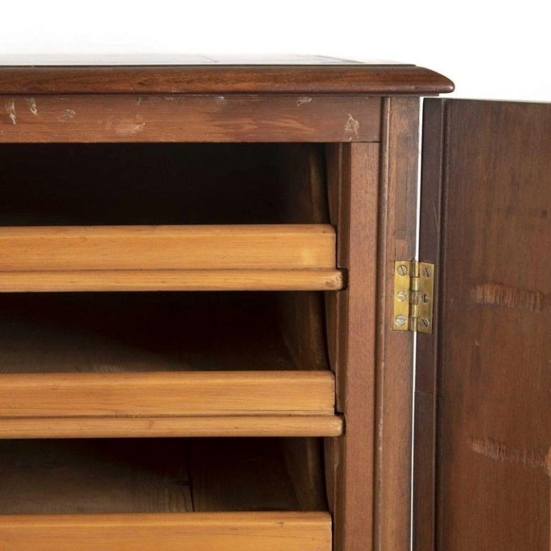 This library cabinet features a hide top over two cross-banded panelled doors with a divided interior inside. It rests on large bun feet with original castors underneath for easy manoeuvrability.
