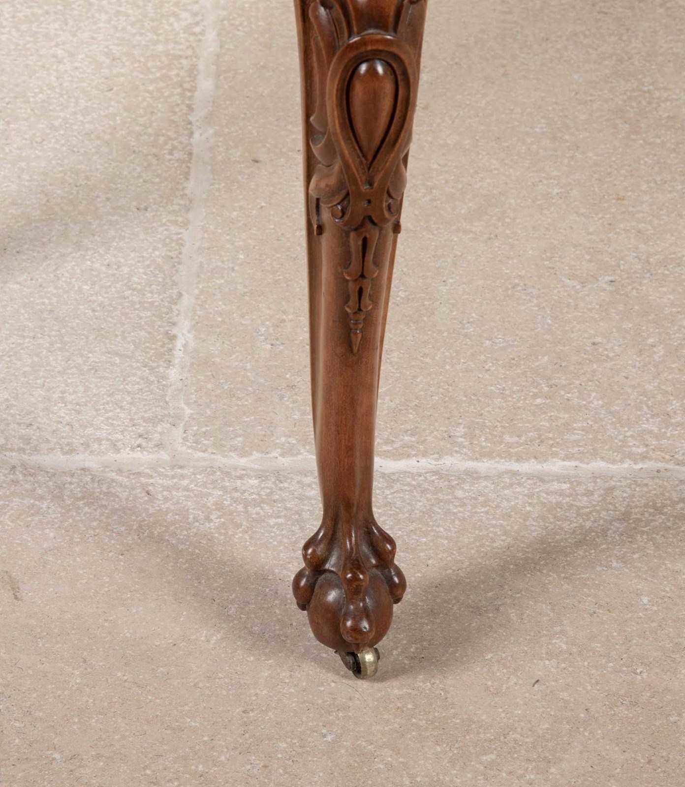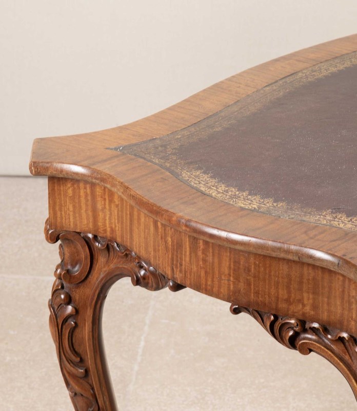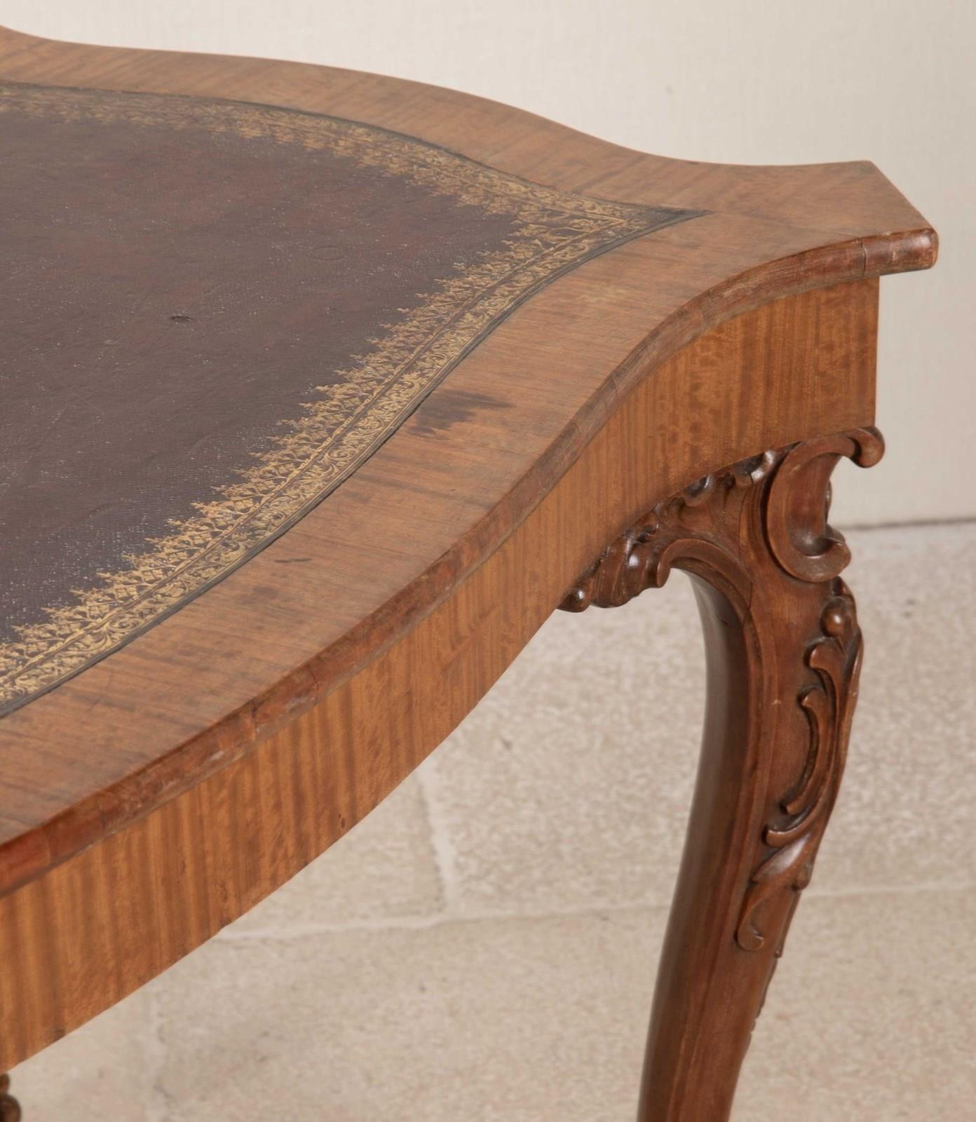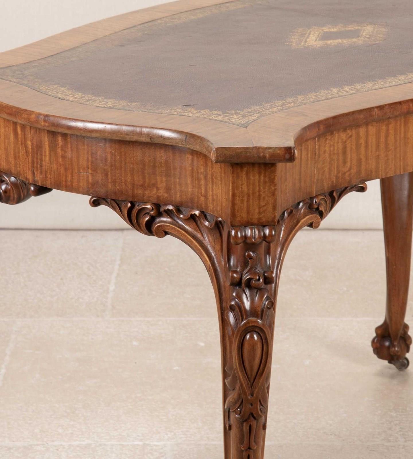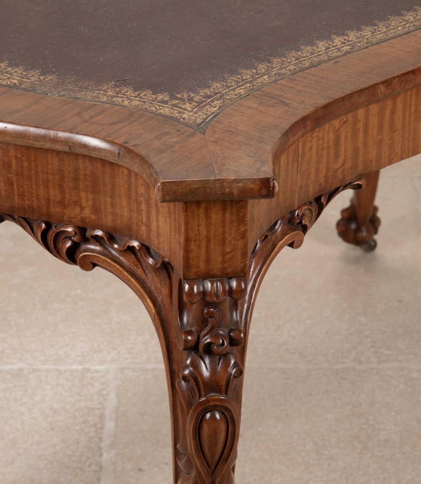 19th Century English satinwood writing table by Gillows.With original leather gilded decoration and cedar drawers. With ball and claw feet on castors, boldly carved decoration on the knee. With scroll top legs and foliate carvings.