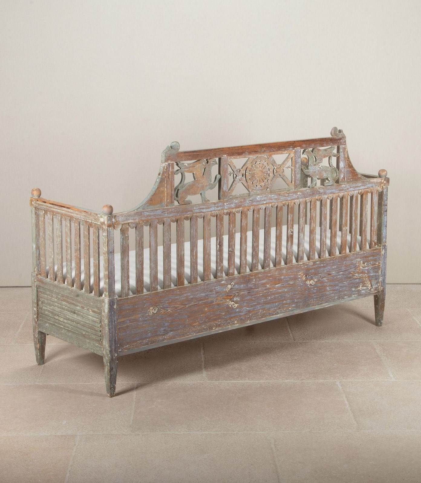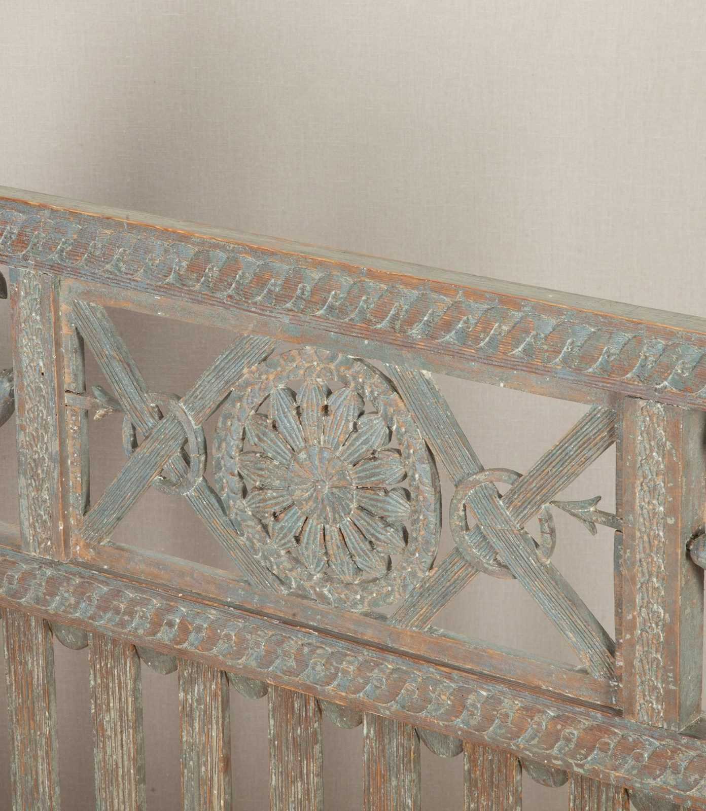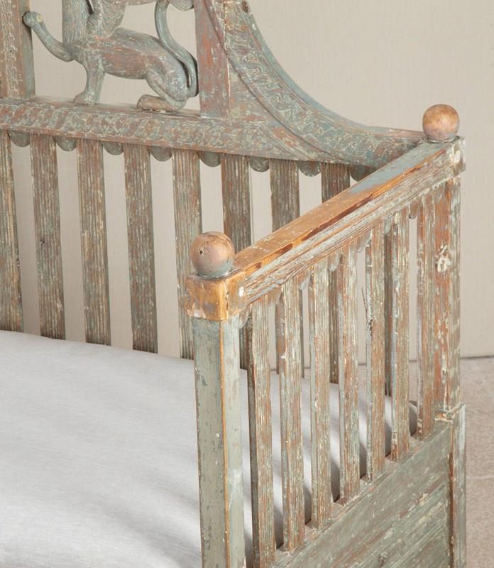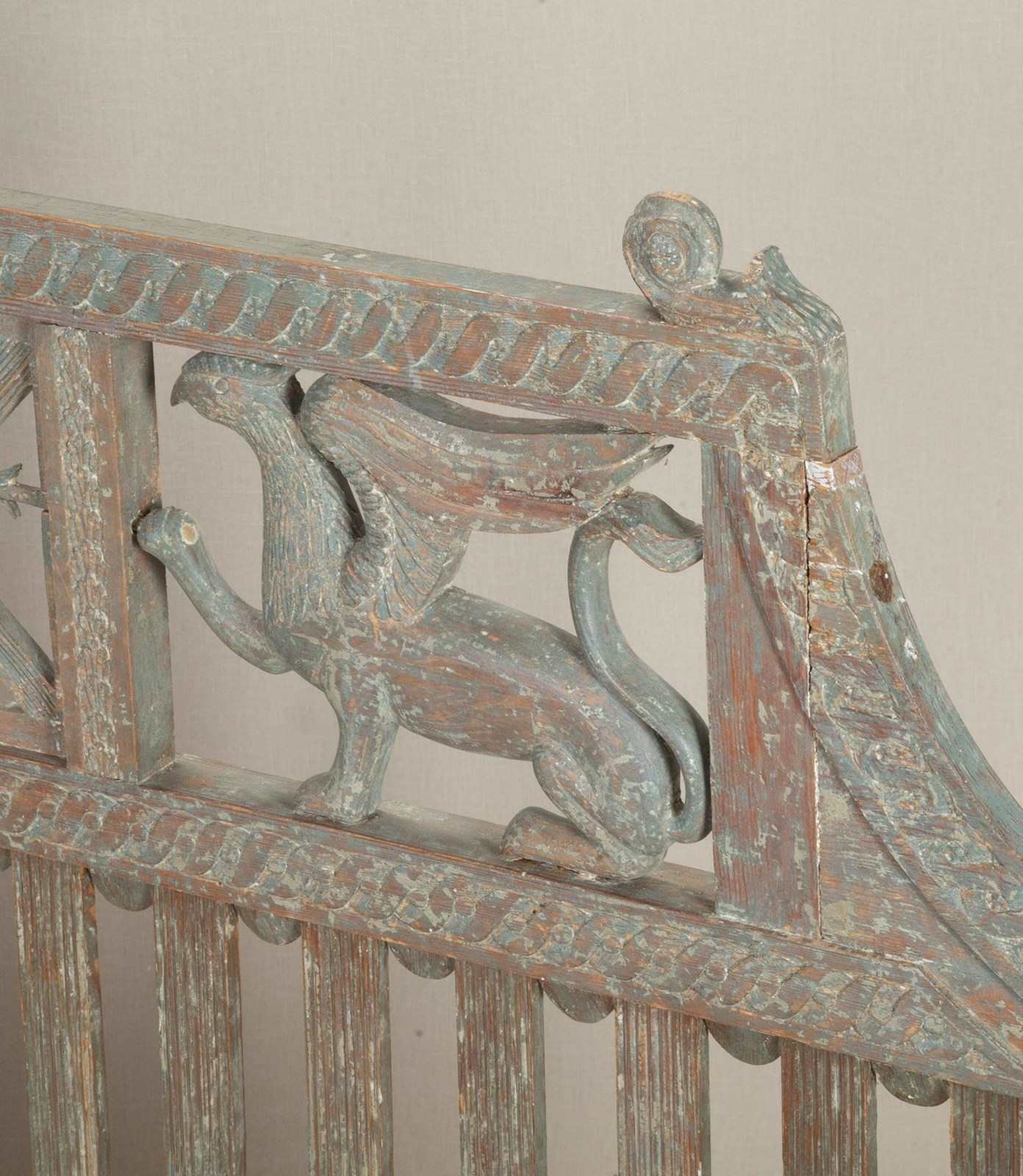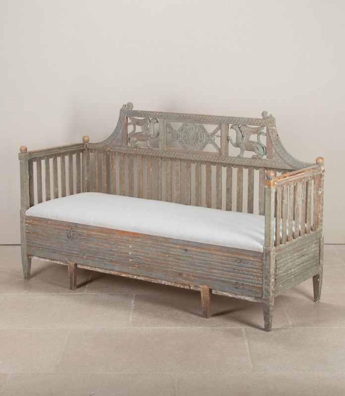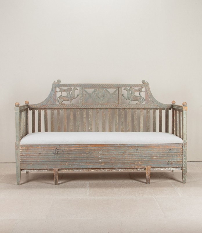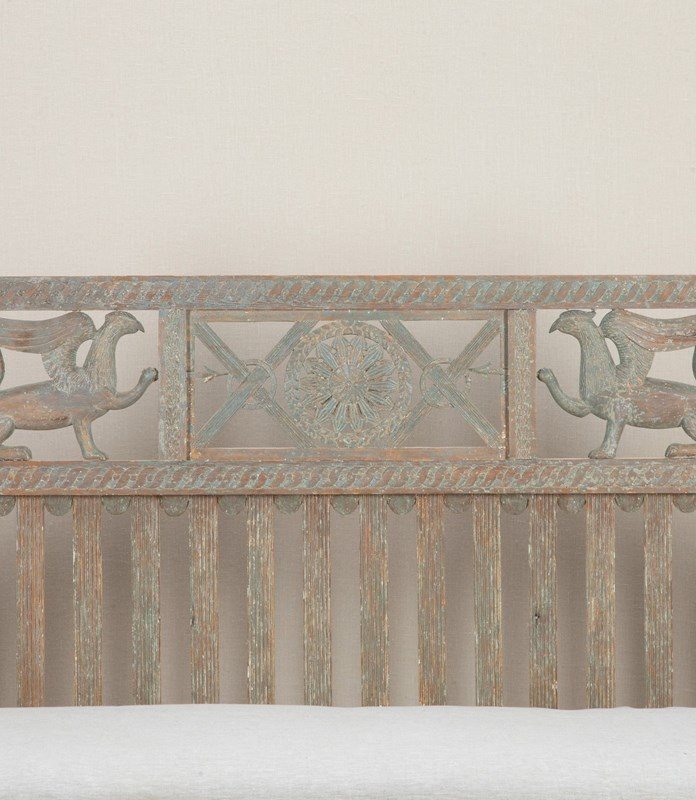 A very beautiful early 19th Century Swedish period Gustavian sofa in original paint. Richly carved paired griffons holding spears pointing to a central sun symbol - a rare model. Circa 1820.