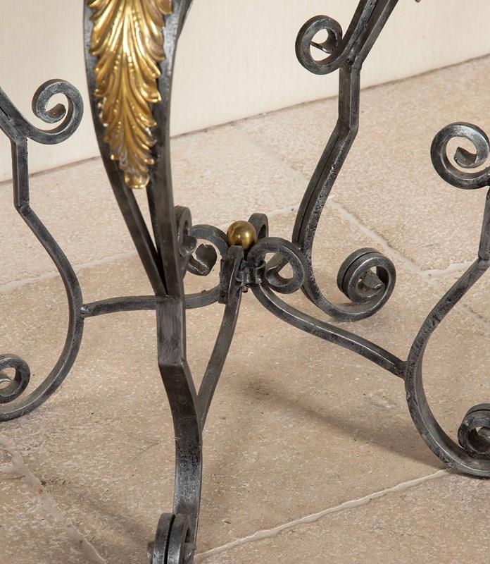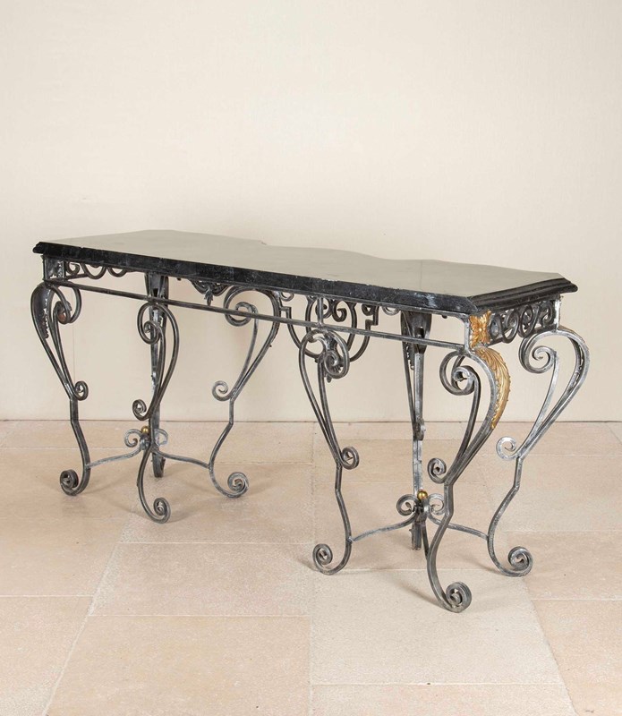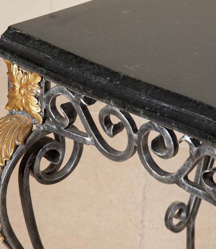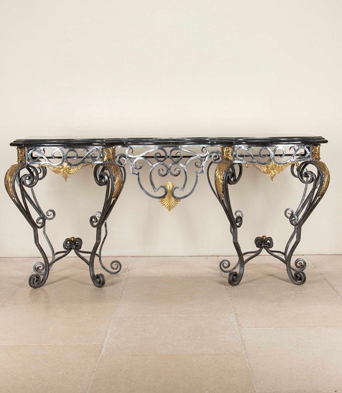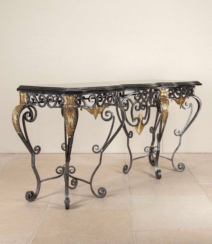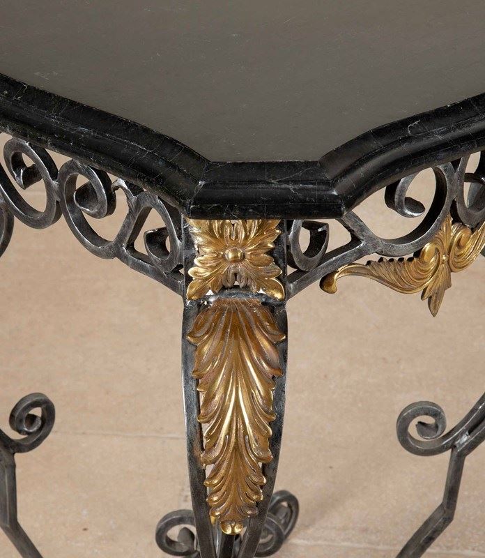 A substantial 20th Century French iron brass and tessellated marble console table.