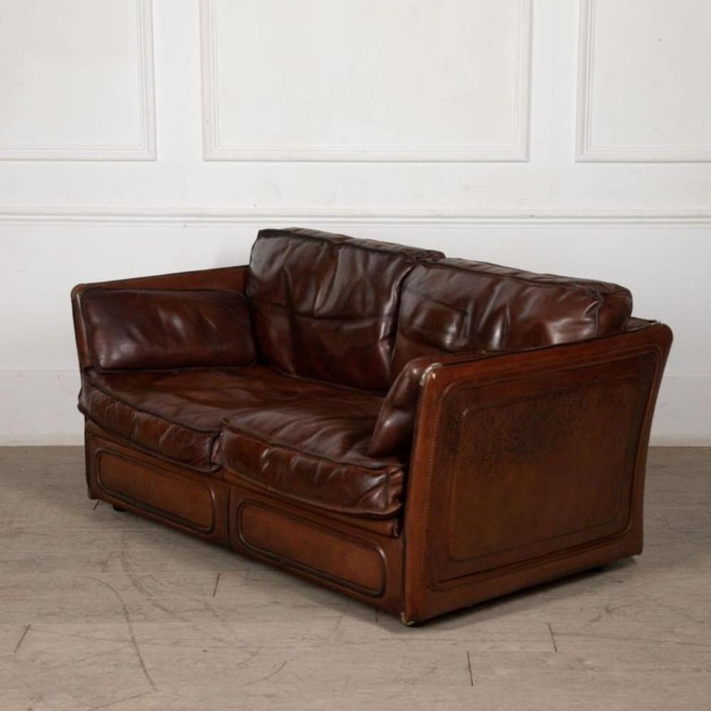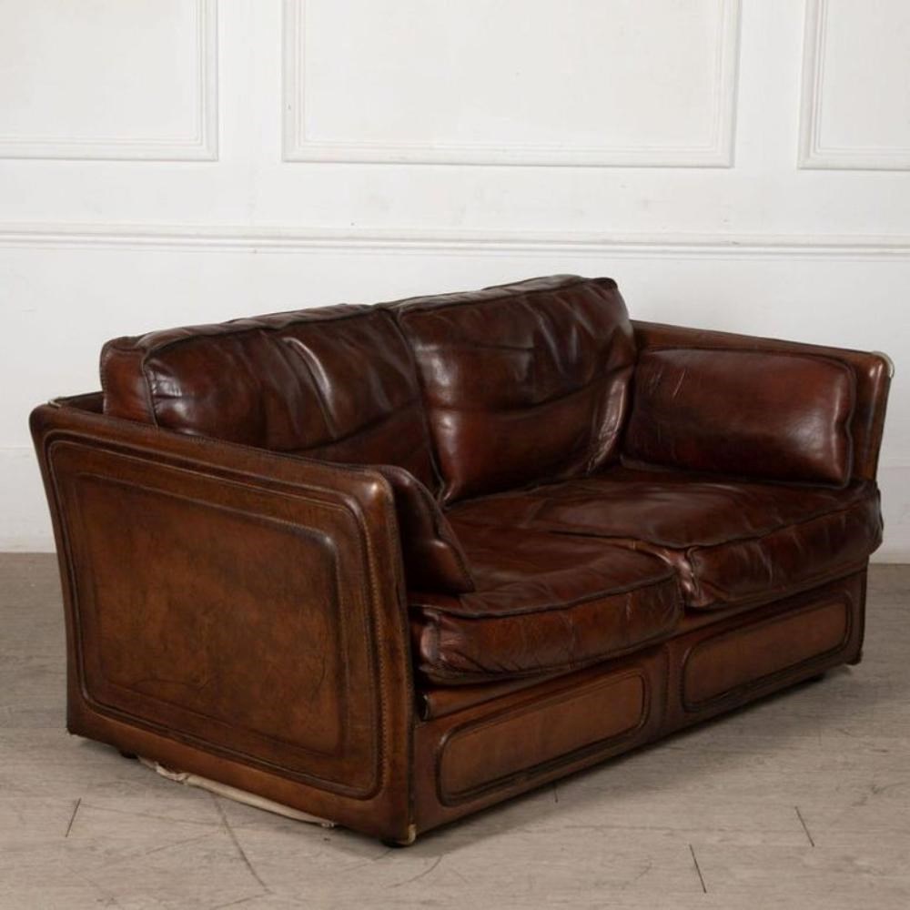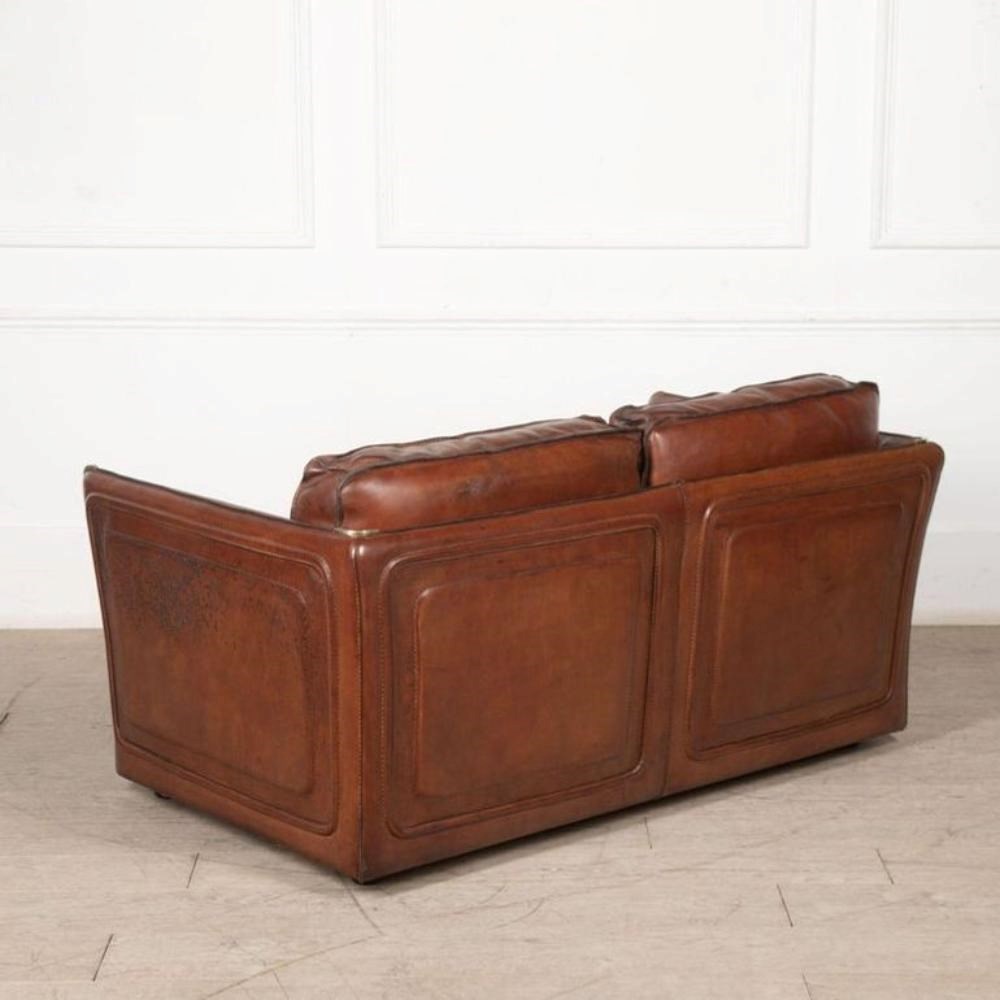A stylish 20th Century French leather two-seater sofa is covered in sumptuous thick saddle leather with stitched edges and metal corner details.