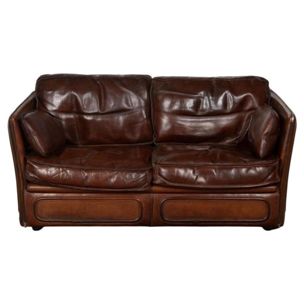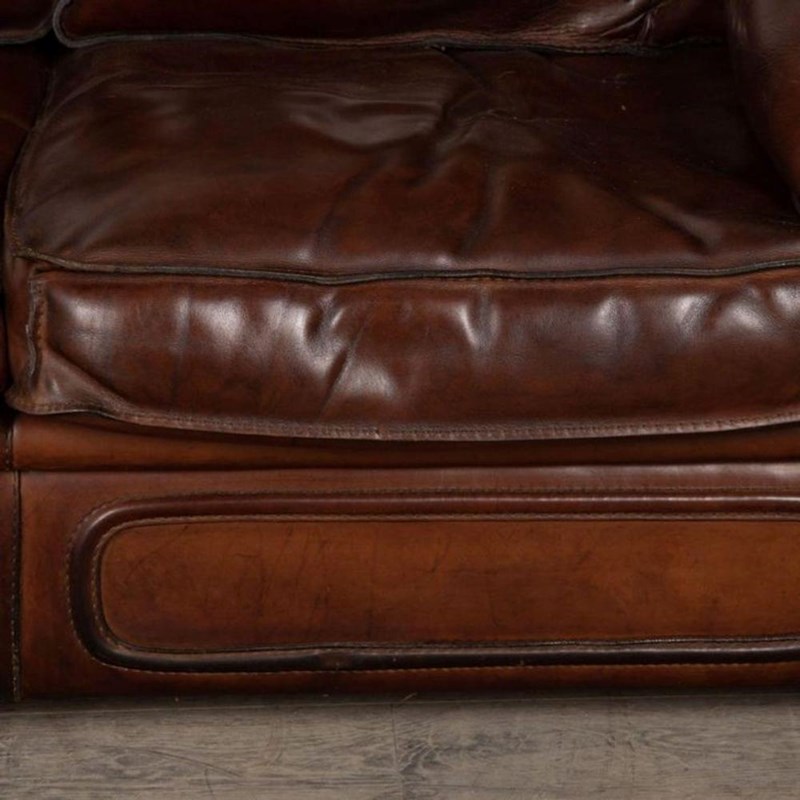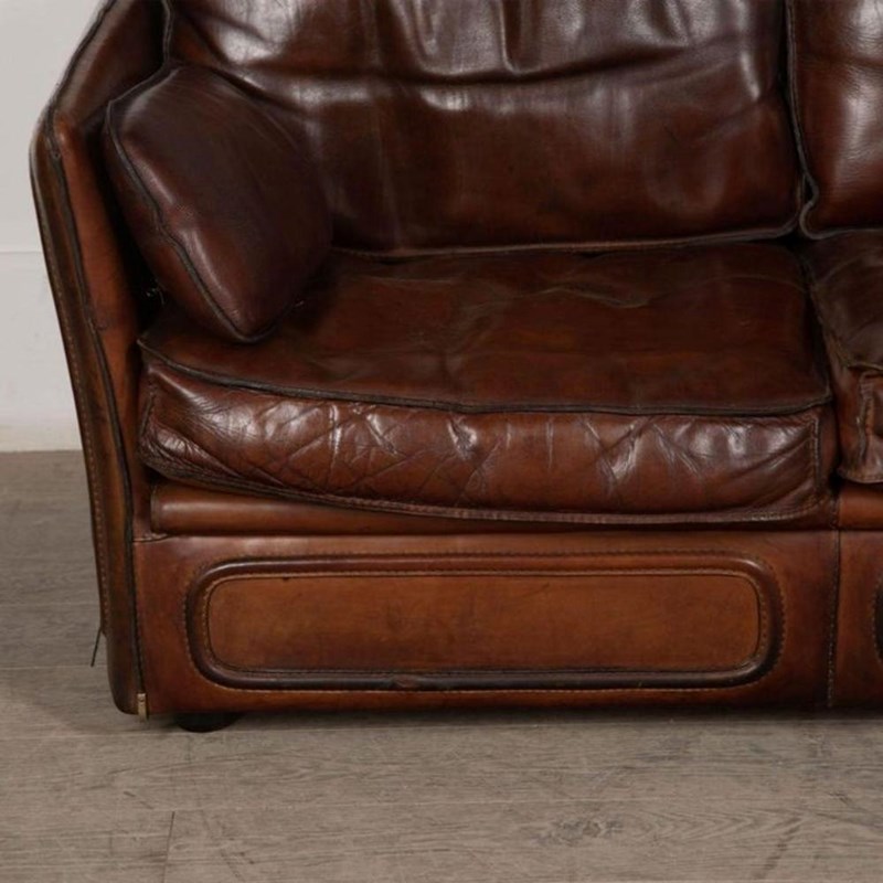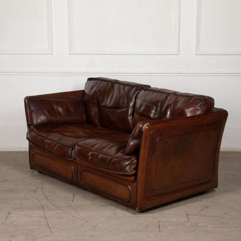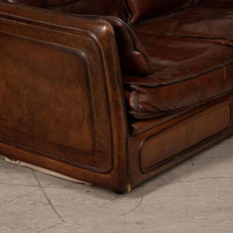 A stylish 20th Century French leather two-seater sofa is covered in sumptuous thick saddle leather with stitched edges and metal corner details.