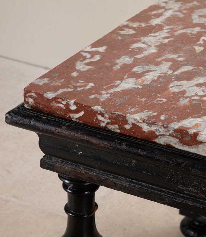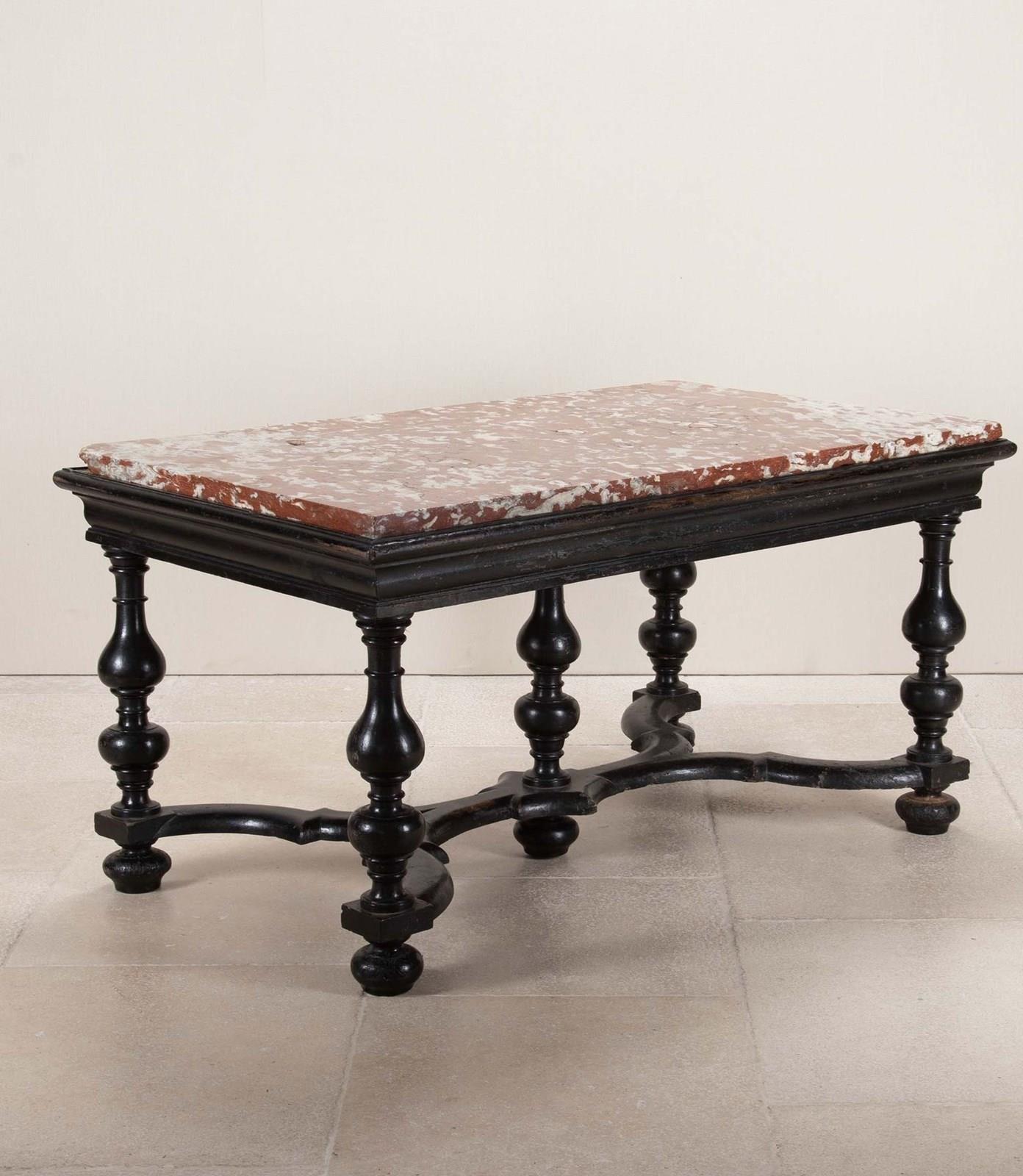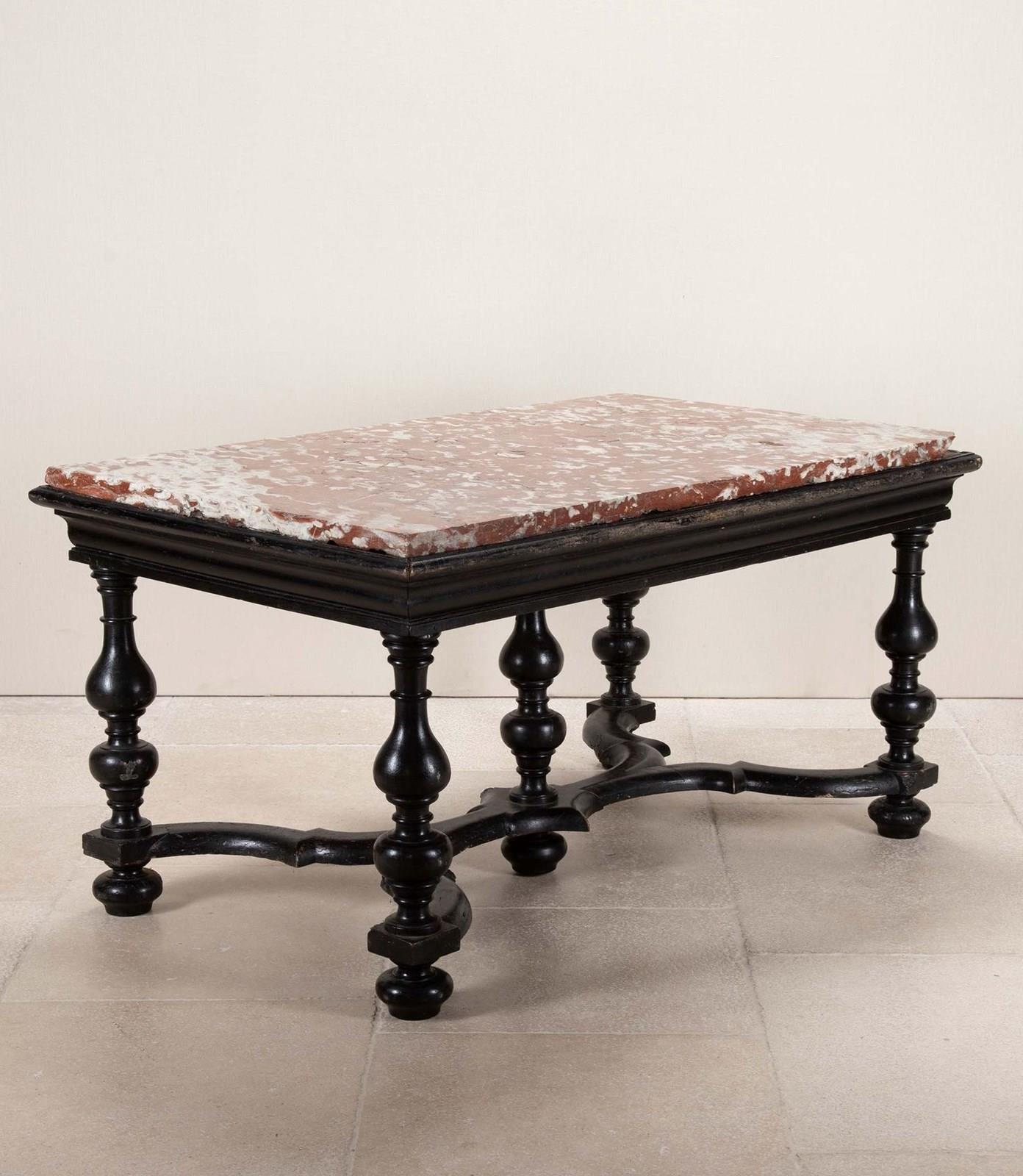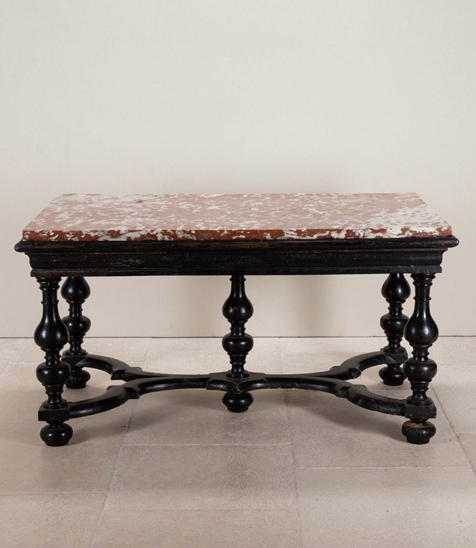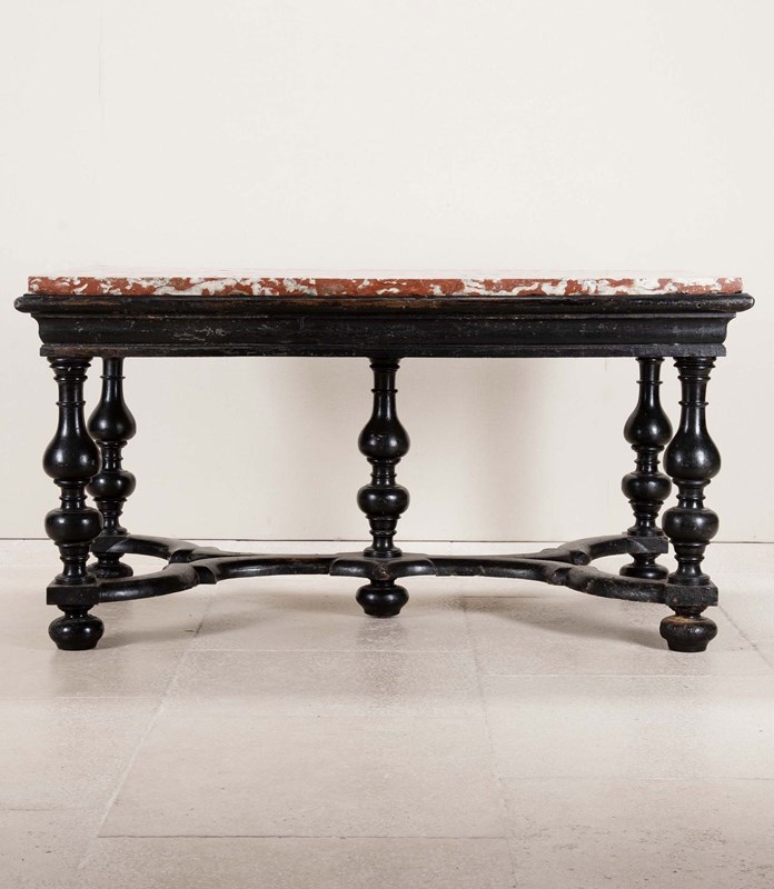 A late Louis XIV or Regence period centre table. Likely originating from South-West France, the ebonised base of five elegantly turned legs are united by a bold X stretcher, the whole supporting an original and stunning 'Rouge du Languedoc' marble top of almost 3' thickness. An important piece of French provincial furniture at it's grandest, yet retaining the simplicity of country influence, this is a genuine statement piece that will command attention in traditional and contemporary settings alike.