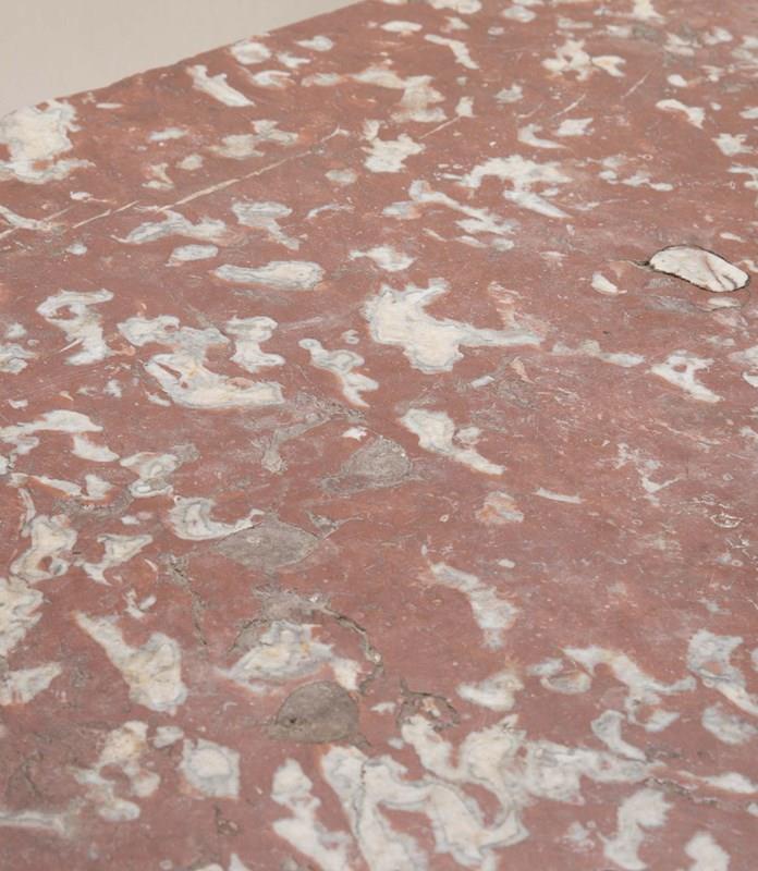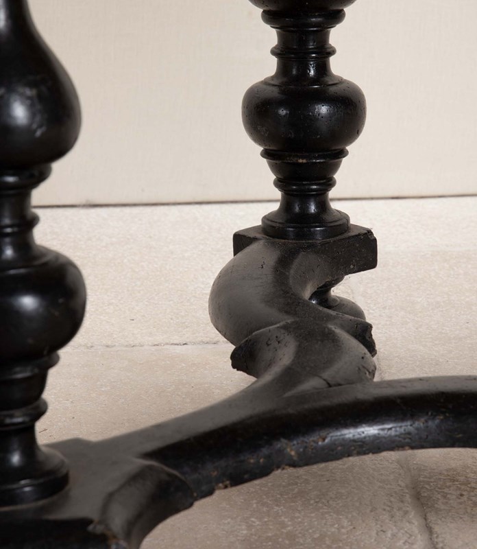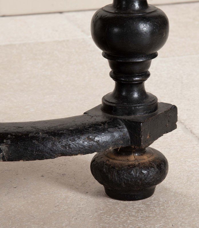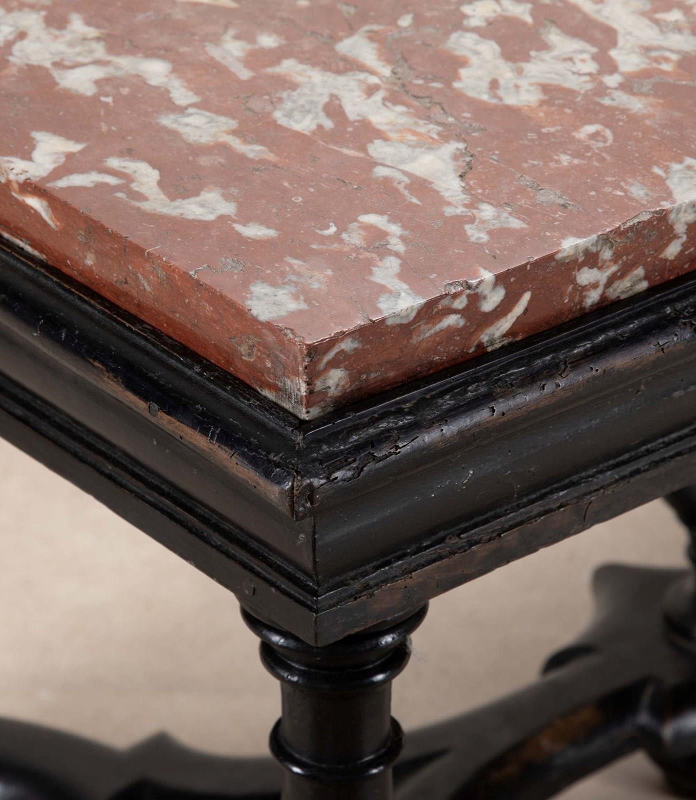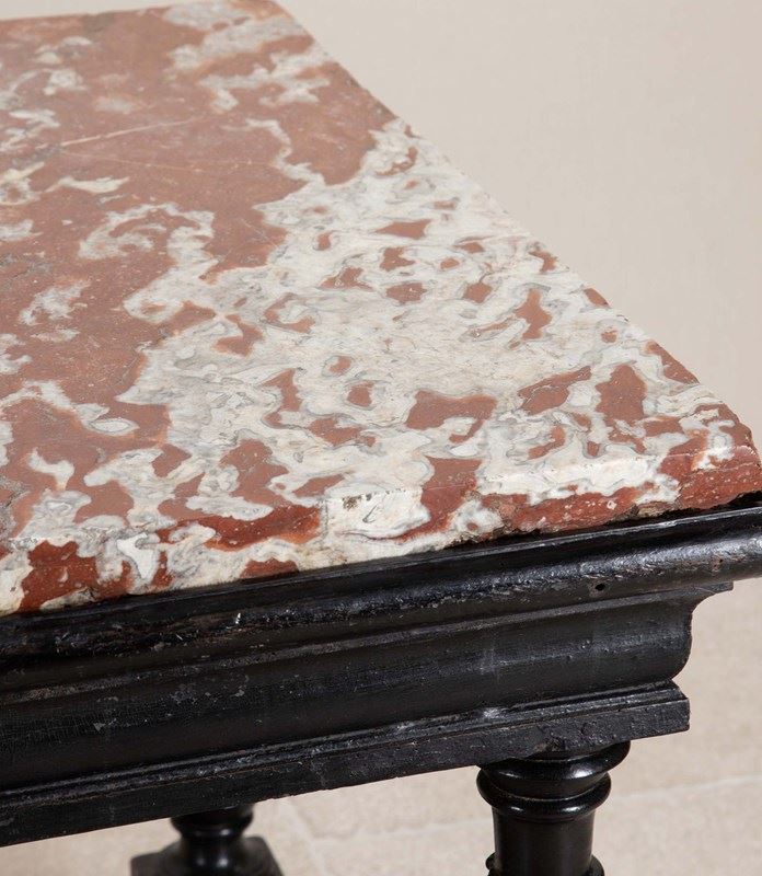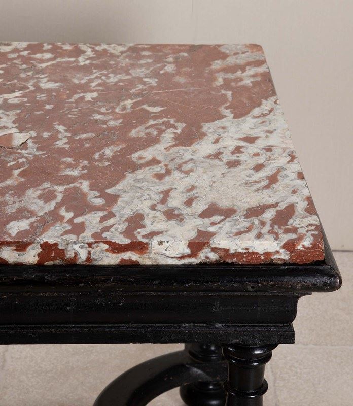 A late Louis XIV or Regence period centre table. Likely originating from South-West France, the ebonised base of five elegantly turned legs are united by a bold X stretcher, the whole supporting an original and stunning 'Rouge du Languedoc' marble top of almost 3' thickness. An important piece of French provincial furniture at it's grandest, yet retaining the simplicity of country influence, this is a genuine statement piece that will command attention in traditional and contemporary settings alike.