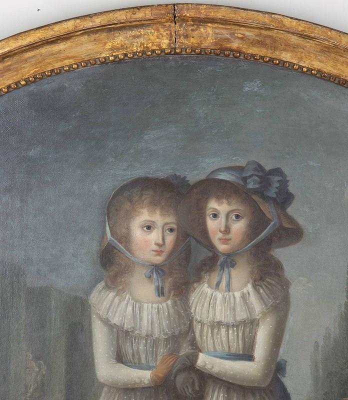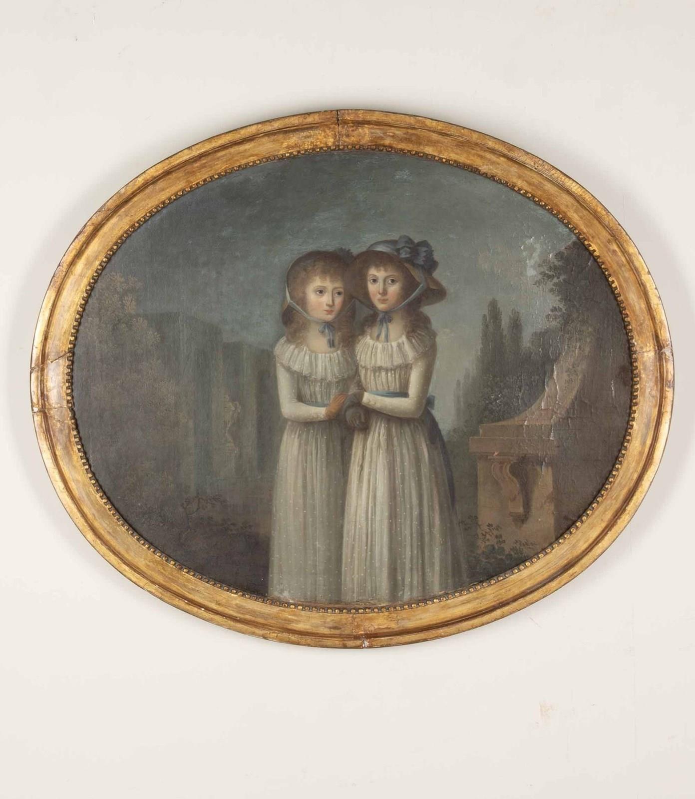 Wonderful early 19th Century English oil on canvas oval painting of sisters.