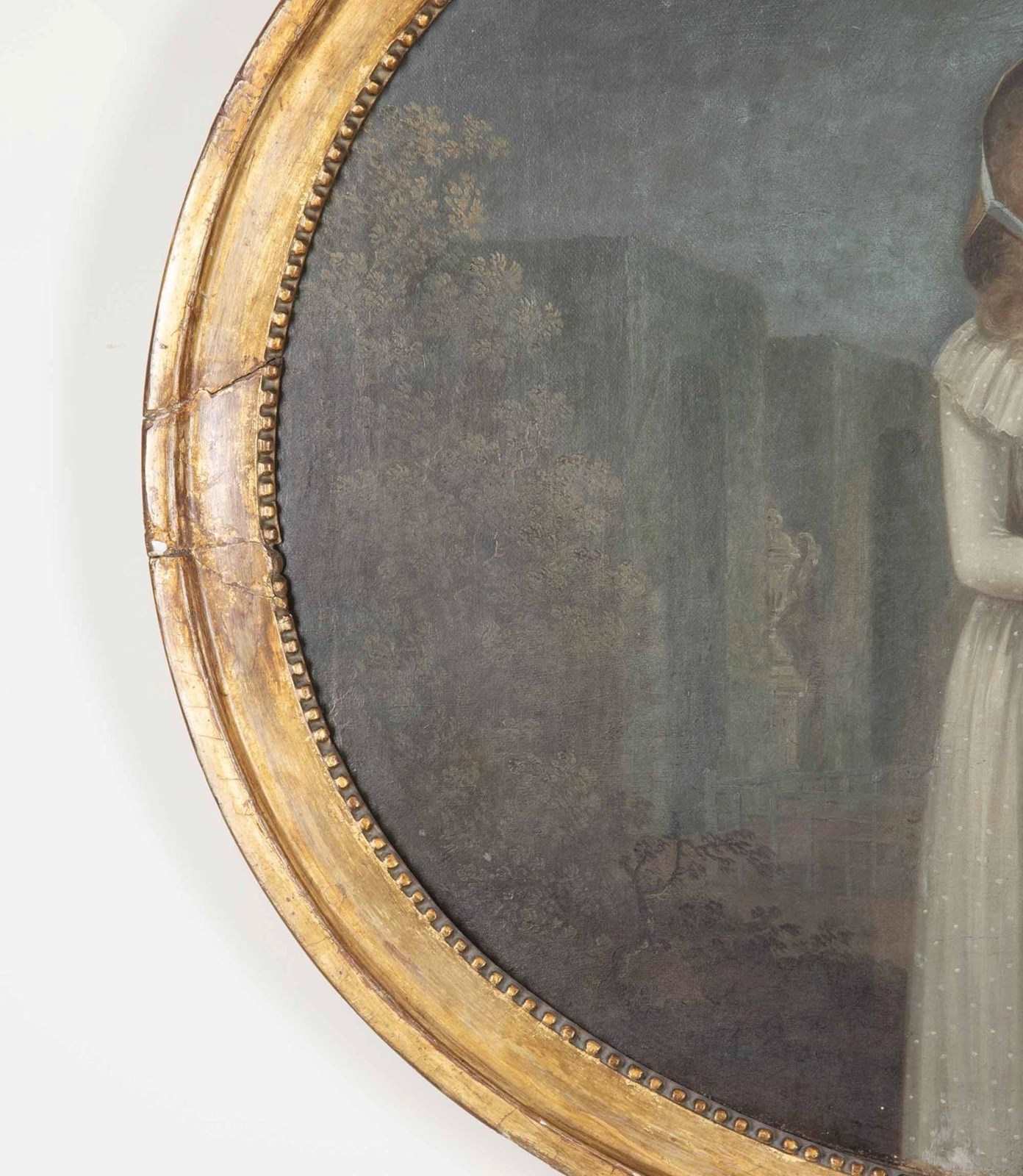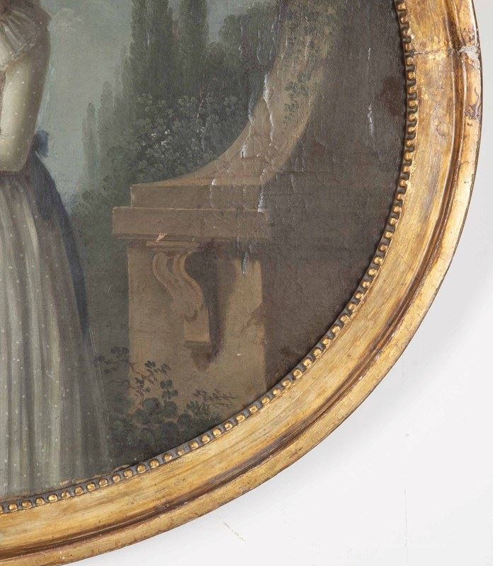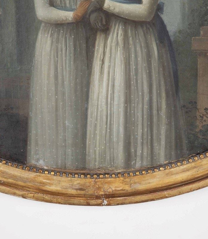 In the naive style, the two central girls are dress in Regency clothes and standing together in a classical garden. Original gilt frame, Circa 1810.