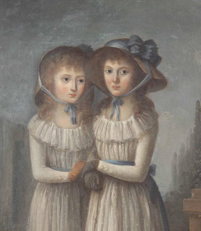 Early 19Th Century English Oil On Canvas Painting Of Regency Twin Sisters