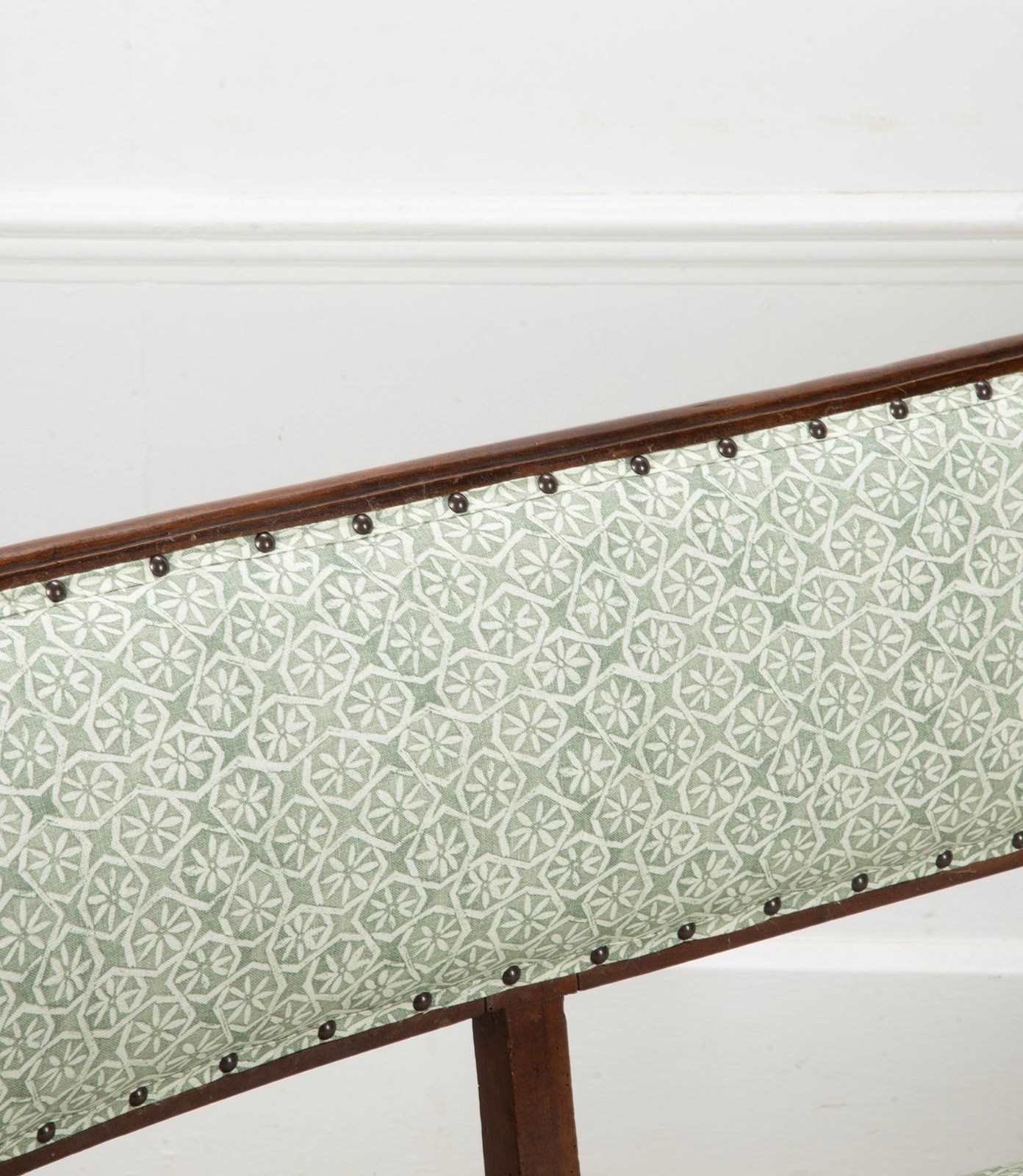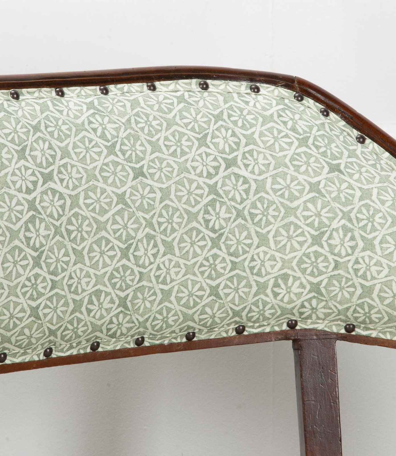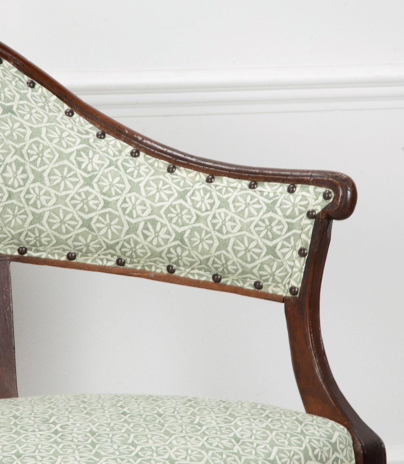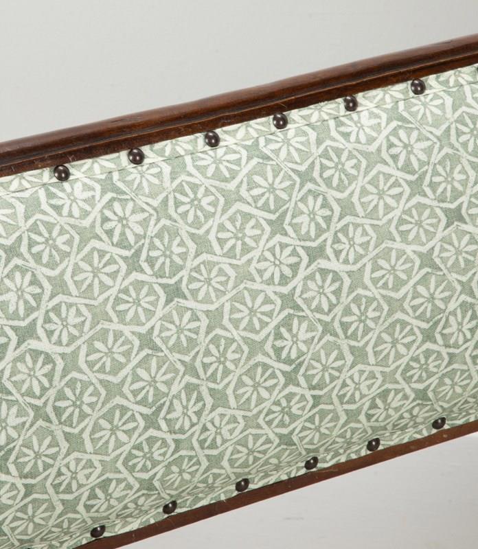 With elegant curved upholstered back and recently reupholstered in Carolina Irvine Andaluz - Lichen.