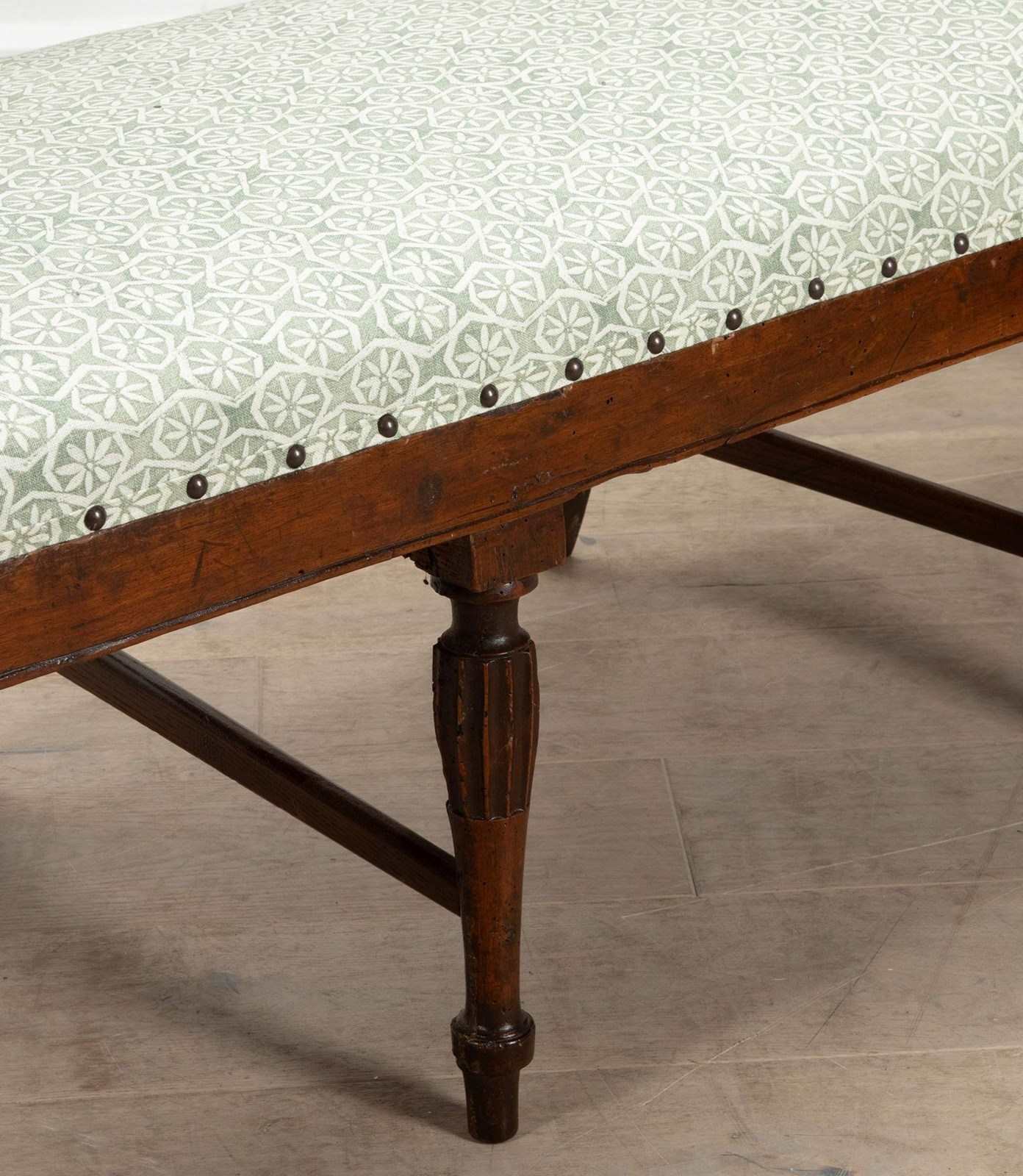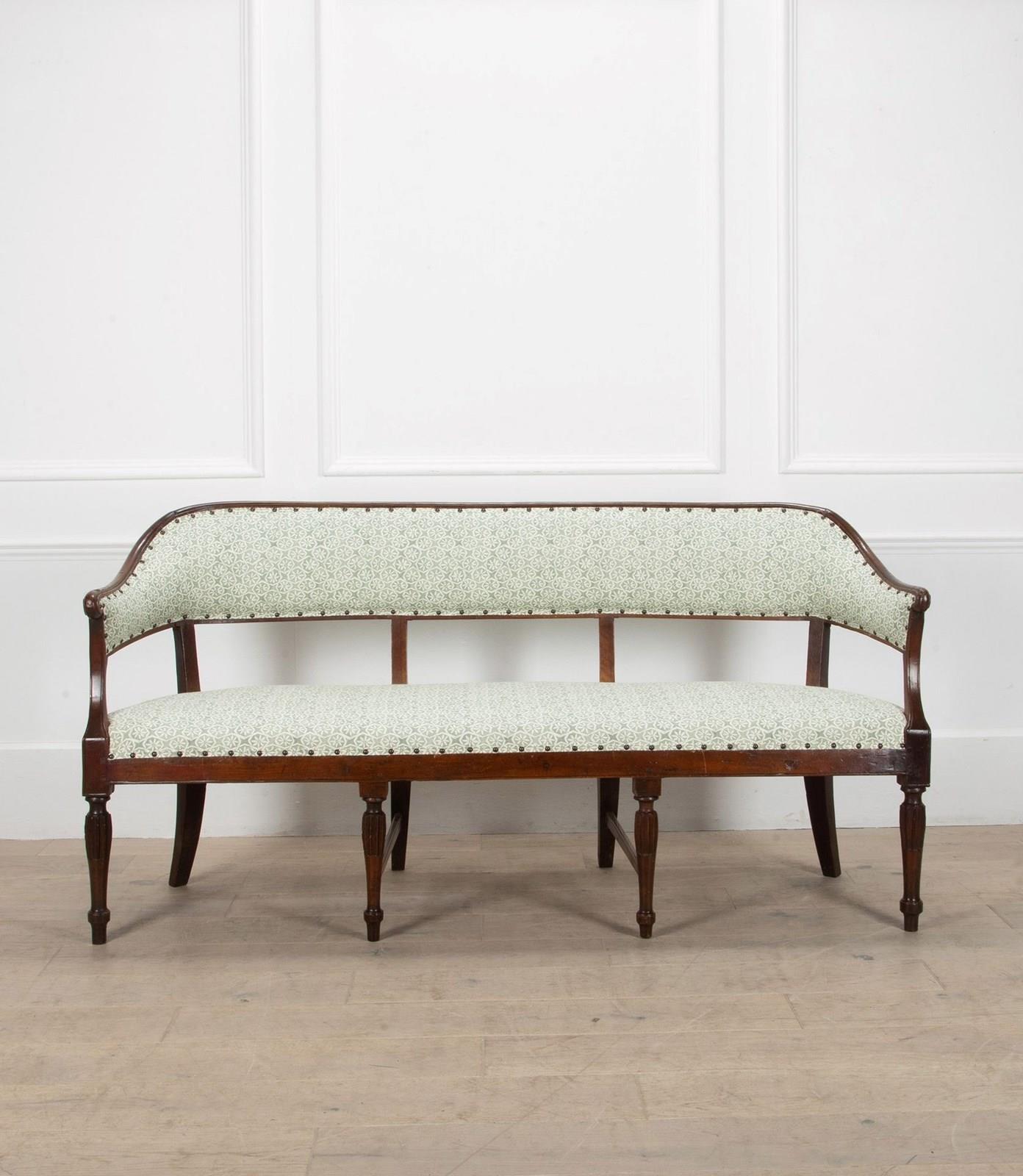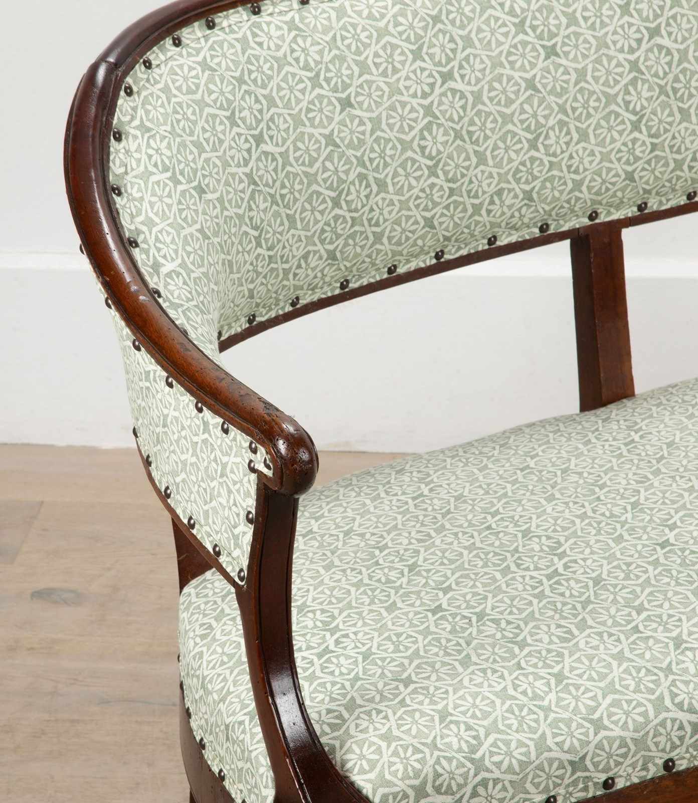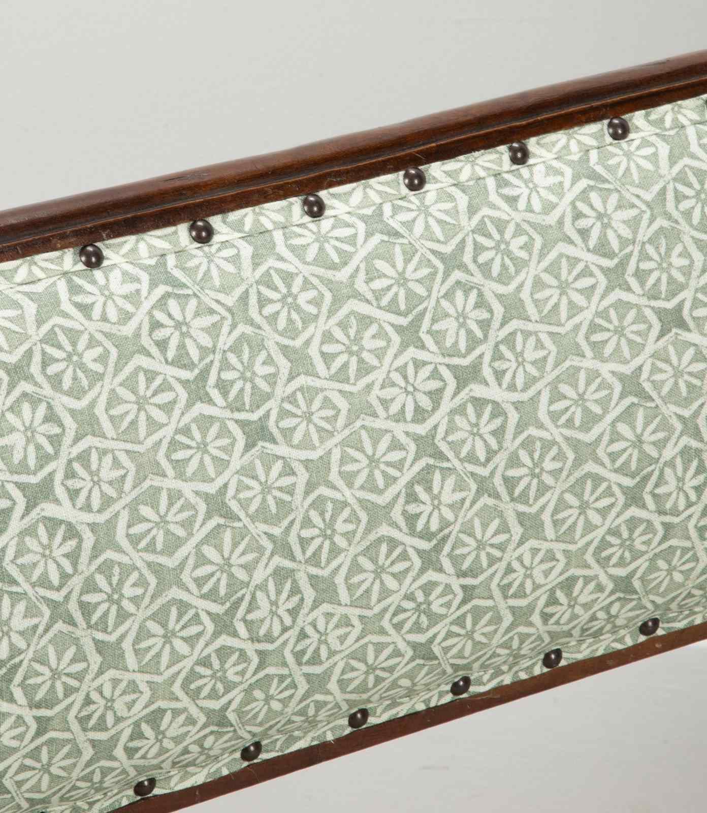 With elegant curved upholstered back and recently reupholstered in Carolina Irvine Andaluz - Lichen.