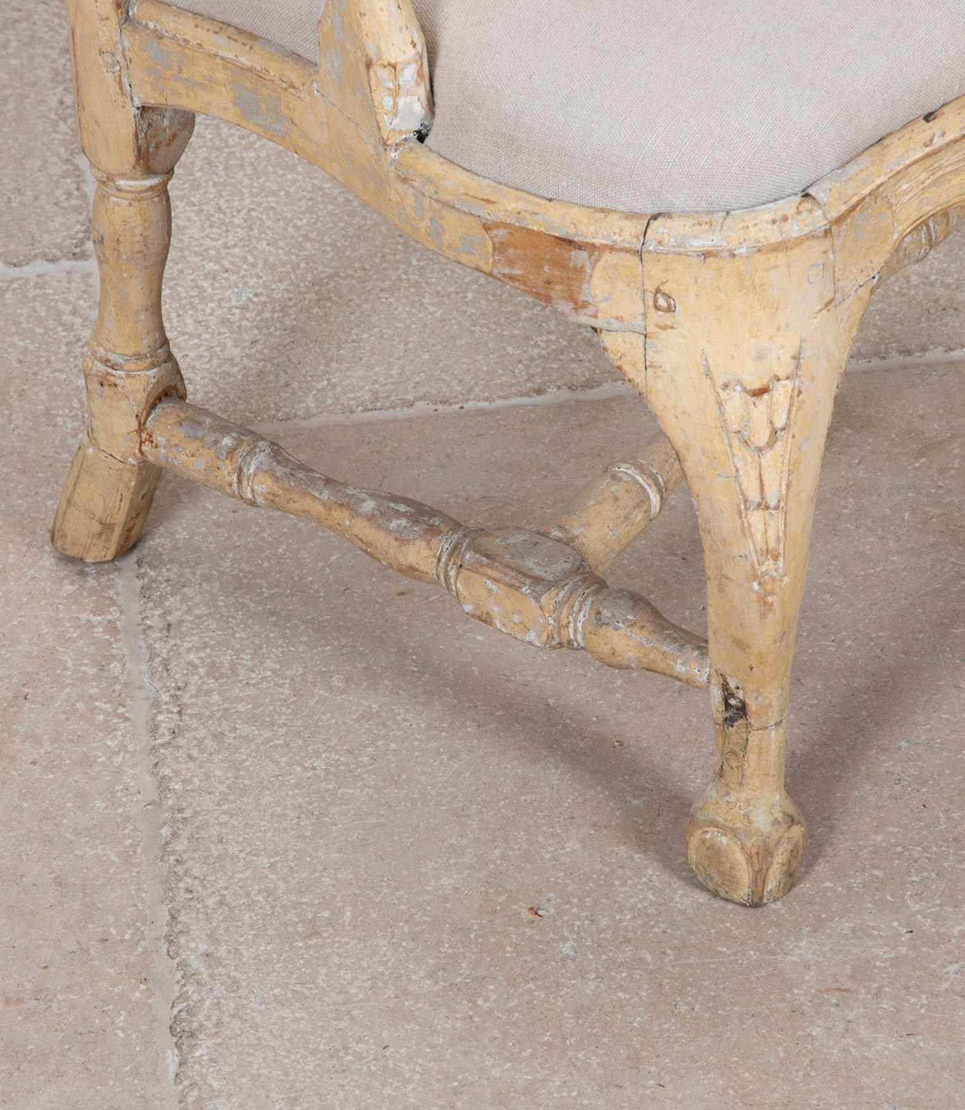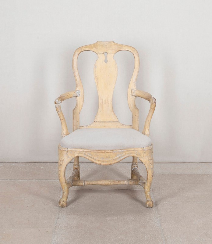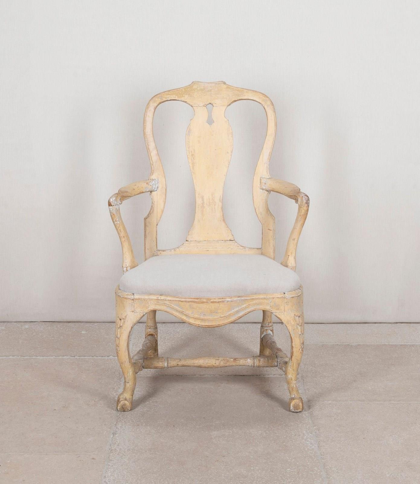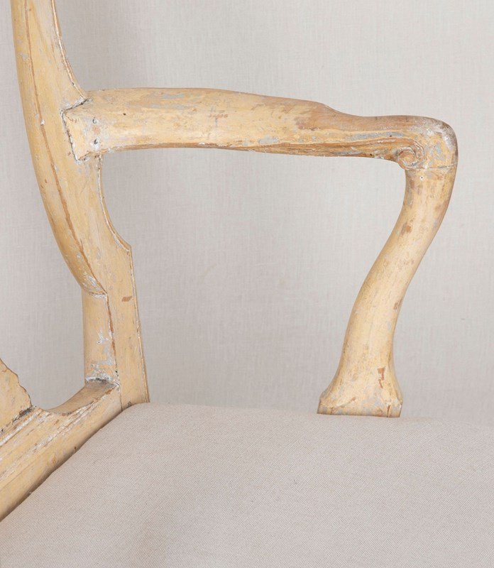 With an elegant pierced splat and shaped back framed by sweeping open arms. The painted frame retains a beautifully timeworn surface with soft, worn highlights and traces of earlier paint, raised on cabriole legs united by stretchers. The seat is upholstered in a neutral textile, ready to place within an interiors scheme.