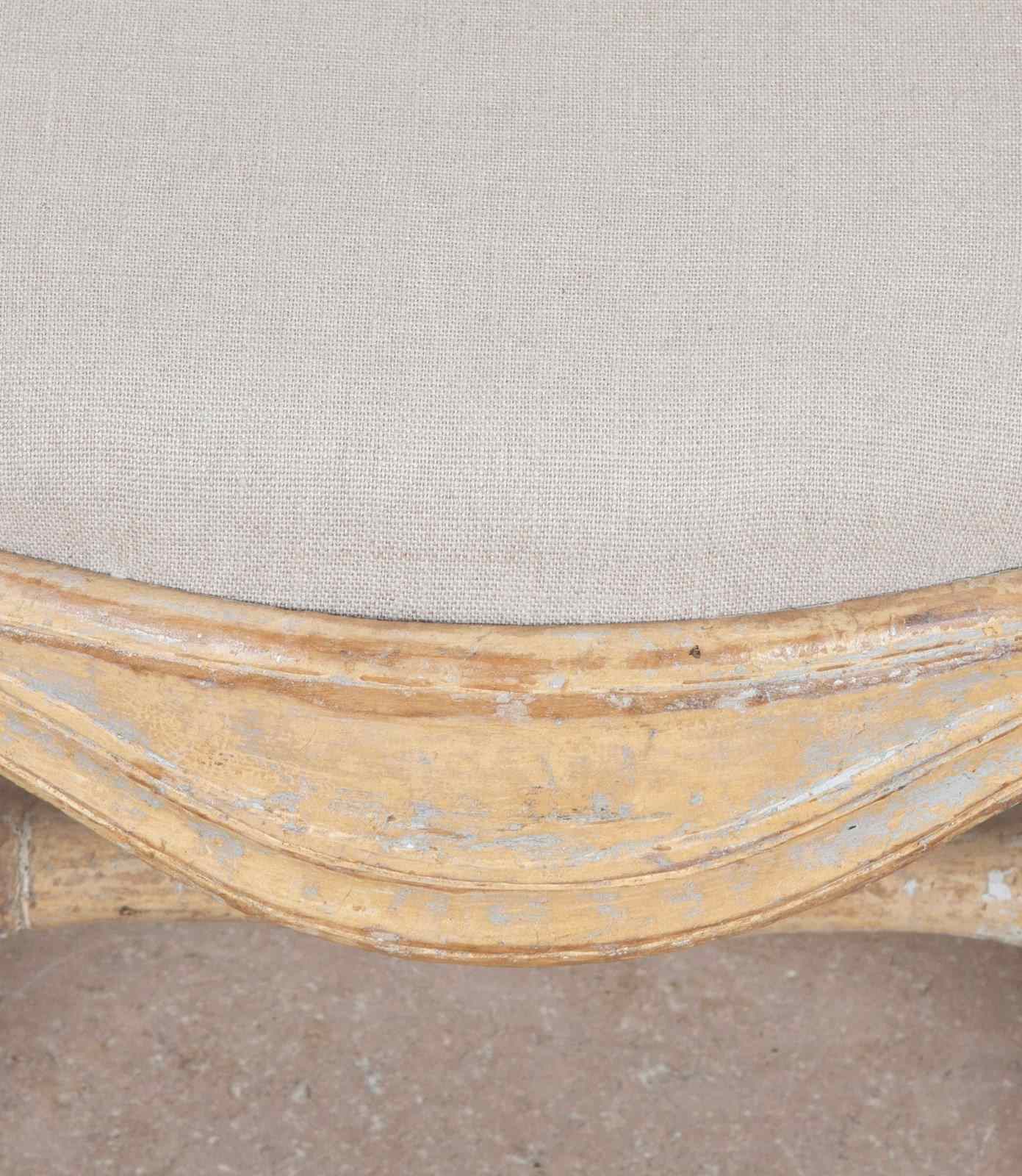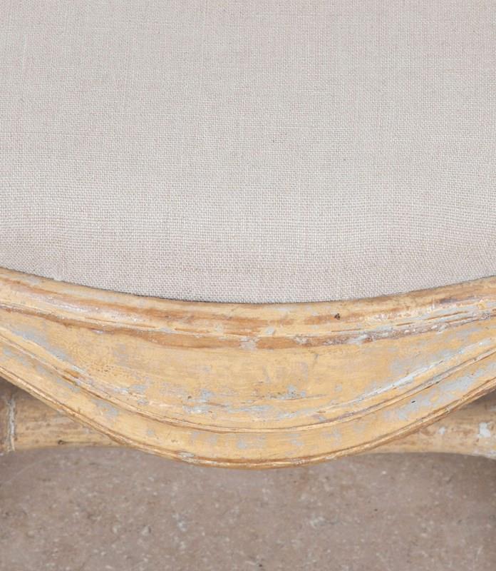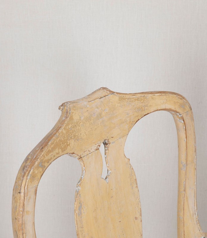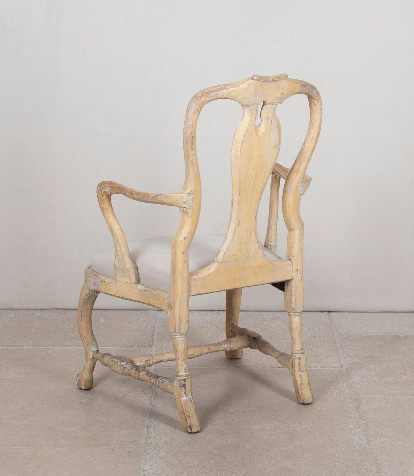 With an elegant pierced splat and shaped back framed by sweeping open arms. The painted frame retains a beautifully timeworn surface with soft, worn highlights and traces of earlier paint, raised on cabriole legs united by stretchers. The seat is upholstered in a neutral textile, ready to place within an interiors scheme.