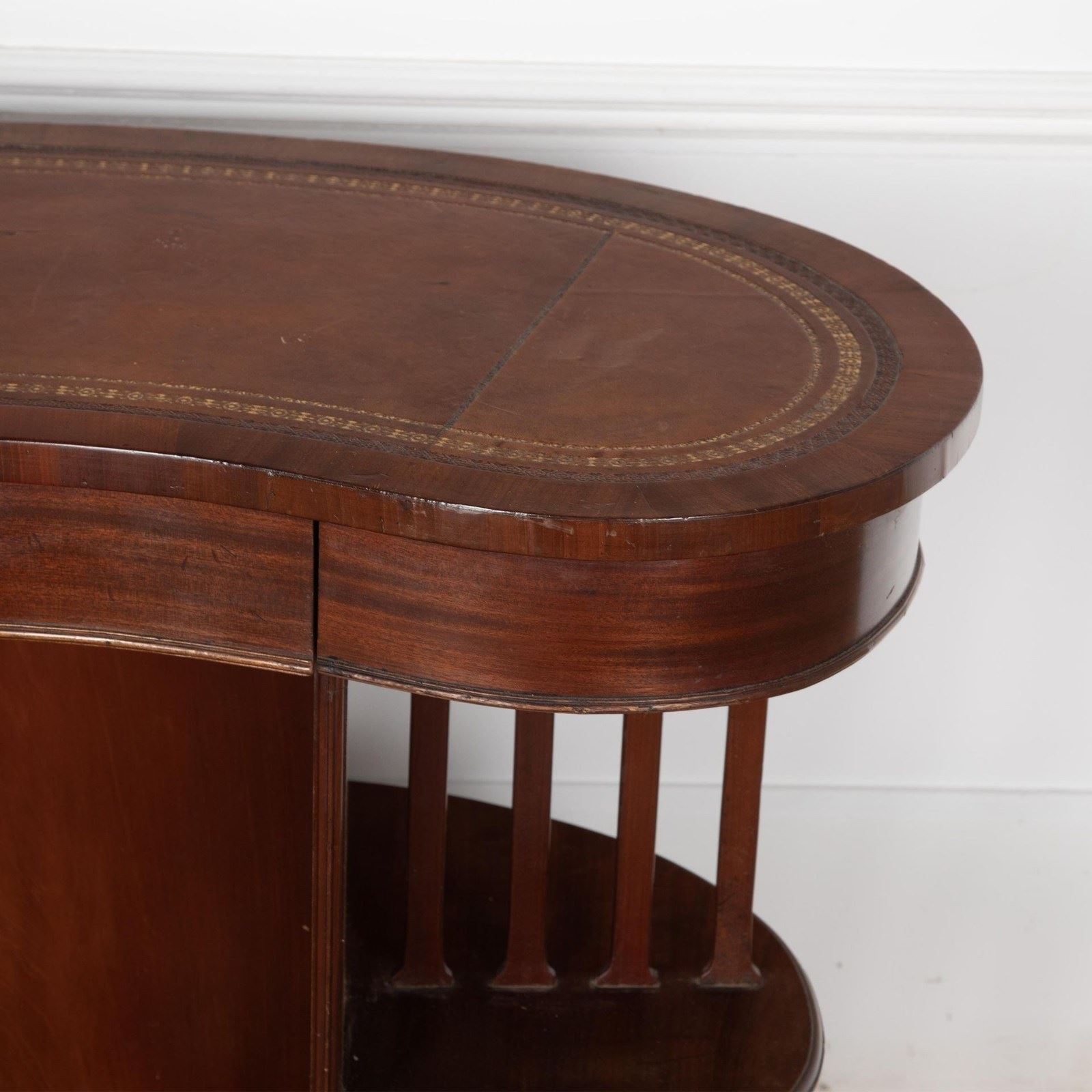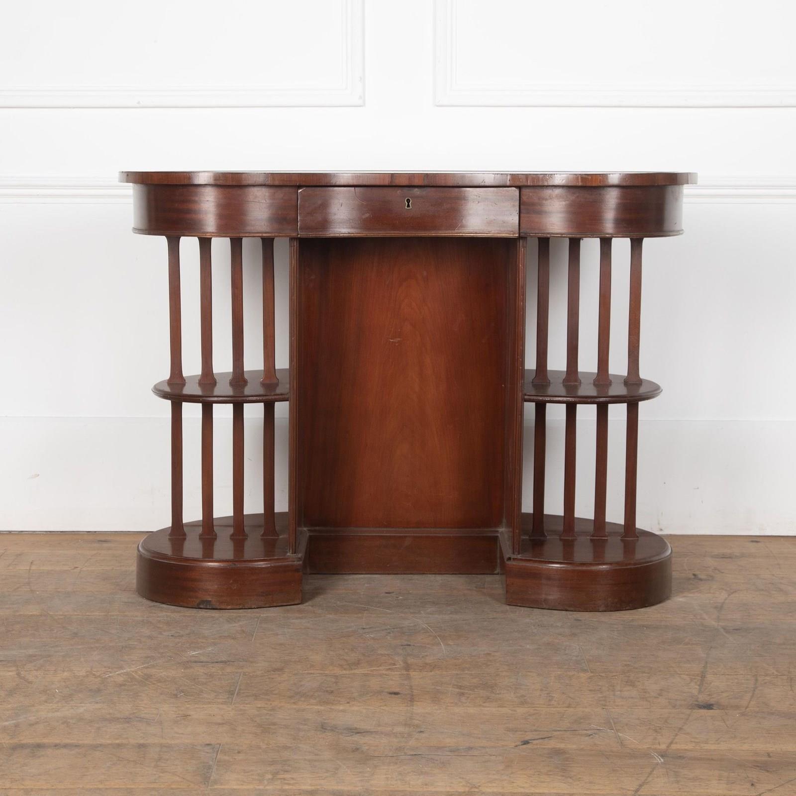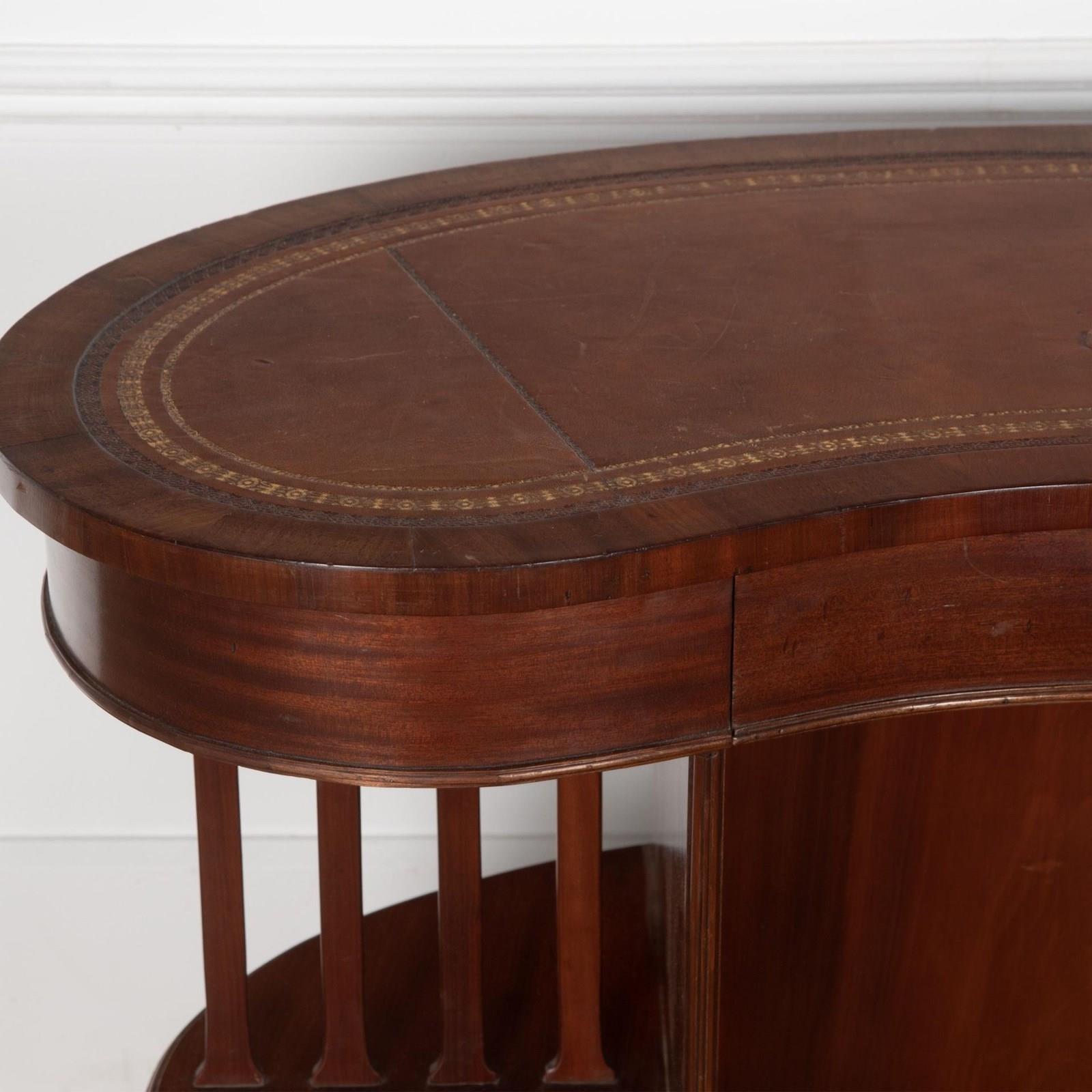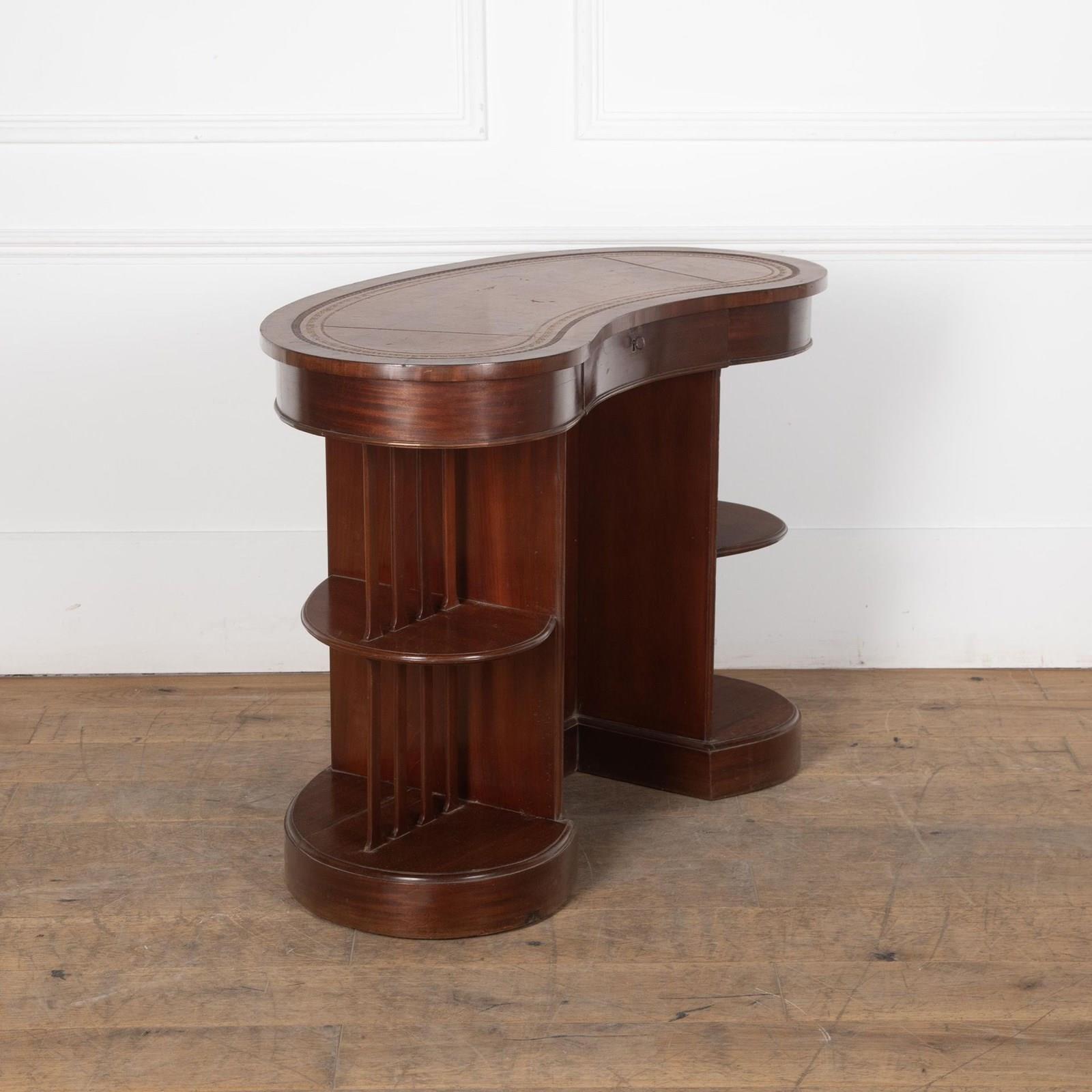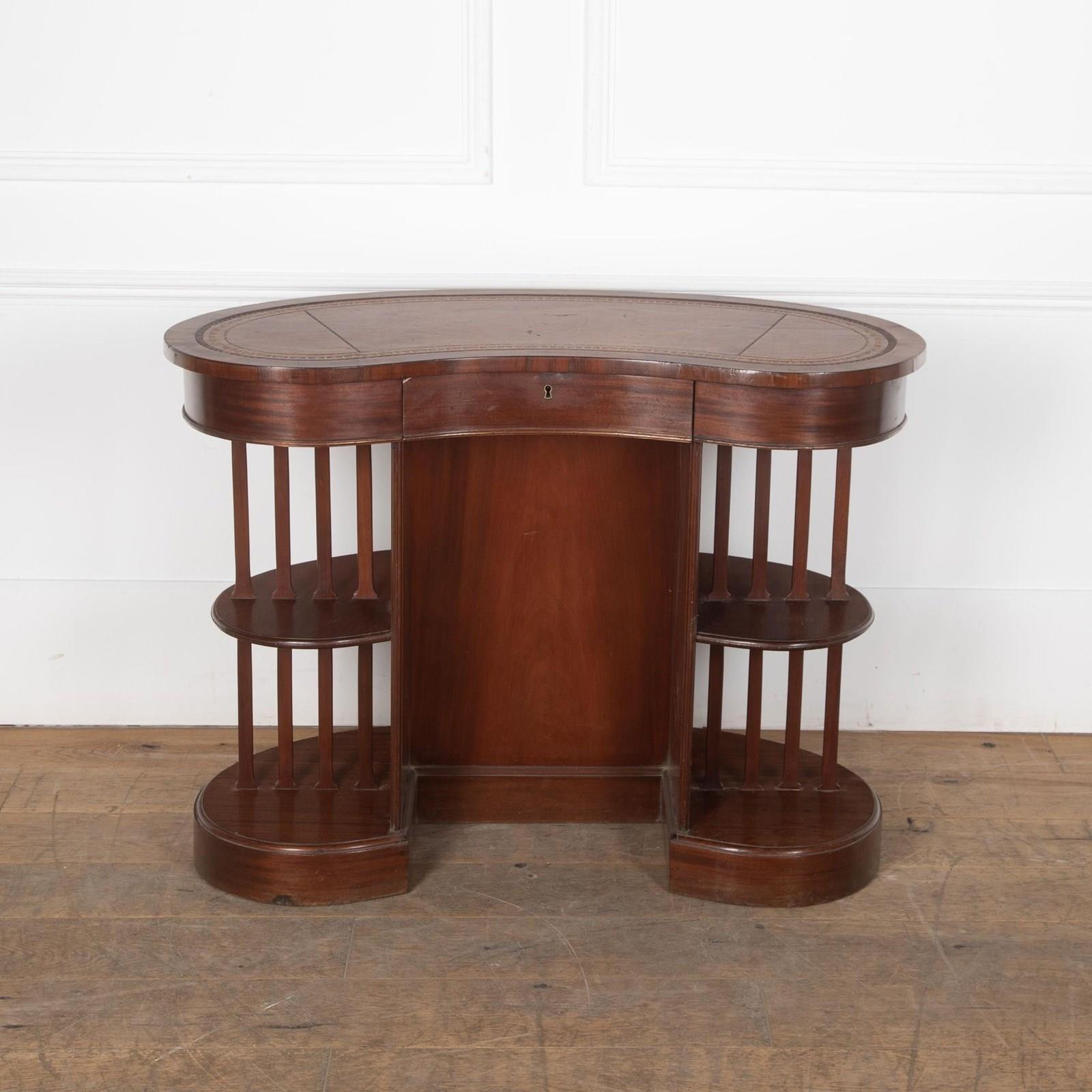 20th Century Edwardian mahogany skeleton kidney desk.With a single drawer in the frieze and original leather top. As is traditional it has shelves at the back, and the sides are unusual being open tiers separated by slats.With some minor signs of wear, commensurate with age.