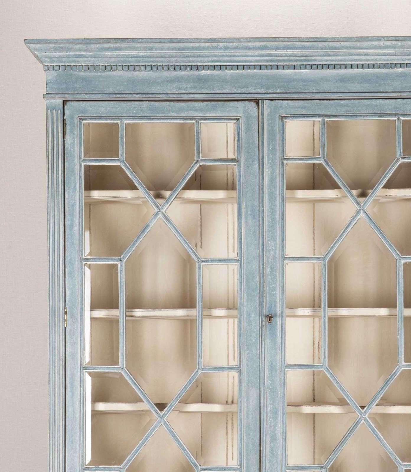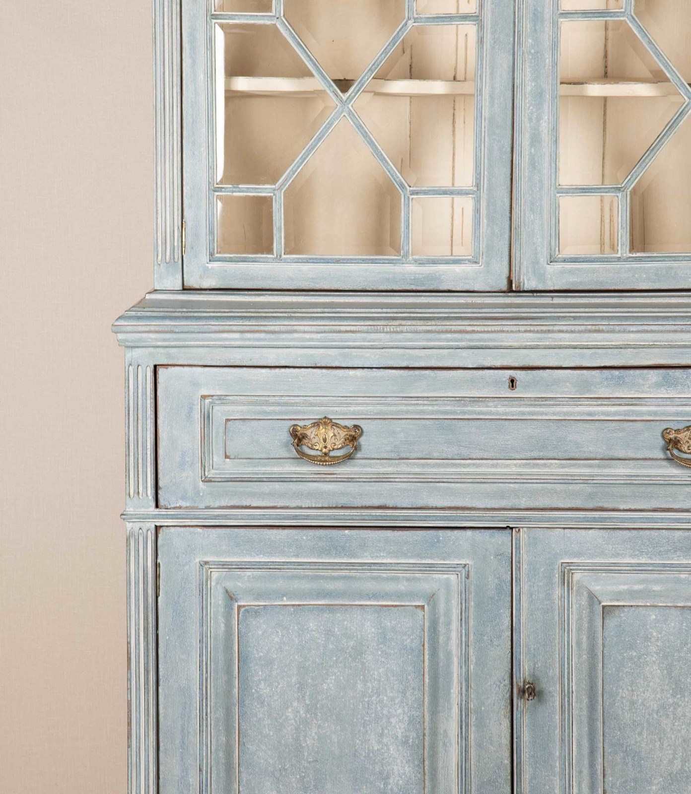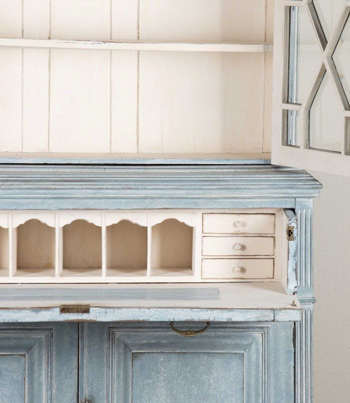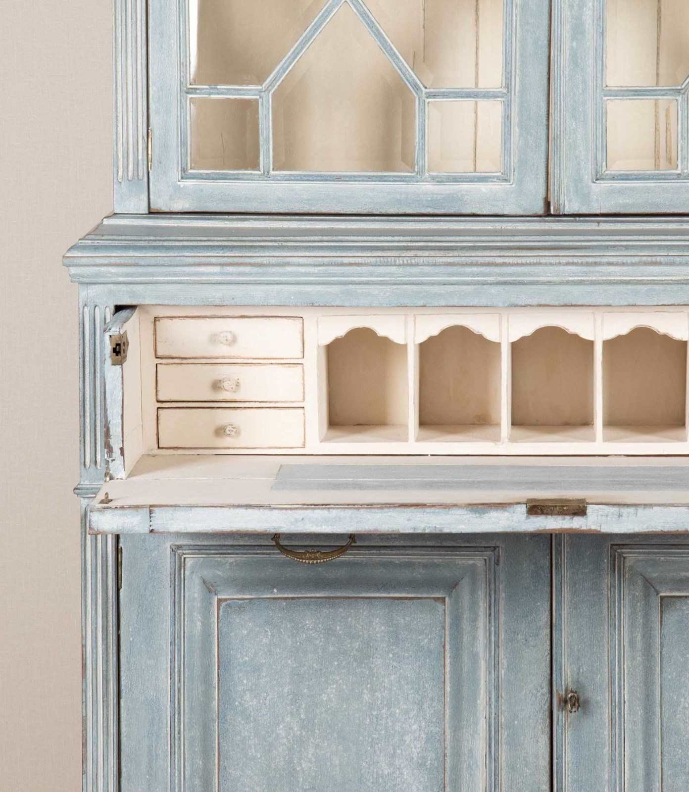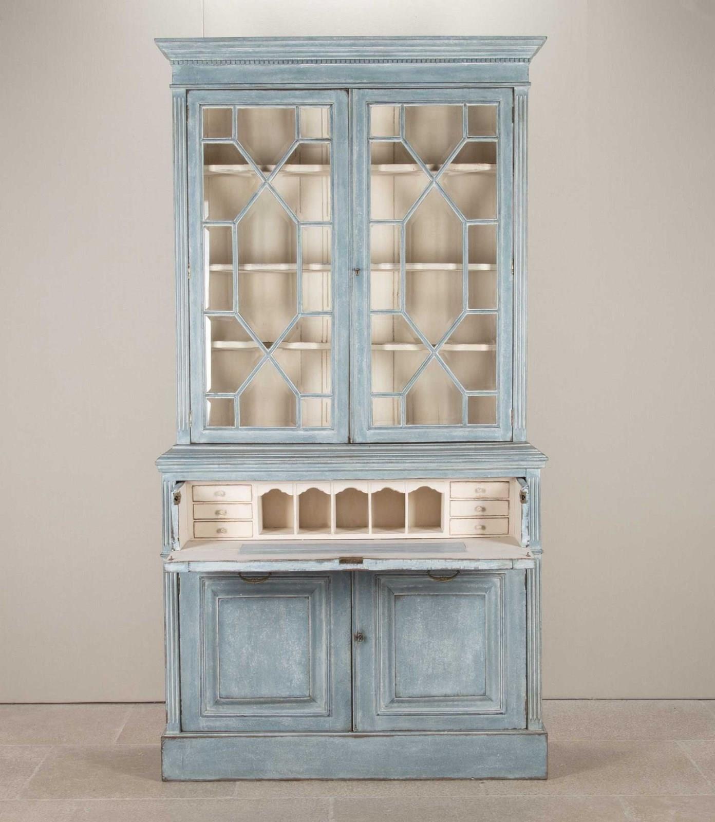 Early 20th Century English painted bookcase secretaire with later paint and bevelled glass. Circa 1910. Upper interior shelves: 8.5" (21.5cm) Height to the underside of desk: 28.5" (72.5cm).