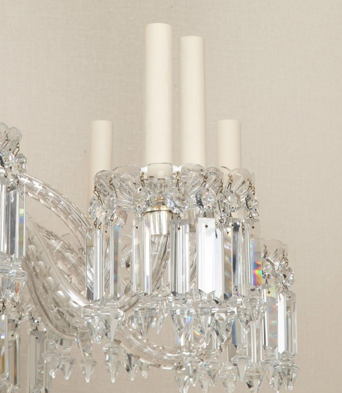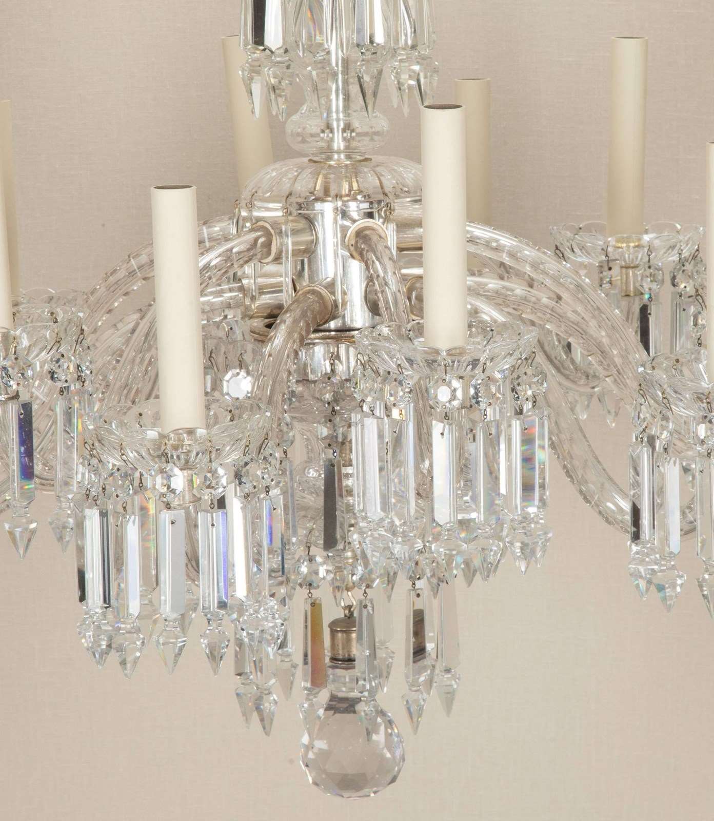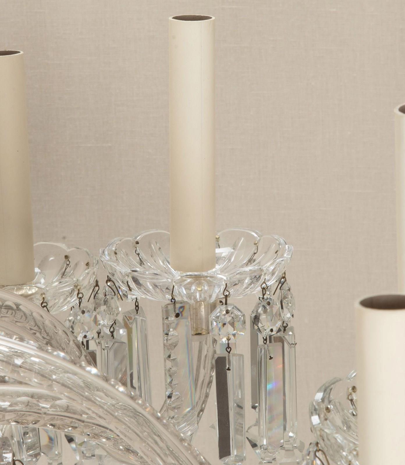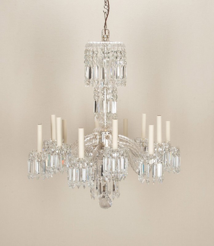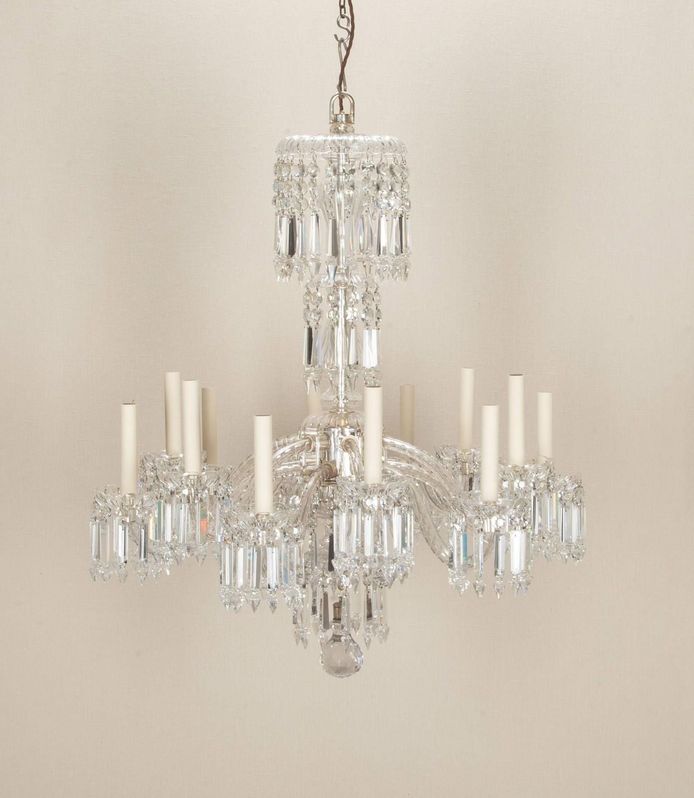 Fine quality Early 20th Century English twelve branch chandelier. Silver plated with beautifully cut scroll arms and tiers of clear crystal Albert drops. Circa 1910. Fully rewired and PAT tested to UK standards for 12 x E14 lamps.