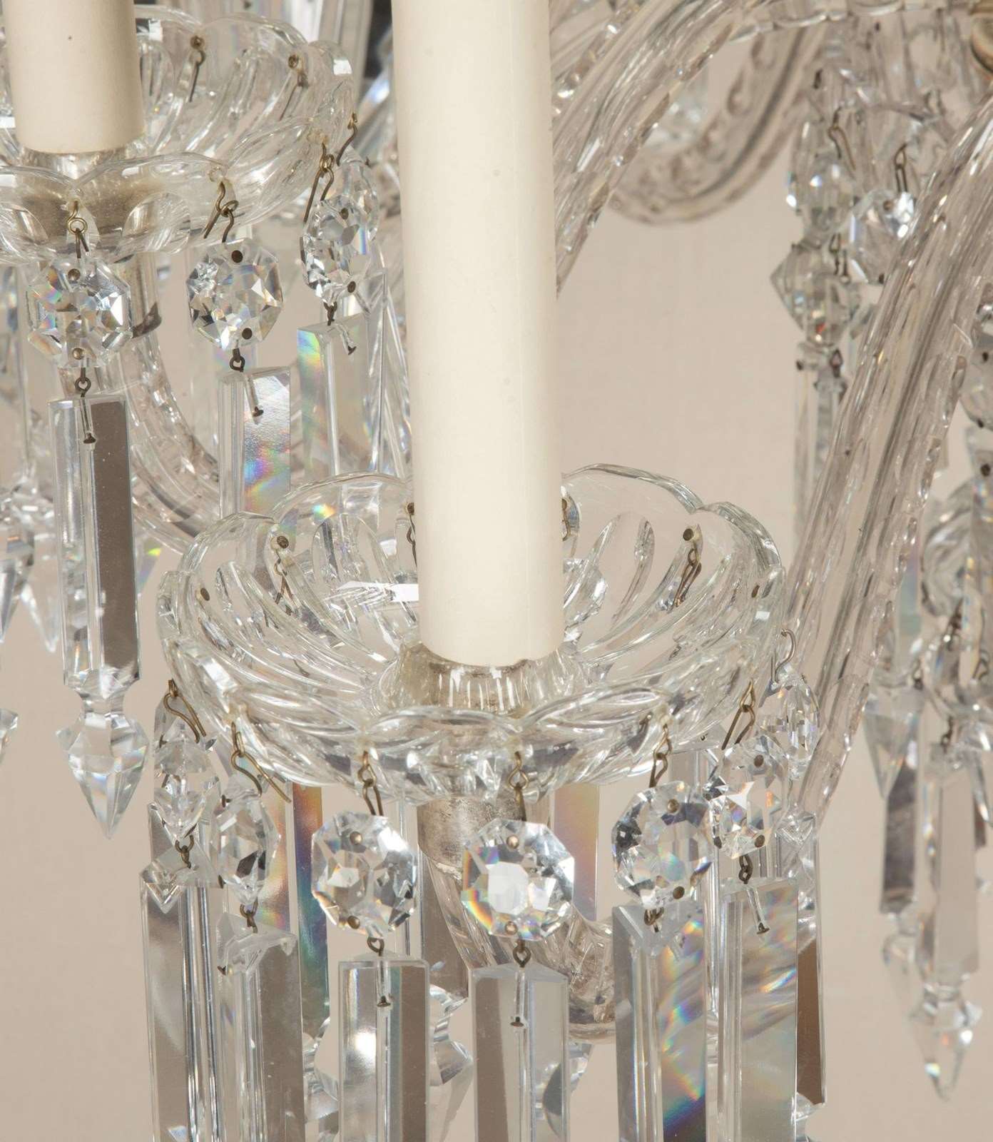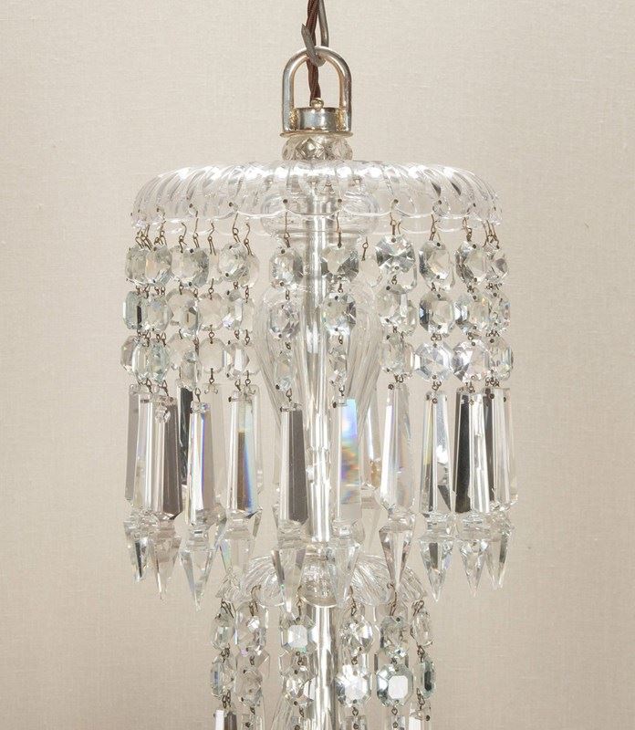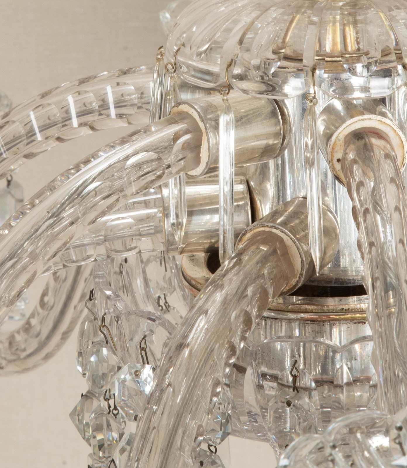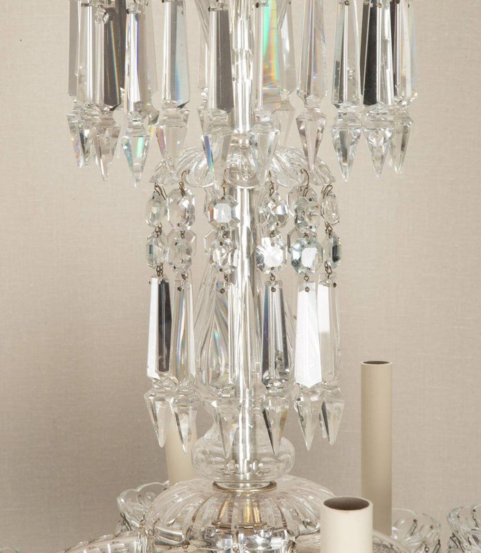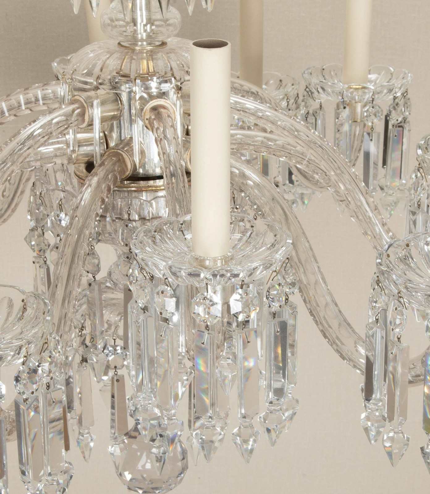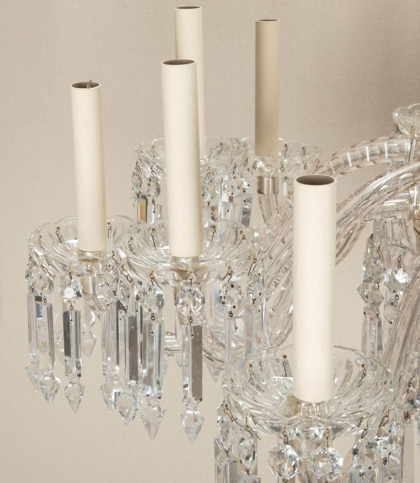 Fine quality Early 20th Century English twelve branch chandelier. Silver plated with beautifully cut scroll arms and tiers of clear crystal Albert drops. Circa 1910. Fully rewired and PAT tested to UK standards for 12 x E14 lamps.