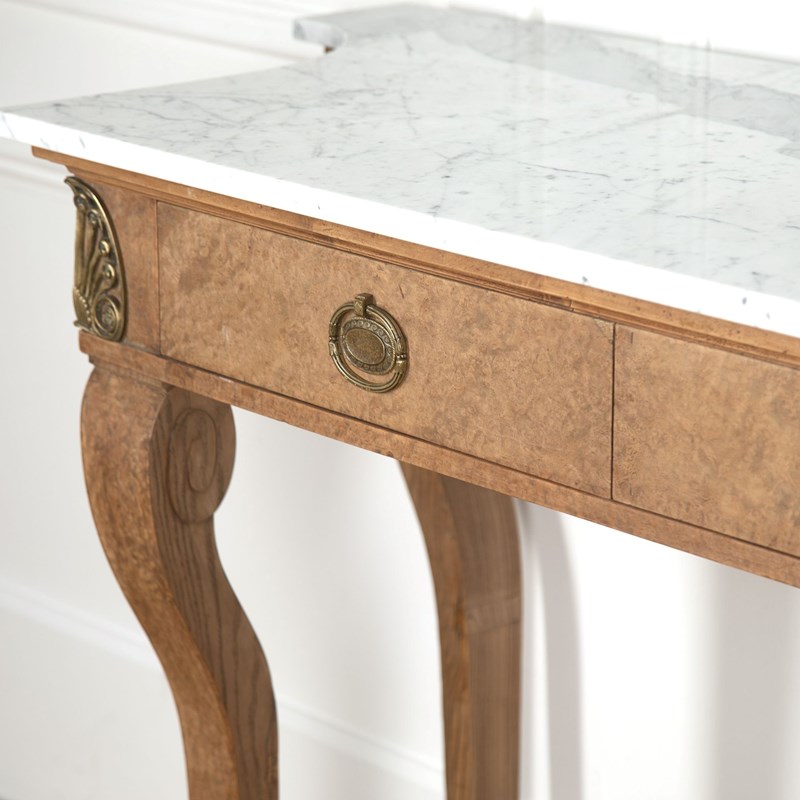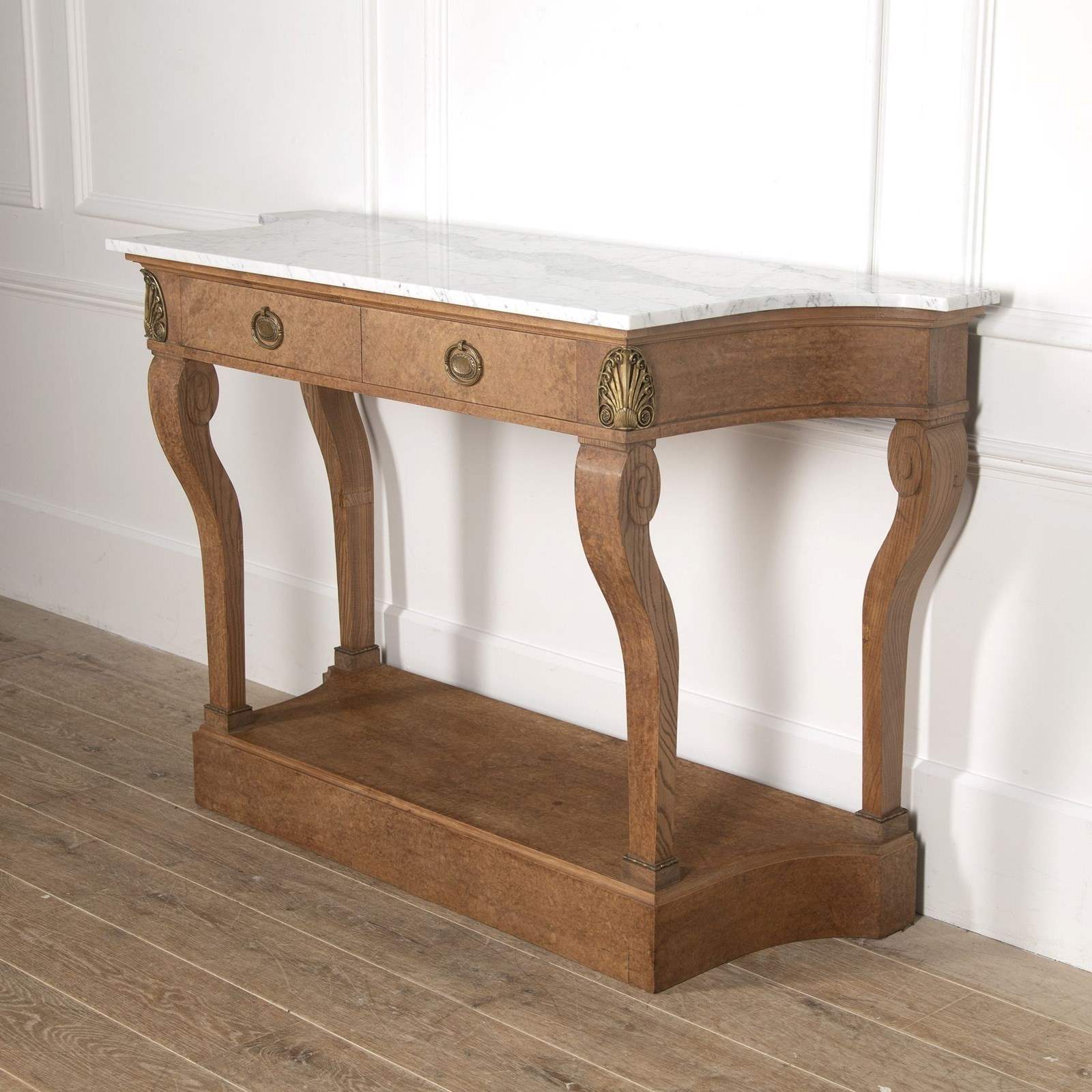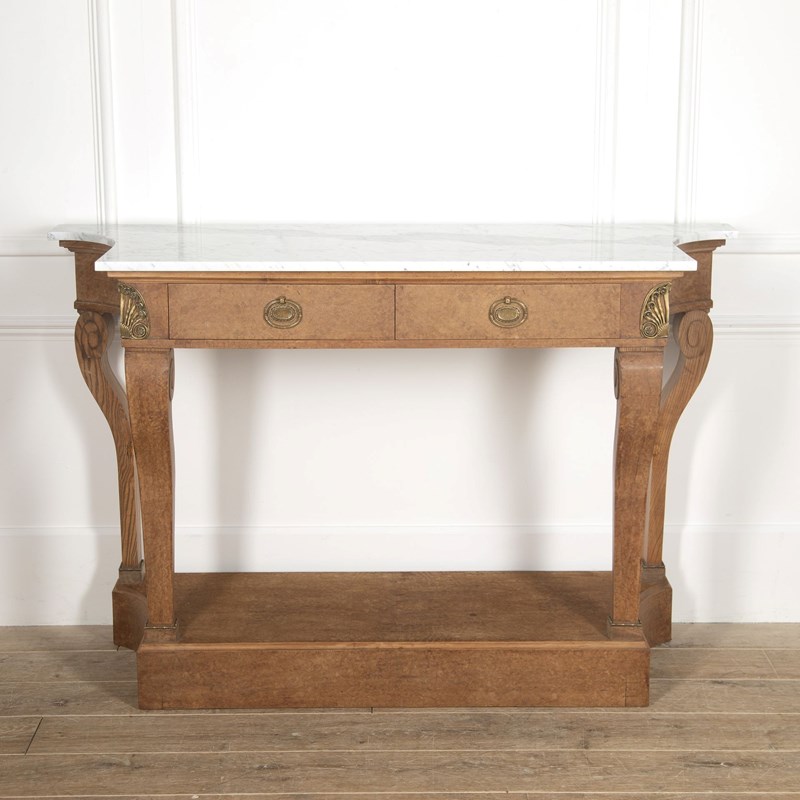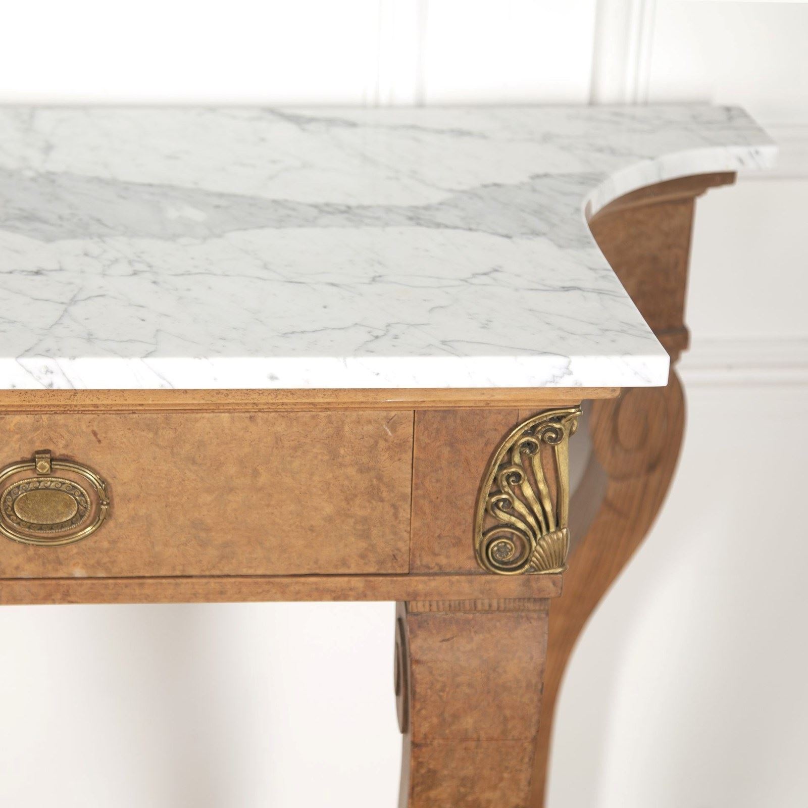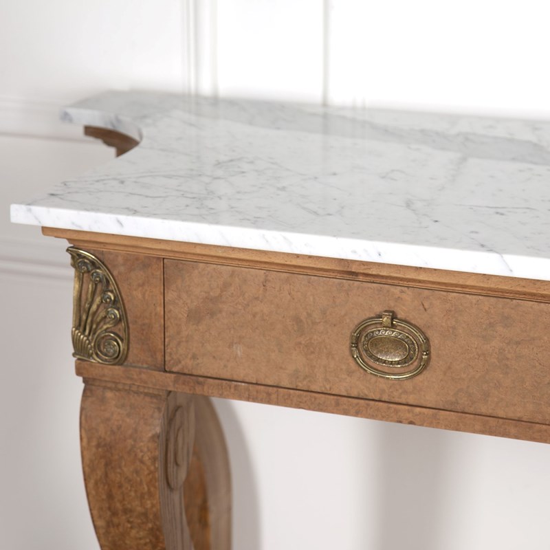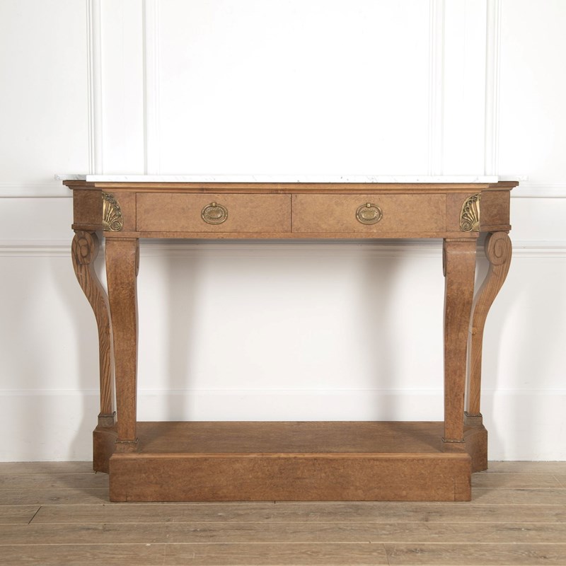 Very elegant early 20th Century French birds-eye maple console table. This pretty console features a shaped white Carrara marble top over two frieze drawers with decorative handles and ormolu mounts to either side. Supported on tapering front supports and pronounced scroll back supports. All terminating on a plinth base. With a beautiful mellow colour throughout, this will be a supremely elegant addition to any interior. Circa 1900.