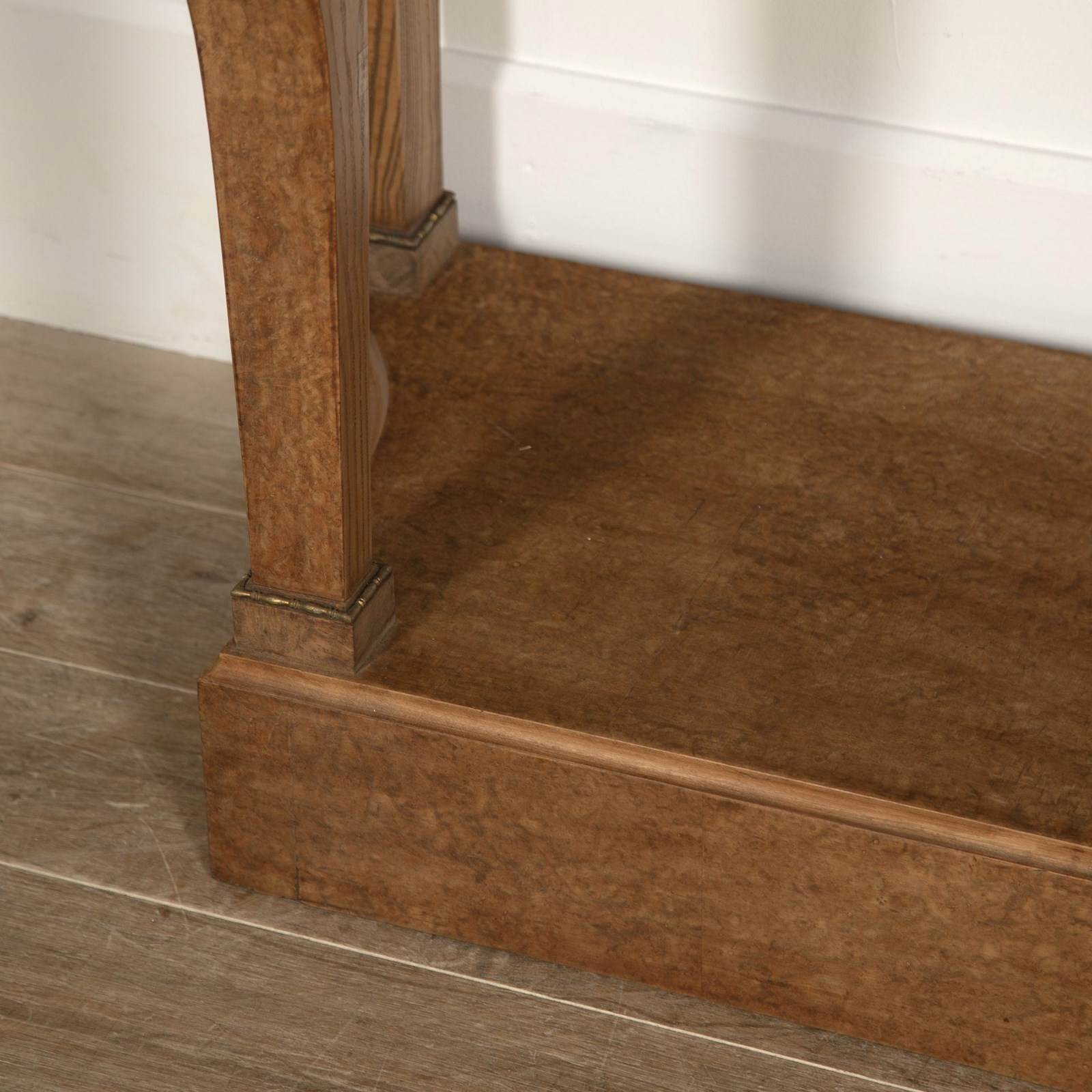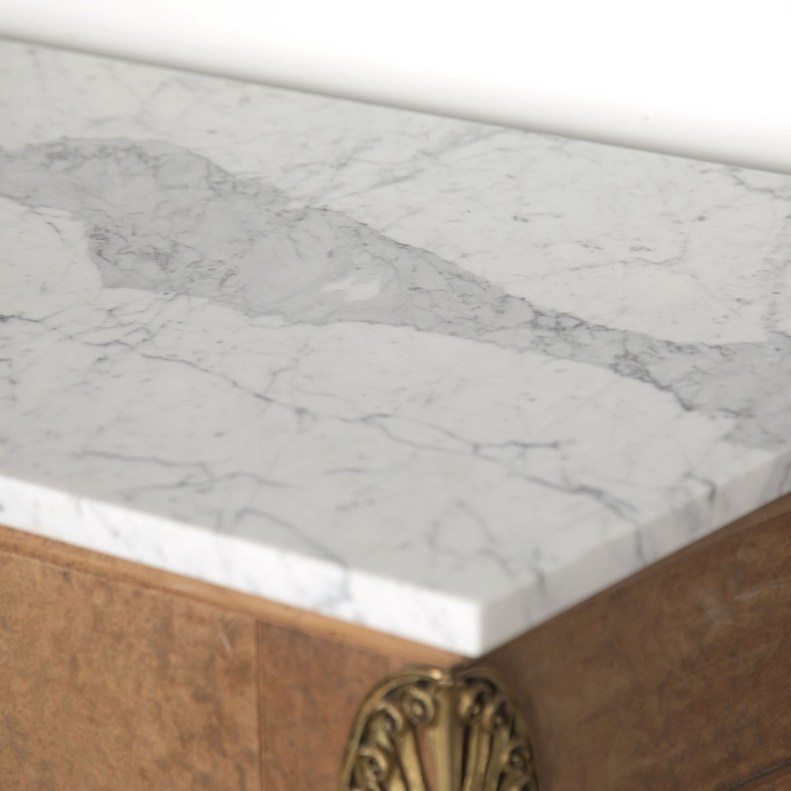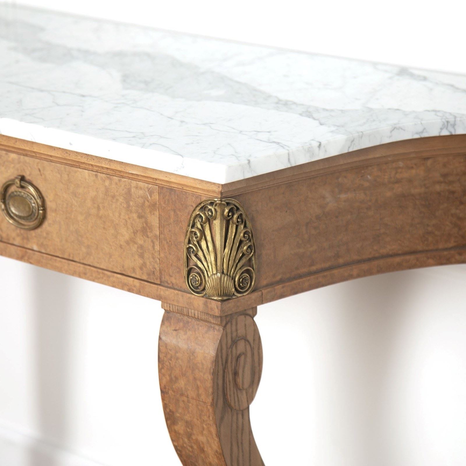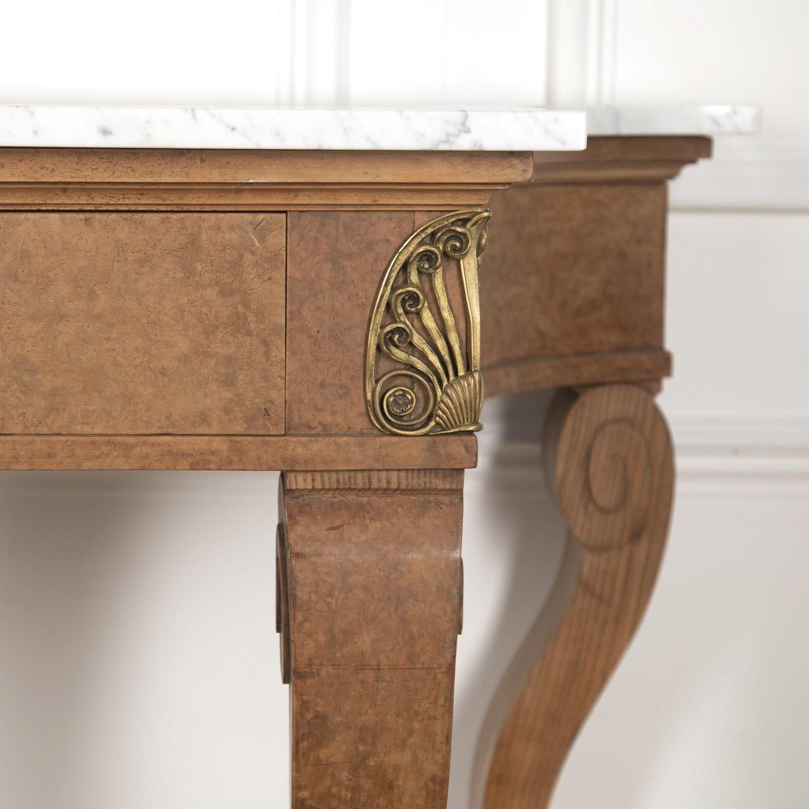 Very elegant early 20th Century French birds-eye maple console table. This pretty console features a shaped white Carrara marble top over two frieze drawers with decorative handles and ormolu mounts to either side. Supported on tapering front supports and pronounced scroll back supports. All terminating on a plinth base. With a beautiful mellow colour throughout, this will be a supremely elegant addition to any interior. Circa 1900.